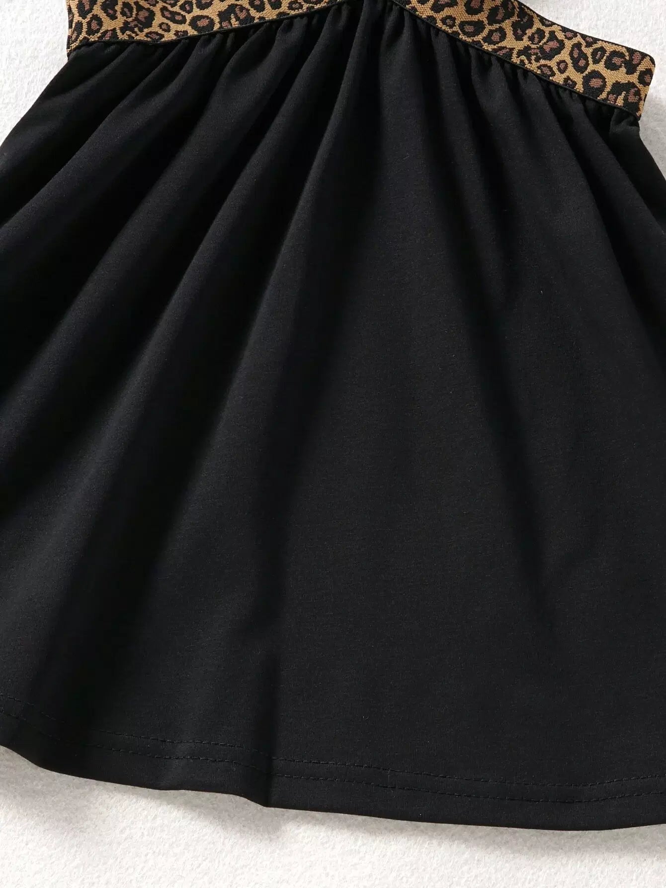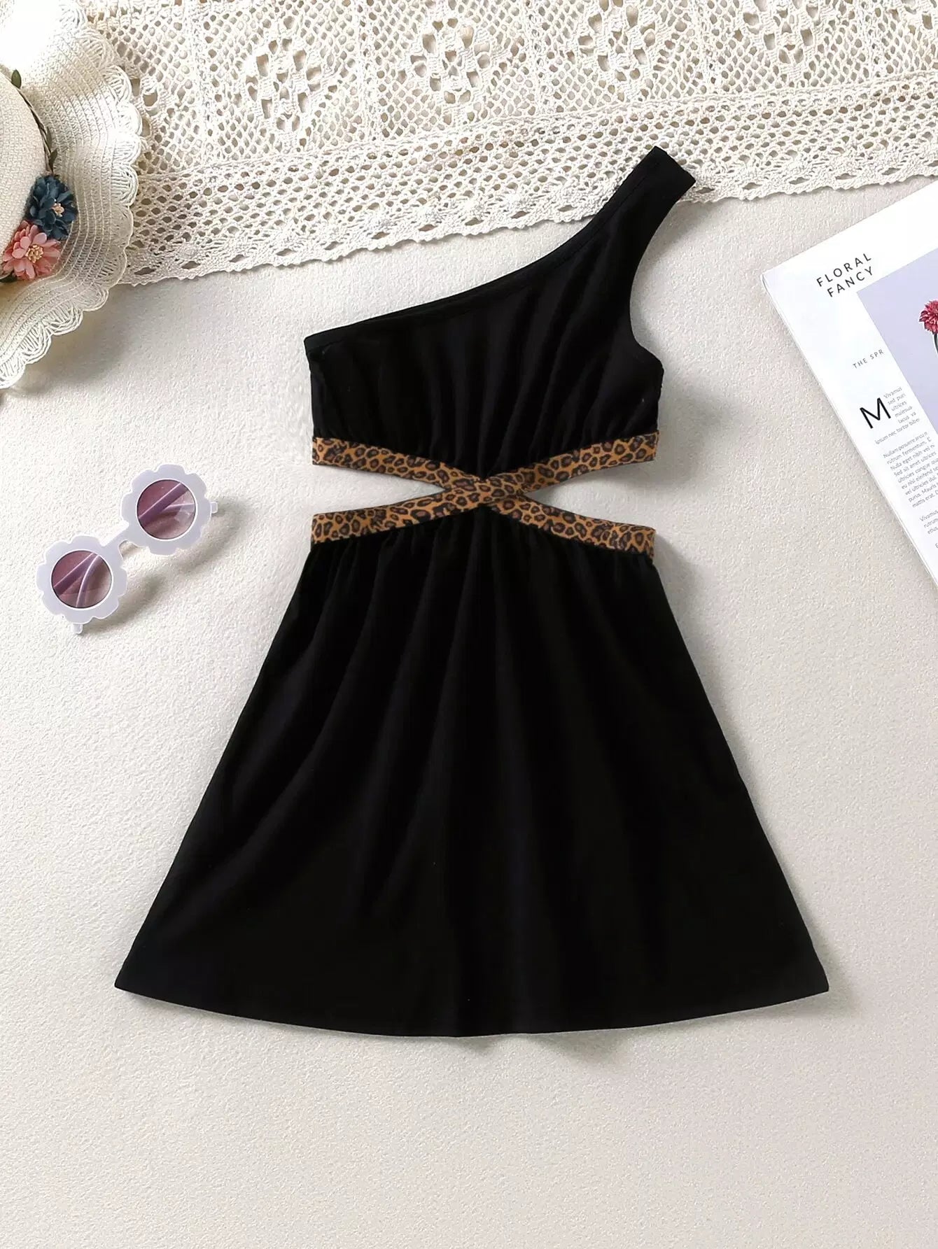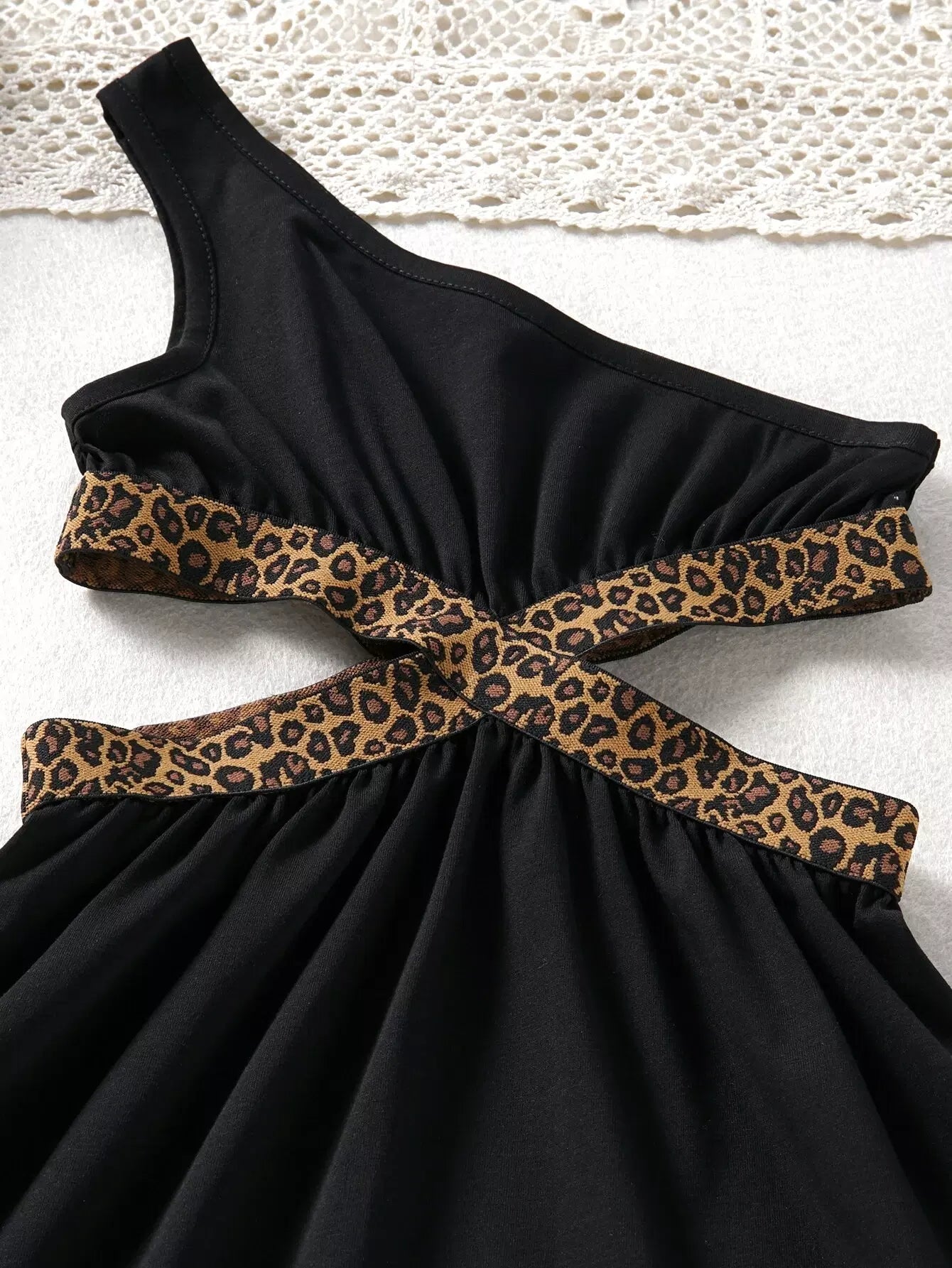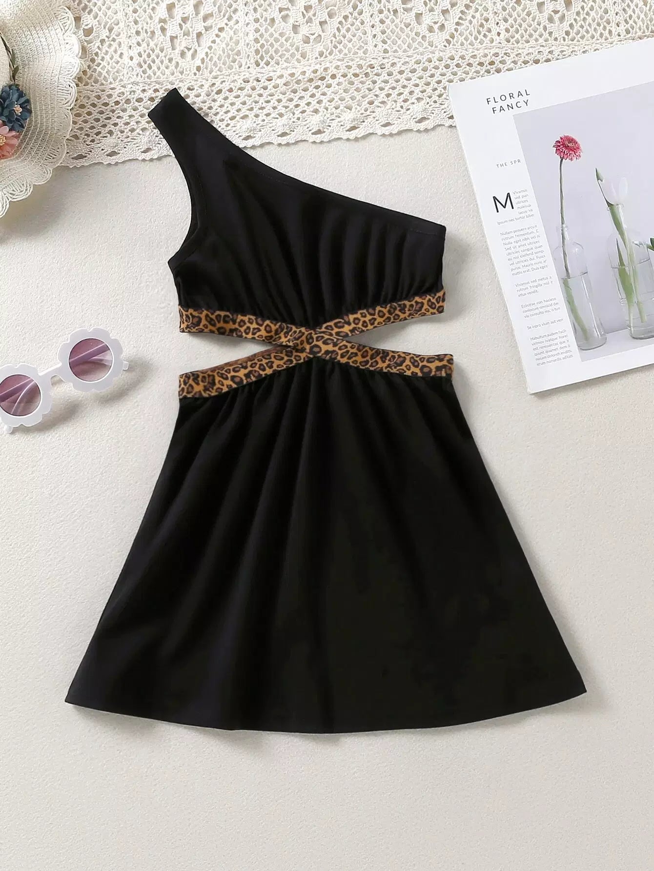 فستان فتيات صغيرات بطبعة جلد النمر بفتحة خصر مقصوصة على كتف واحد