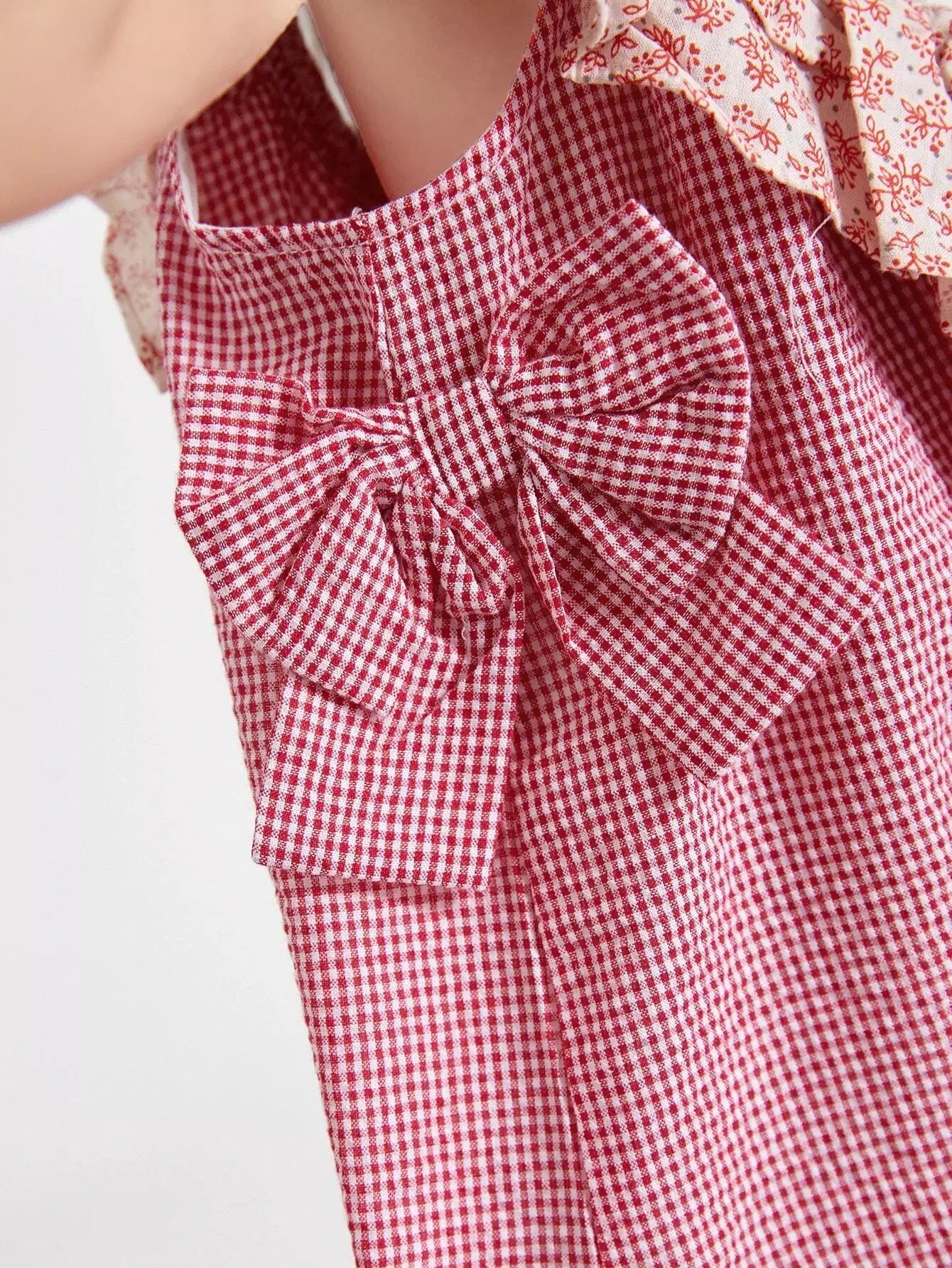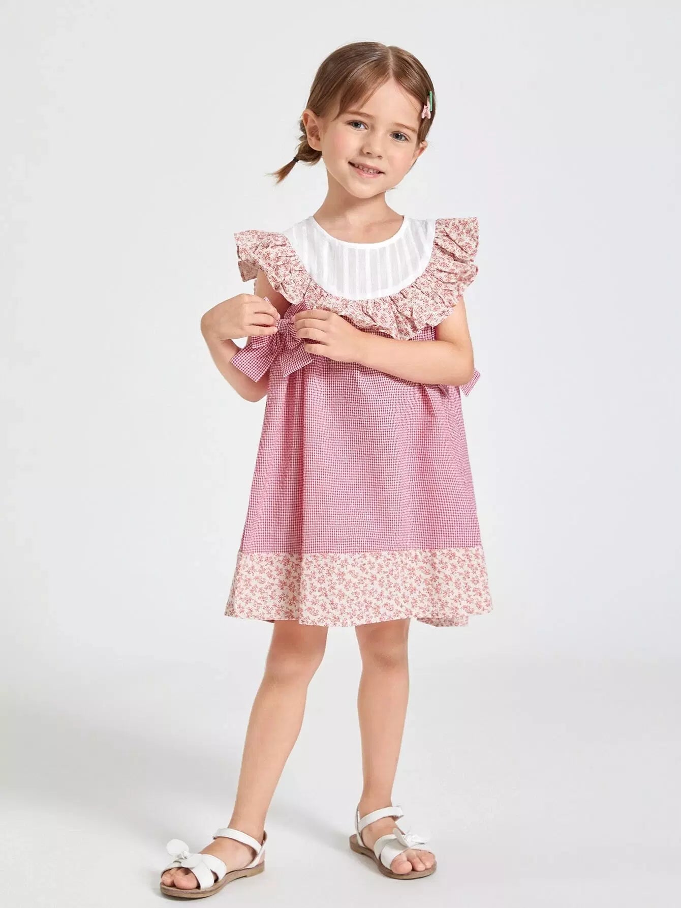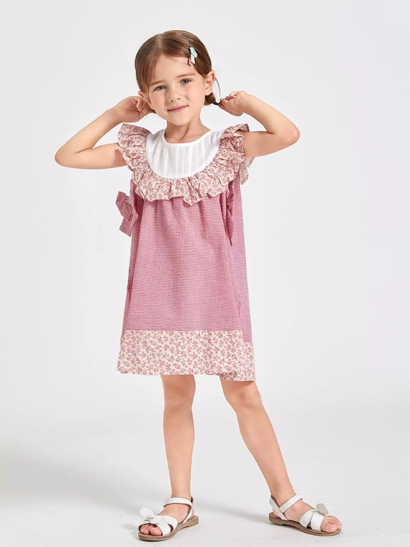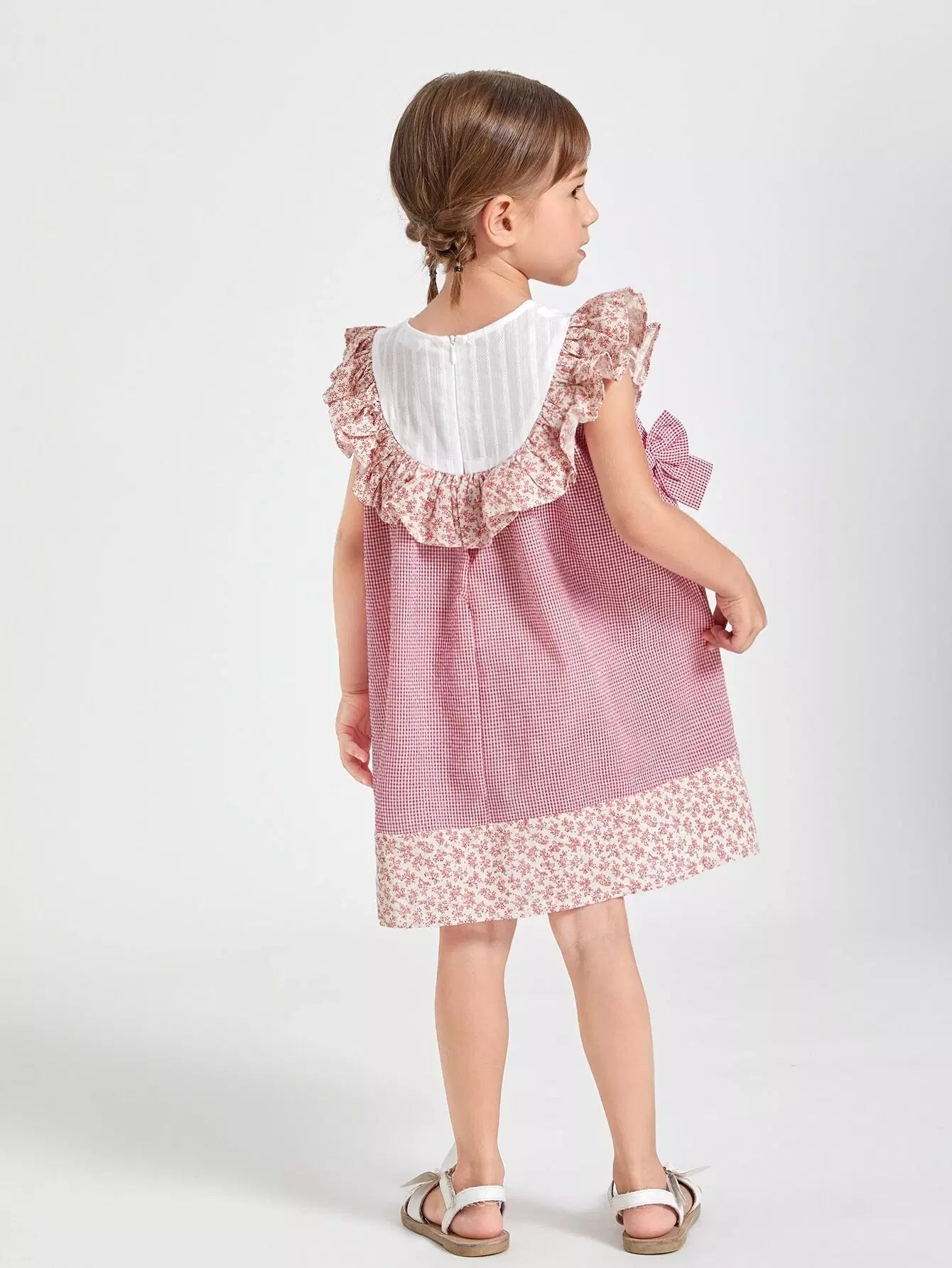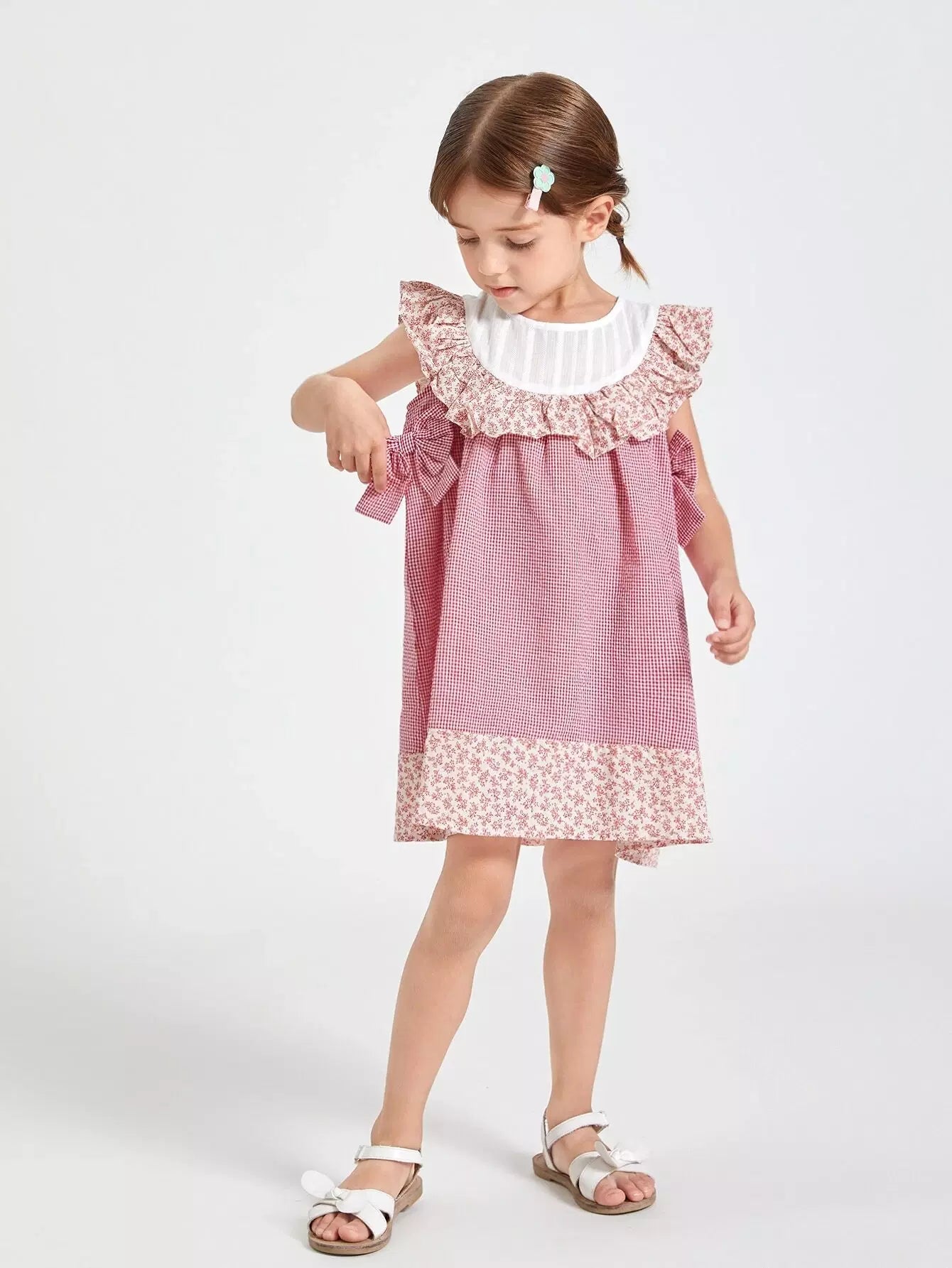 فستان بناتي صغيرات منقوش ومزخرف بطبعة زهور مكشكشة مزين بعقدة جانبية