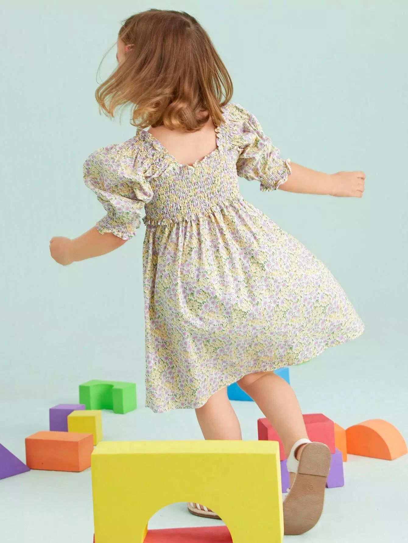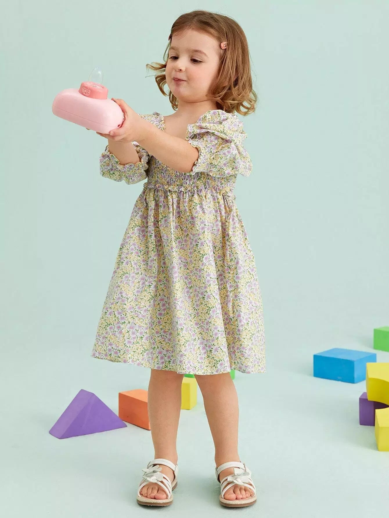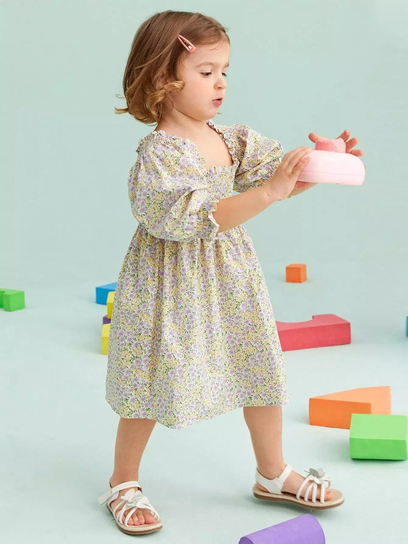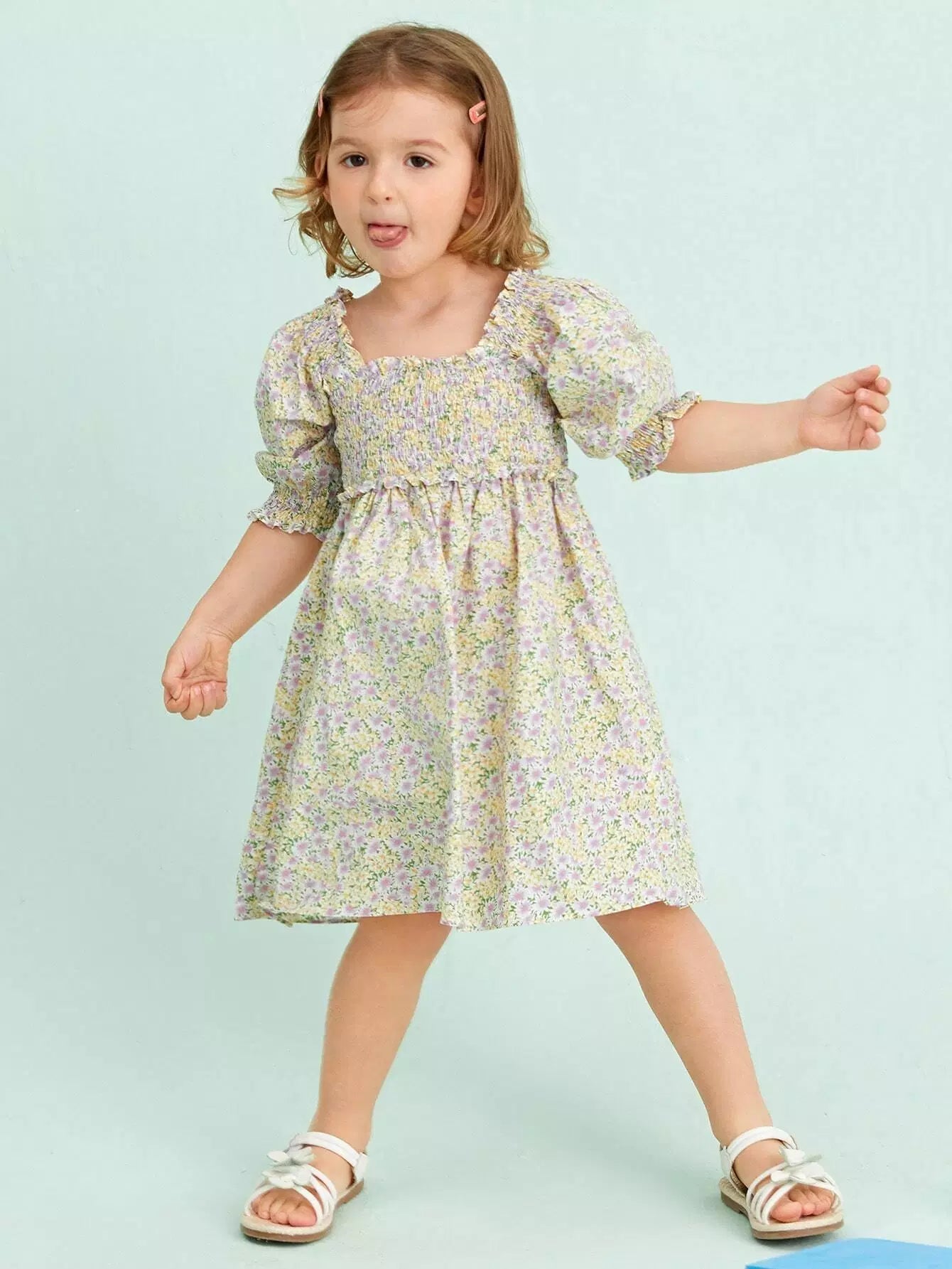 فستان بنات صغيرات بأكمام منفوشة بأكمام منفوشة وخصر مزين بالورود
