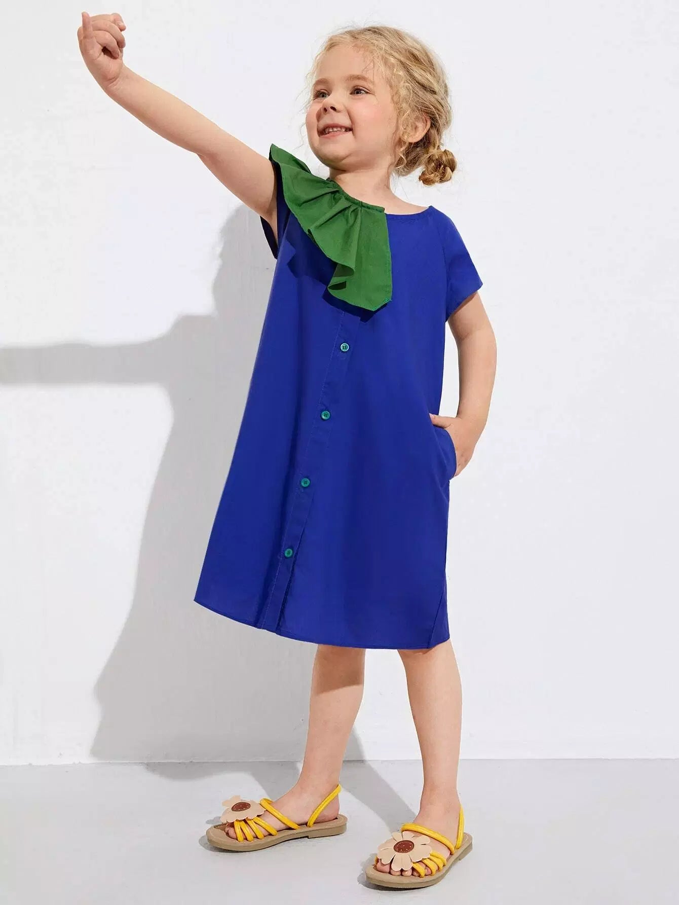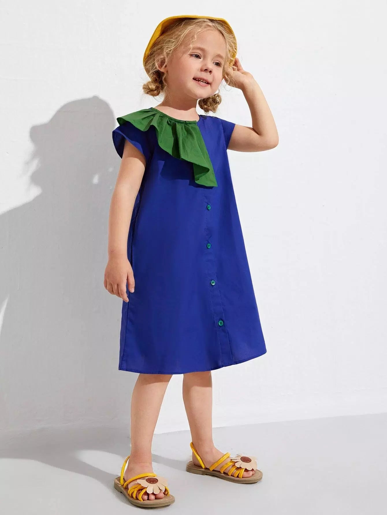 فستان بناتي صغير بأزرار أمامية وحواف مكشكشة