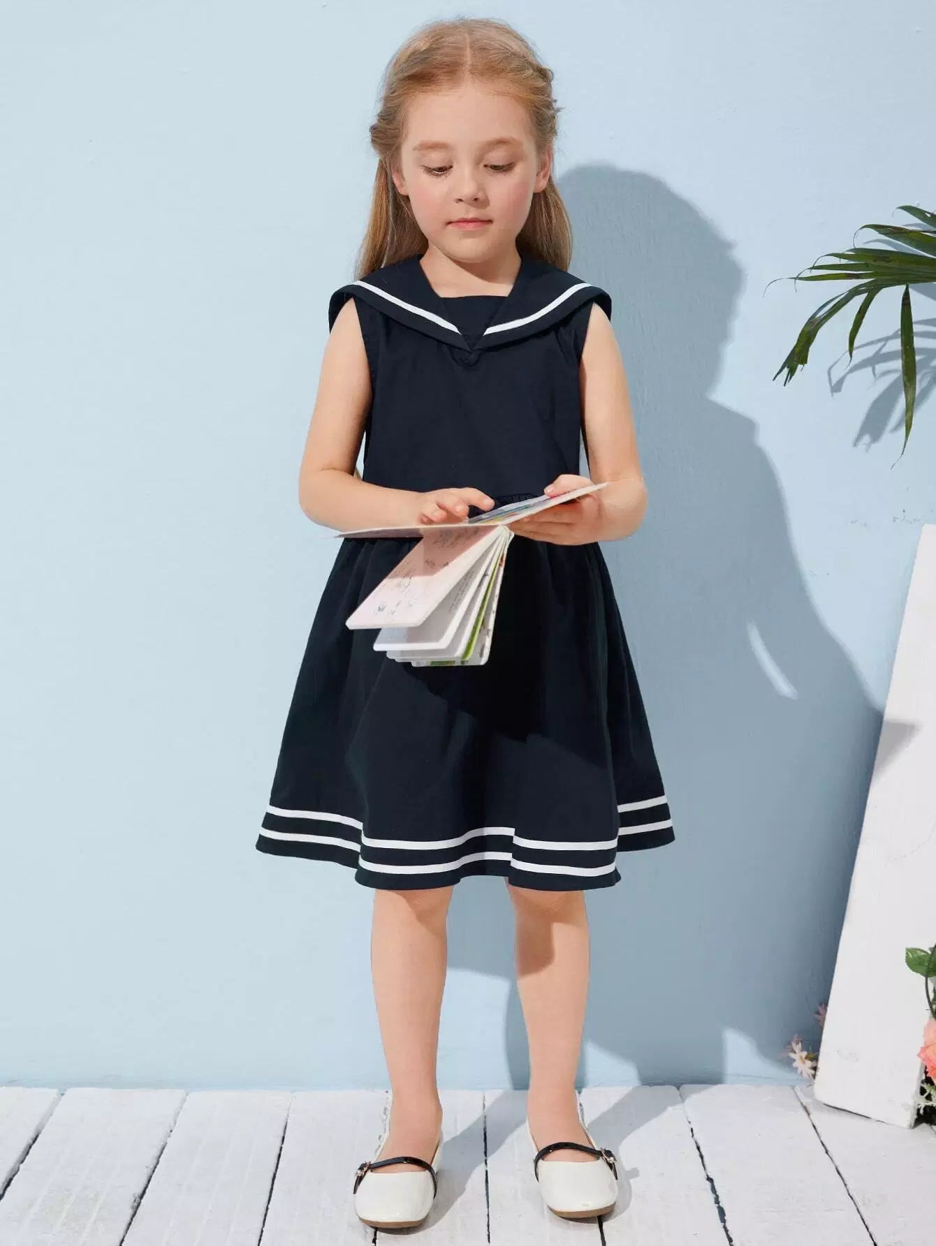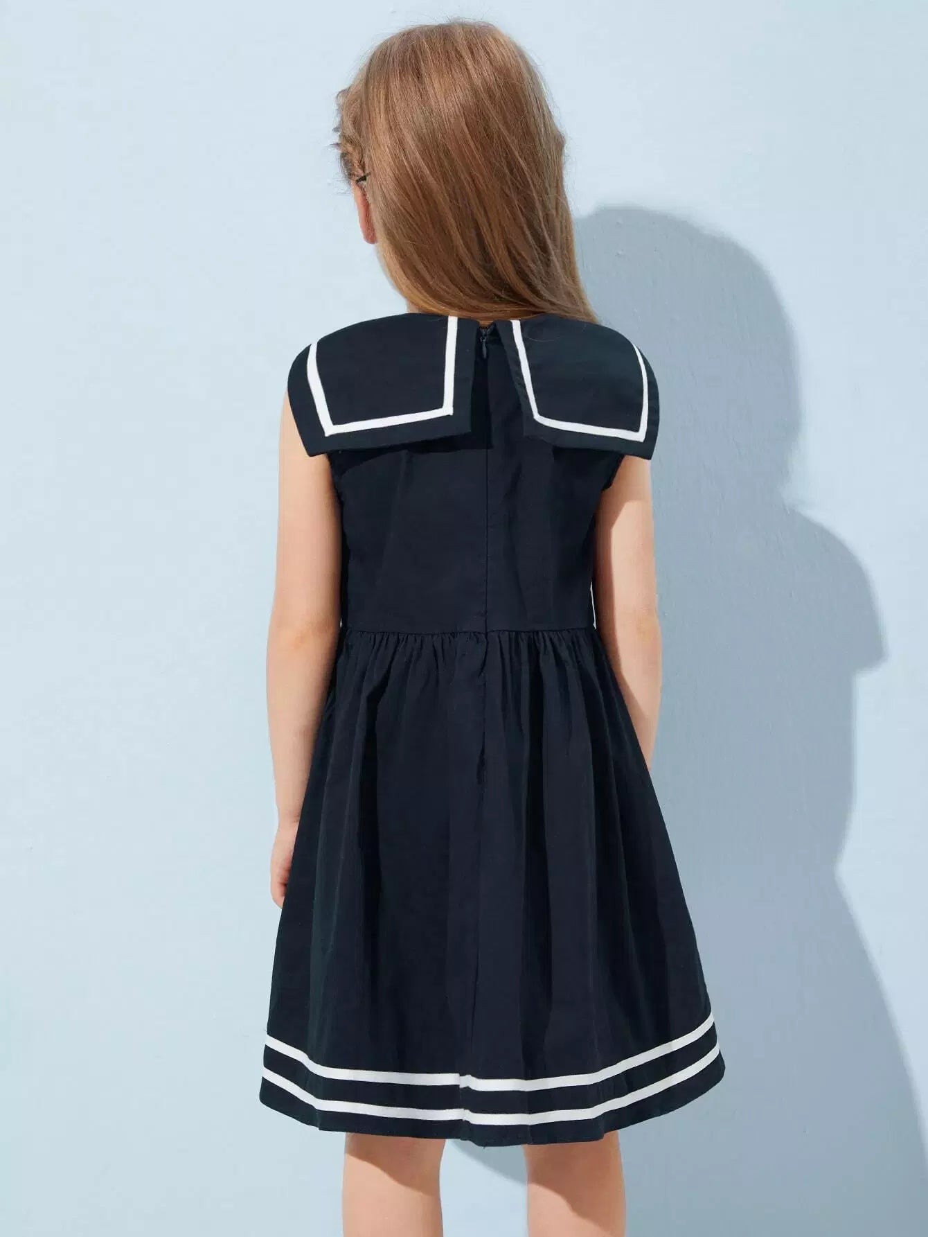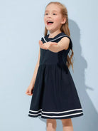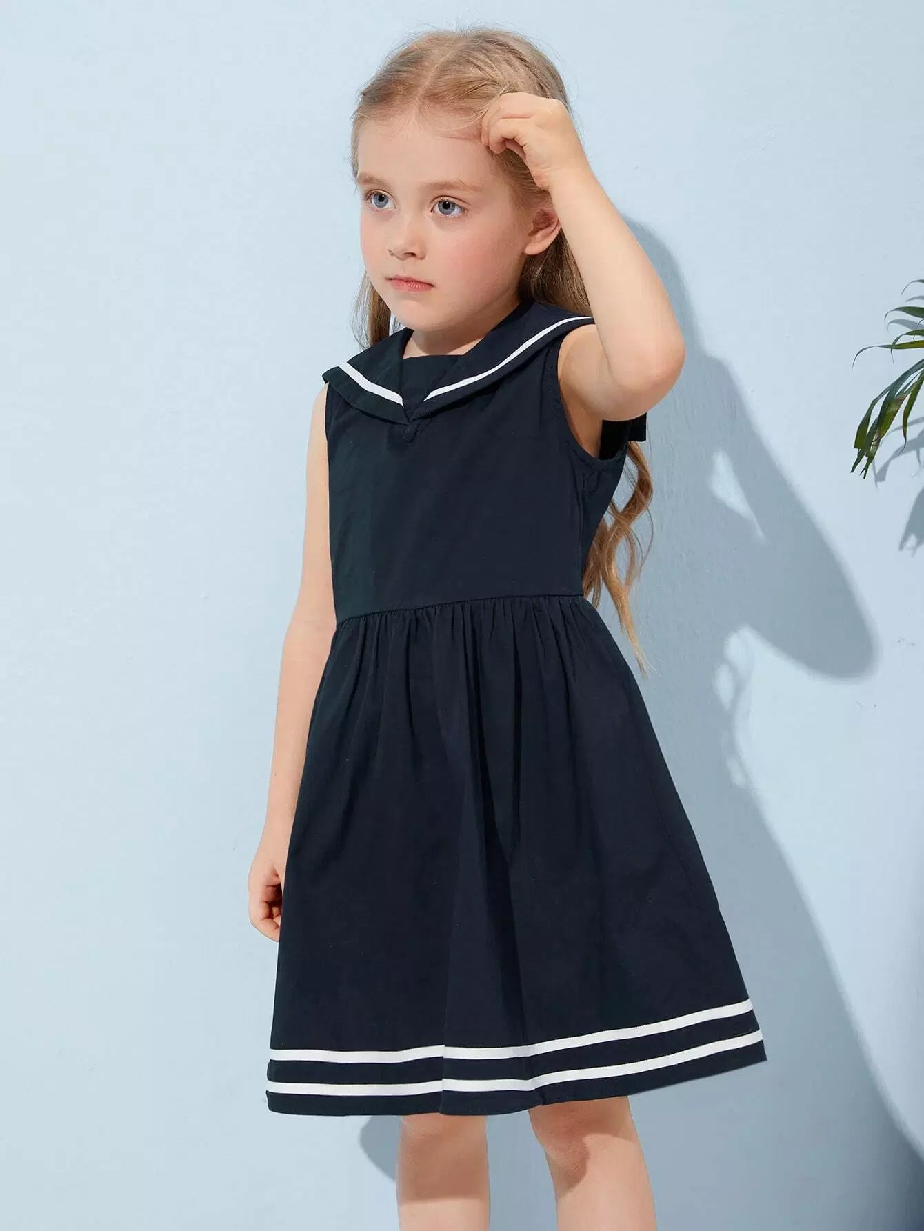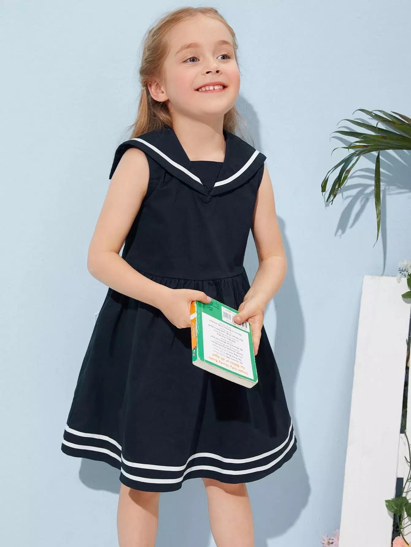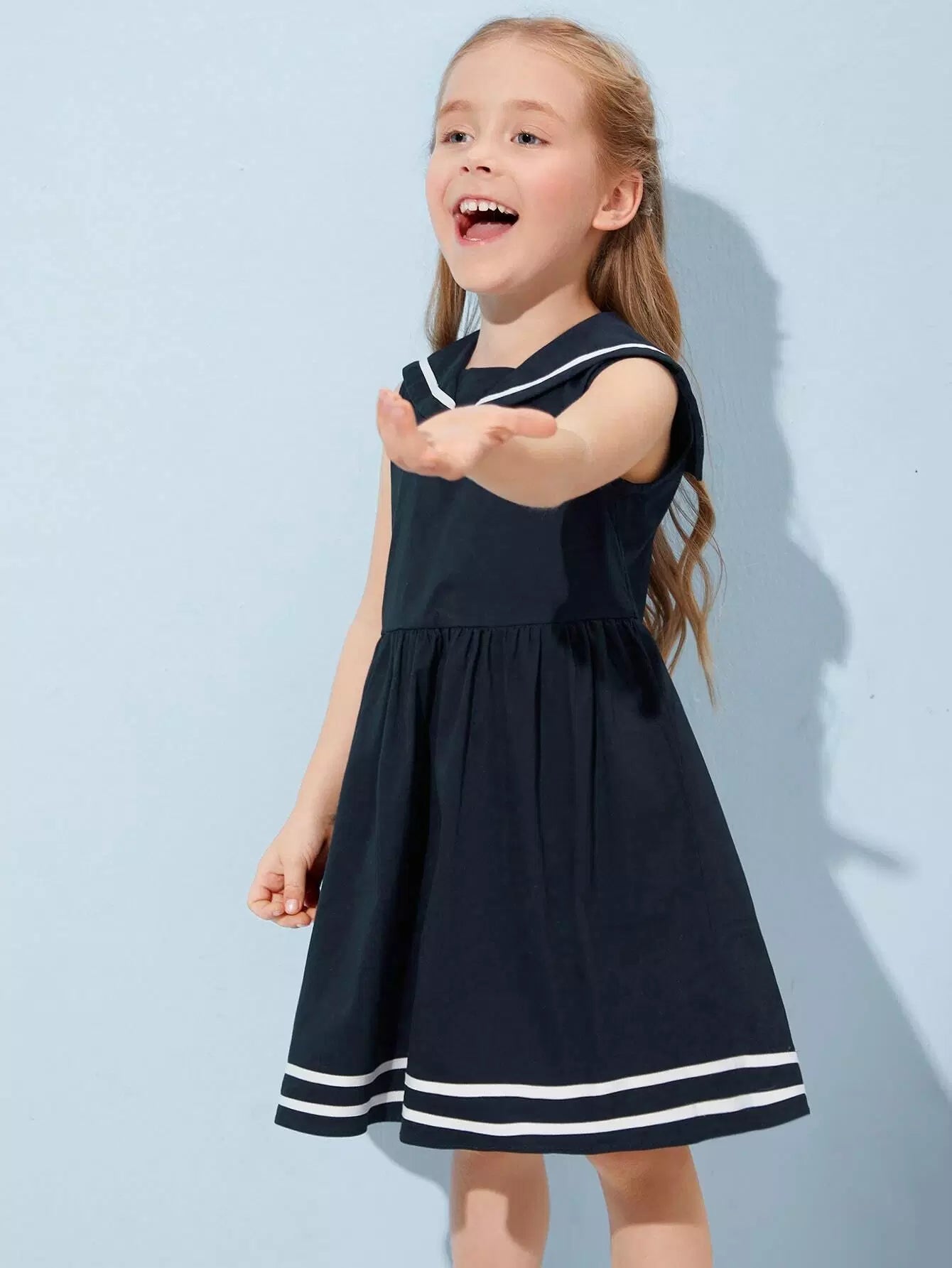 فستان بنات صغيرات بياقة بحار بياقة بحار مخطط بتفاصيل شريطية