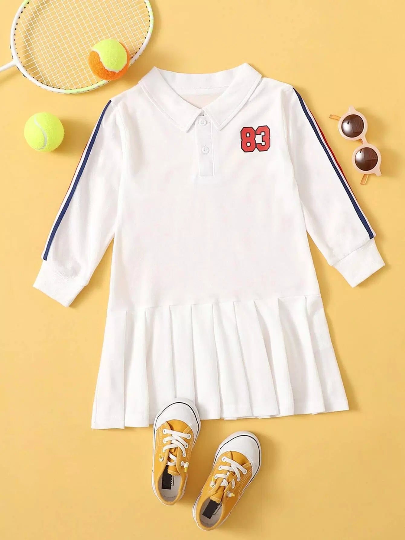 فستان بولو بناتي صغيرات بطيات جانبية مخططة على الجانبين