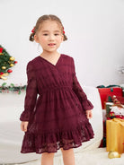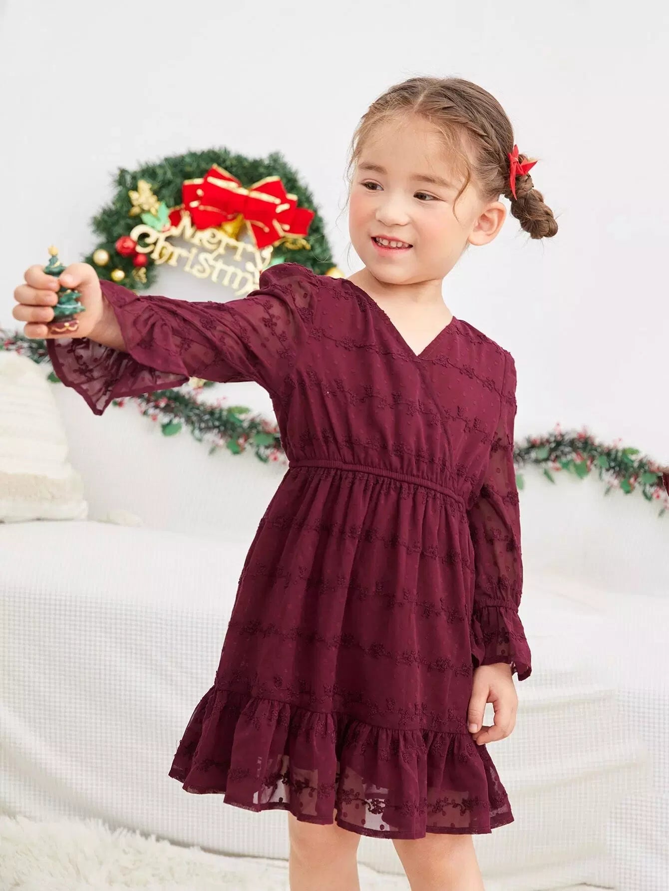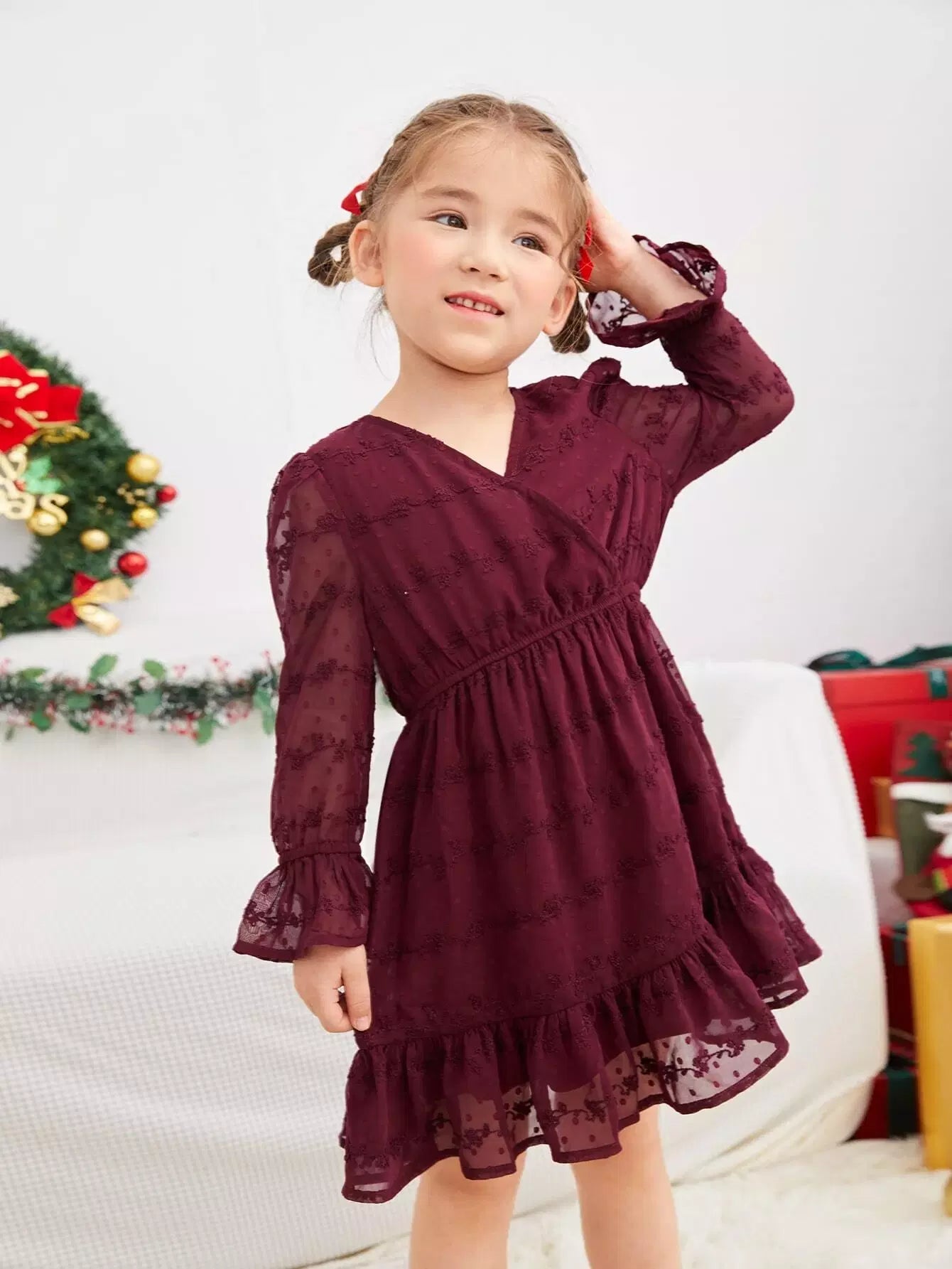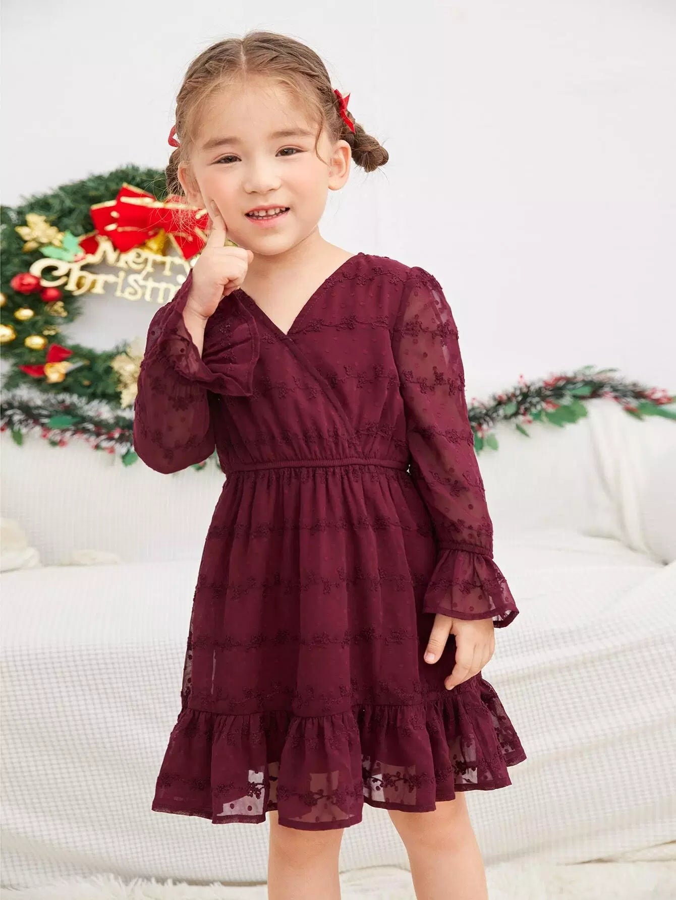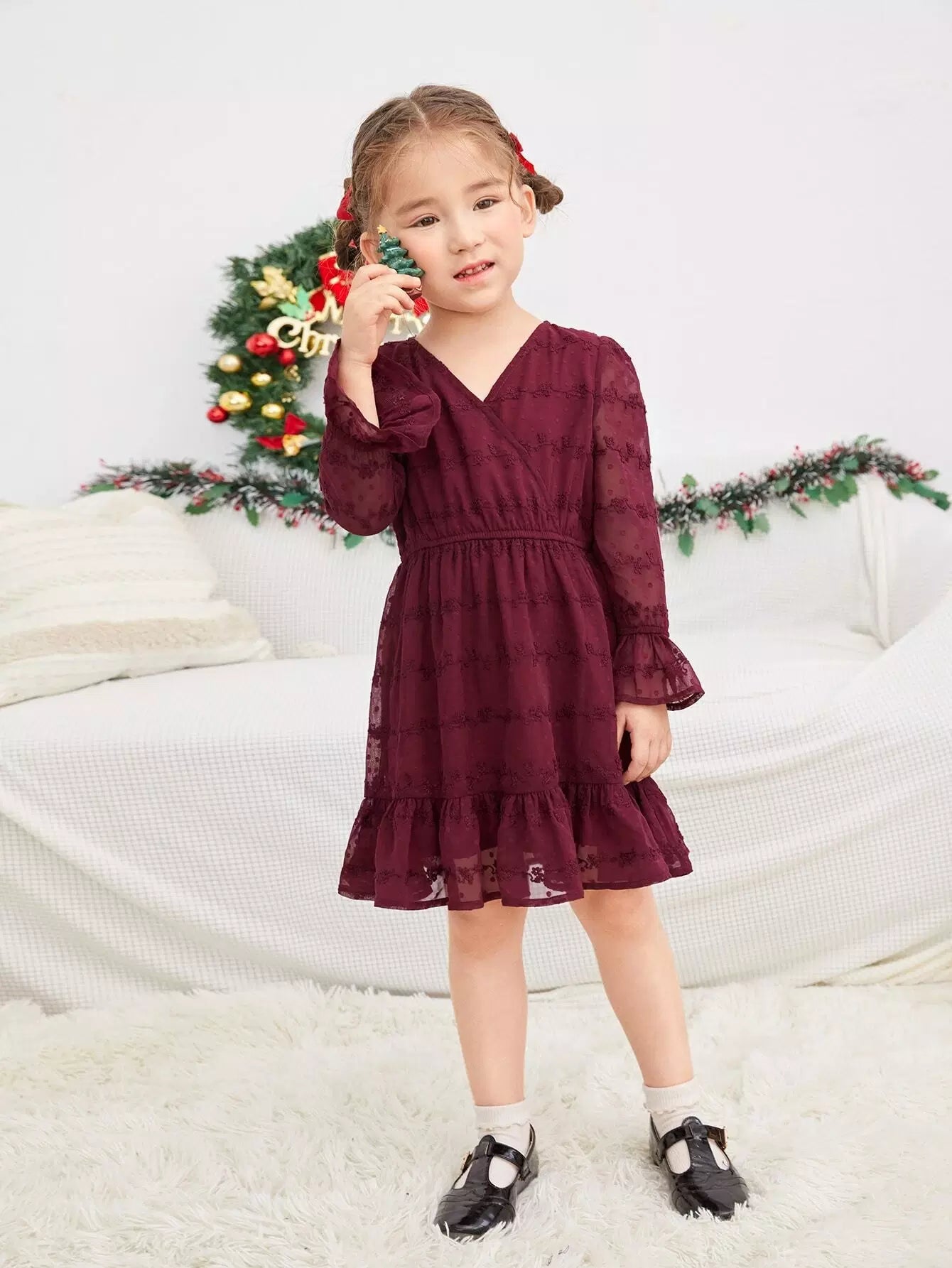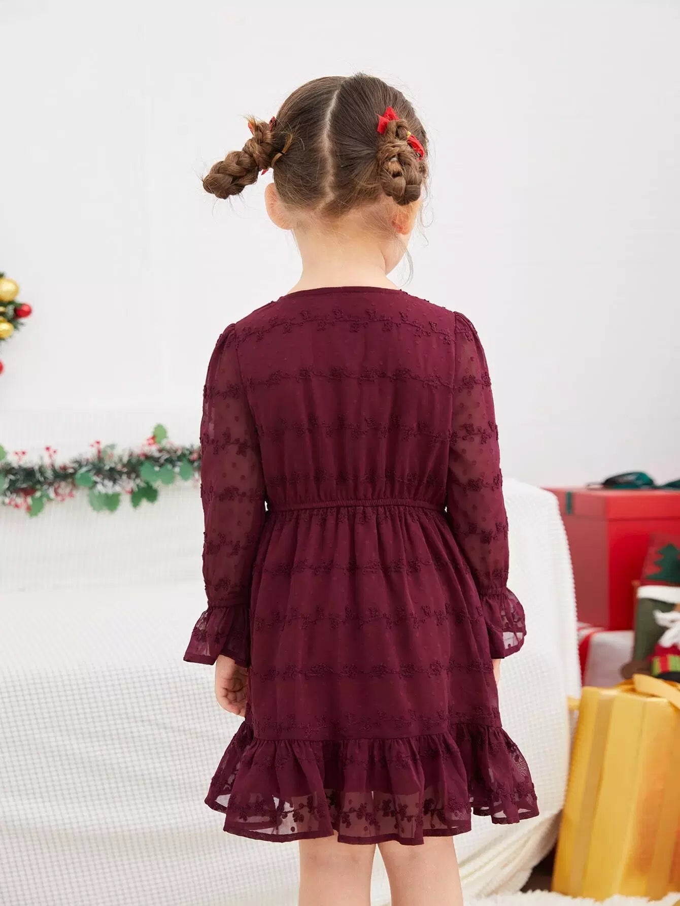 فستان بناتي صغير مزين بنقاط سويسرية وأكمام مكشكشة وحاشية مكشكشة
