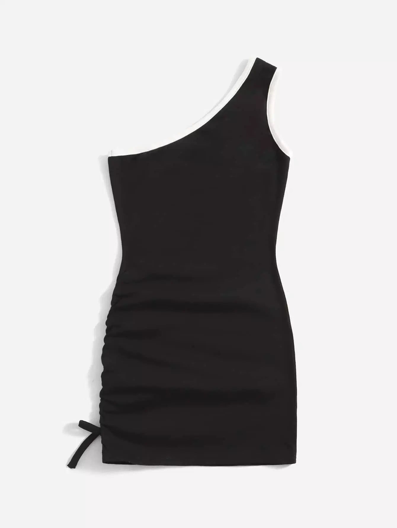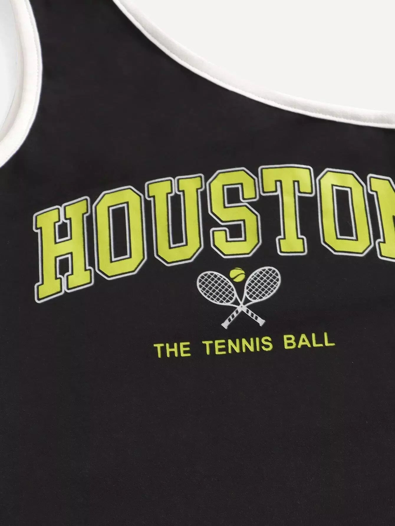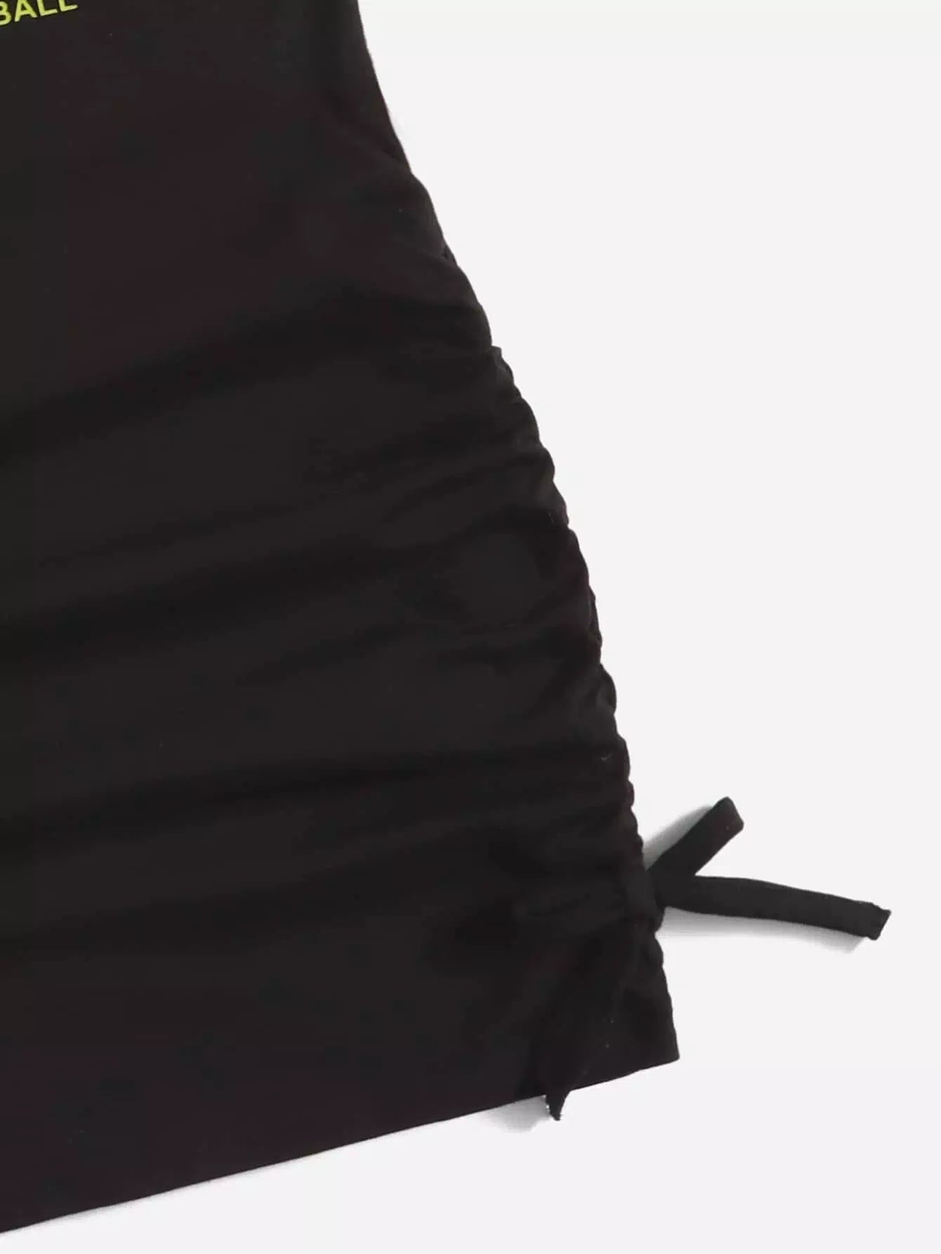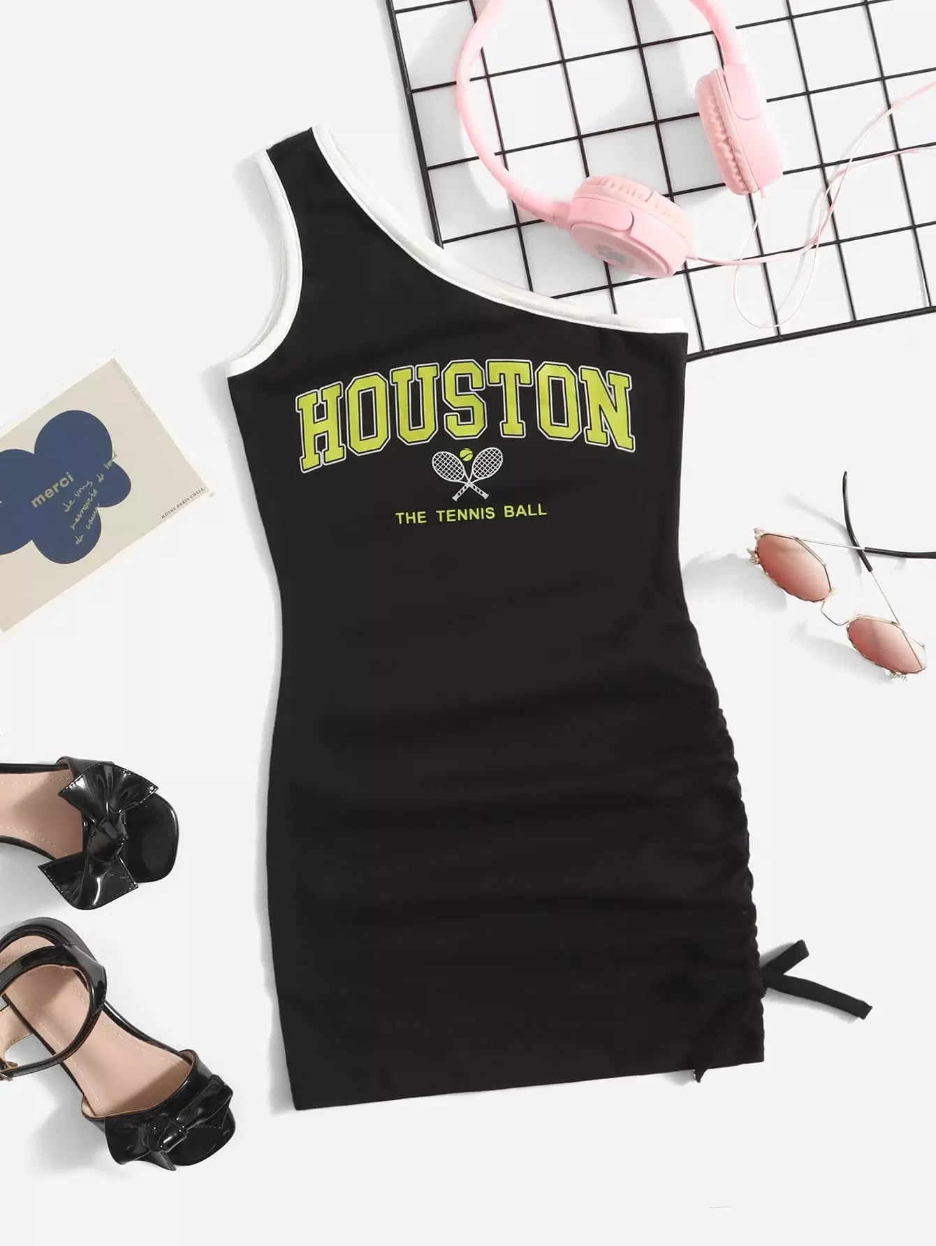 فستان فتيات صغيرات مزين برسومات مضرب تنس ورسومات حروف على كتف واحد وربطة جانبية