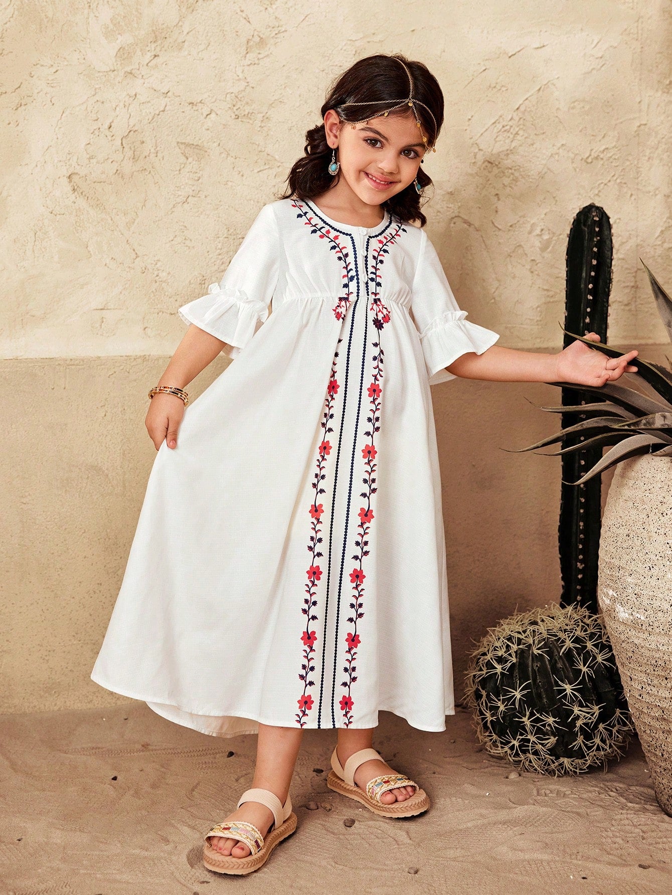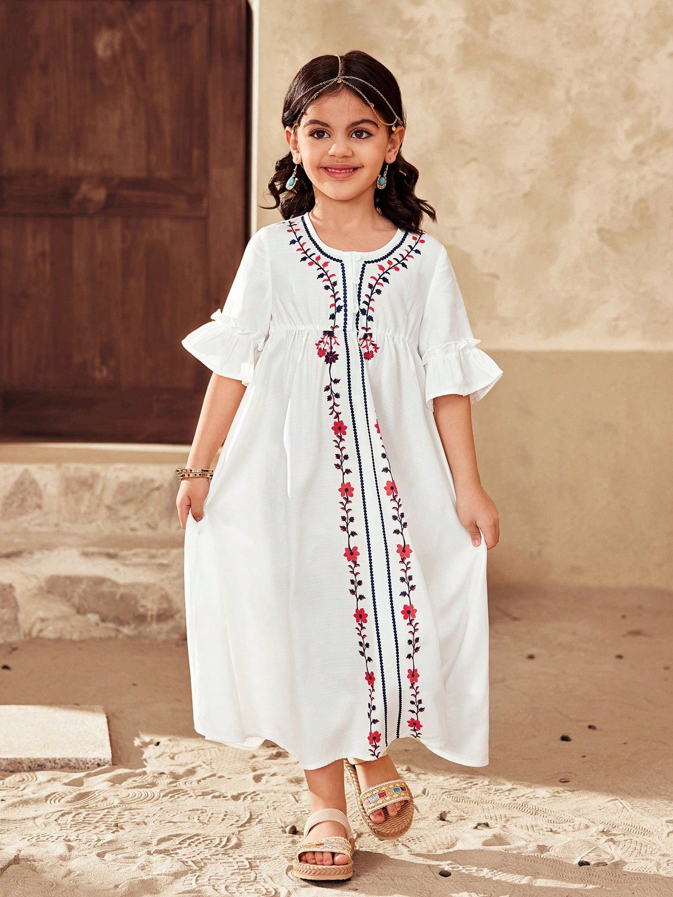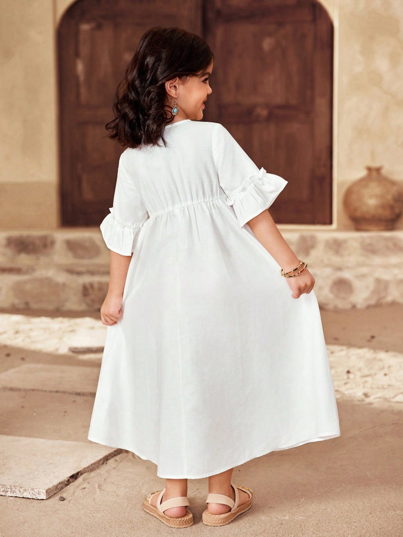 Young Girl Casual Matching Mother-DaughterPositioned Printed White Long Dress,Suitable For Spring And