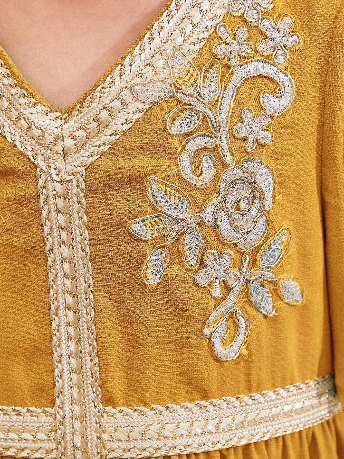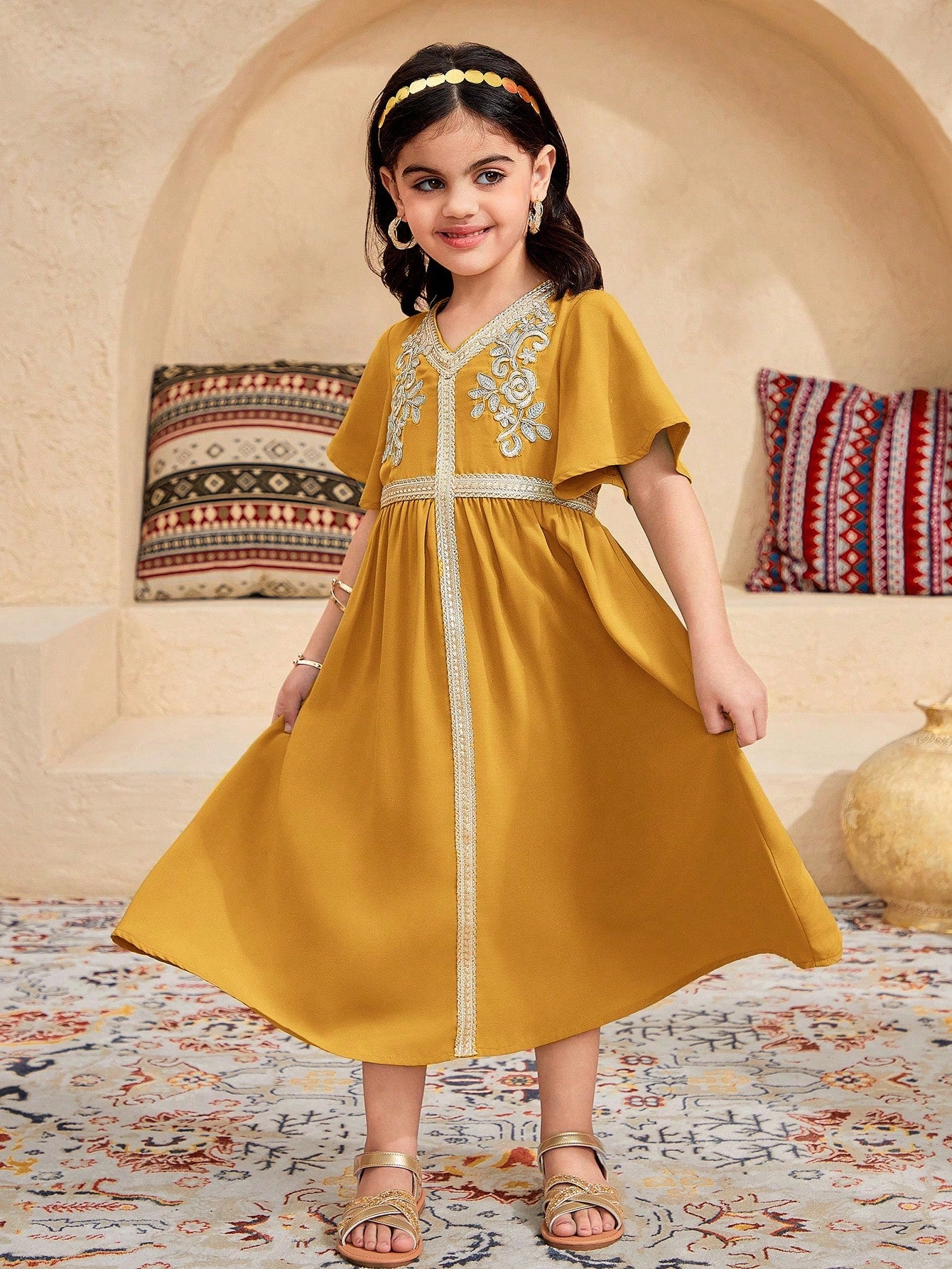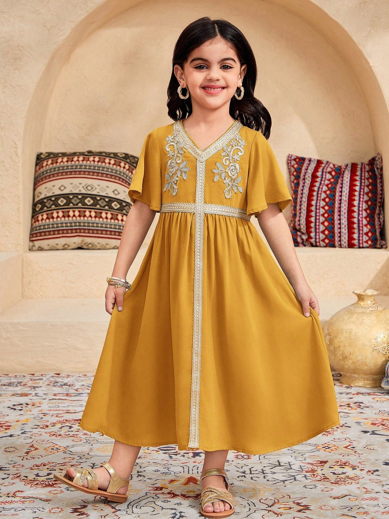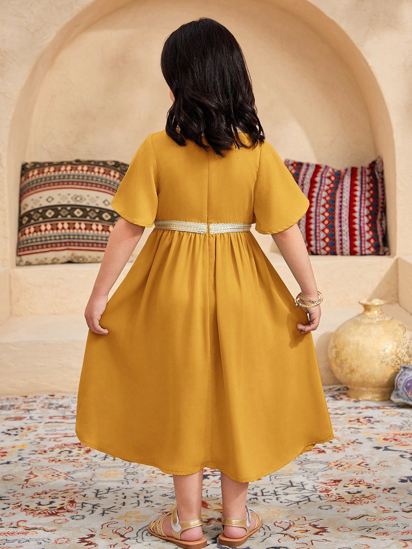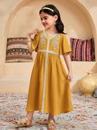 فستان كاجوال ضيق بفتحة رقبة على شكل حرف V باللون الأصفر لفتاة صغيرة