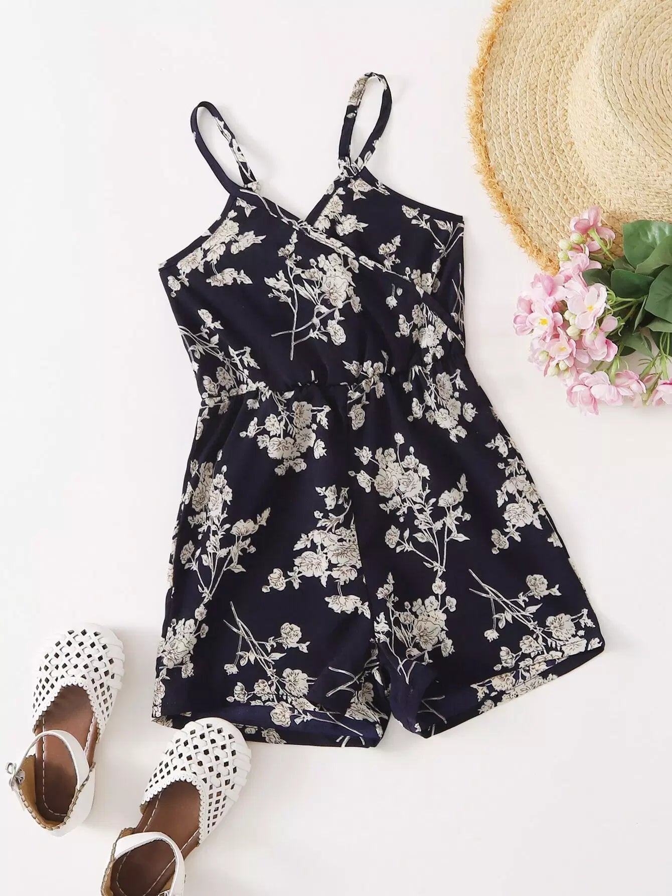 رومبير قصير بناتي صغيرات بطبعة زهور أمامية بطبعة زهور للبنات