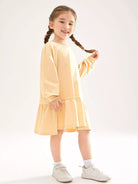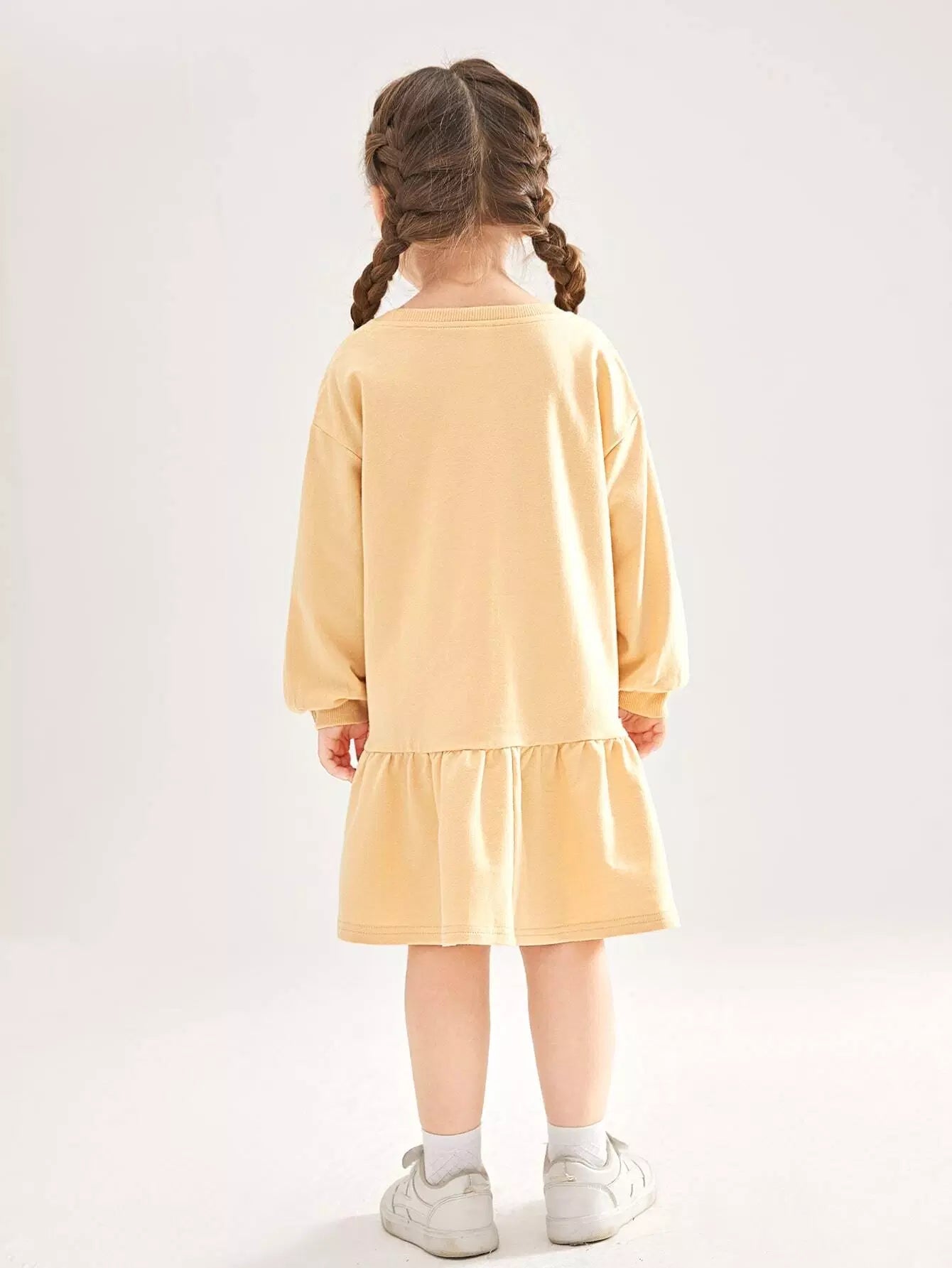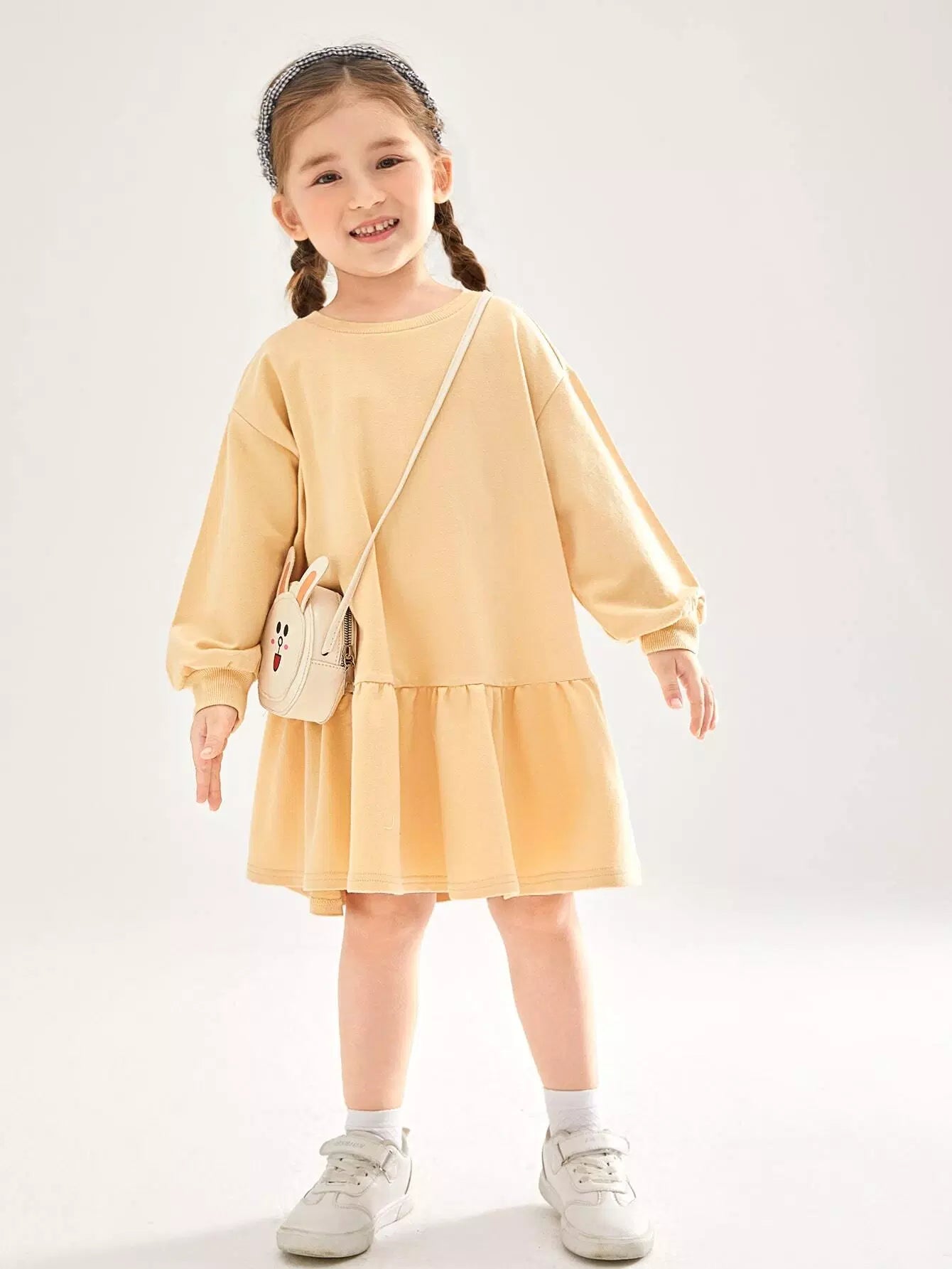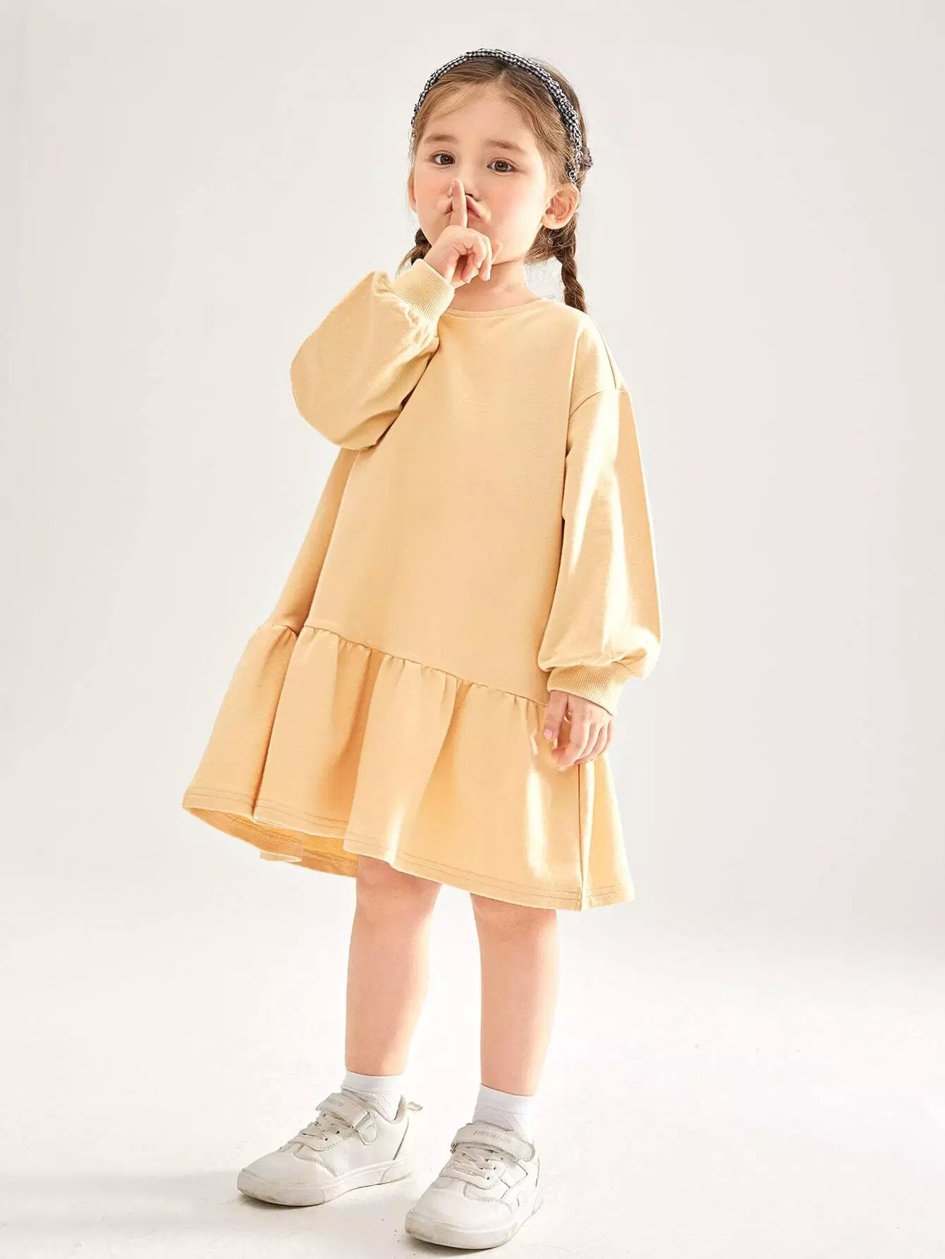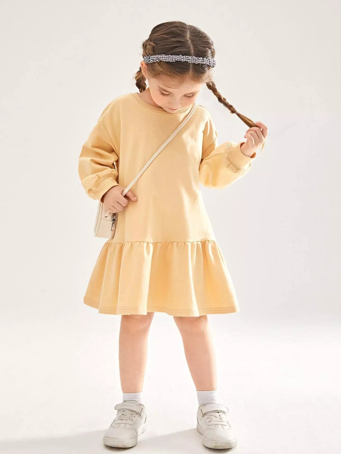 فستان سويت شيرت بكتف منسدل مع كشكشة على الحافة للبنات الصغار