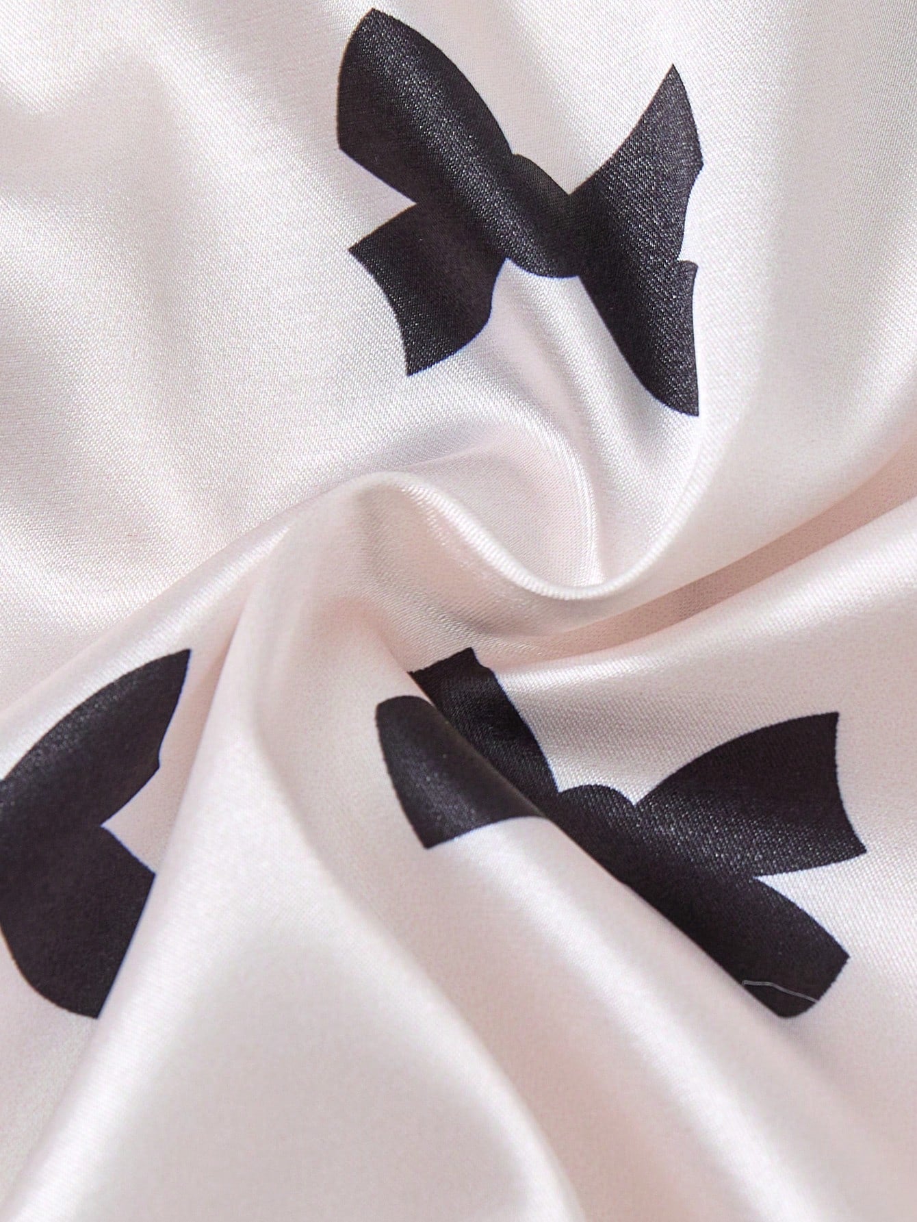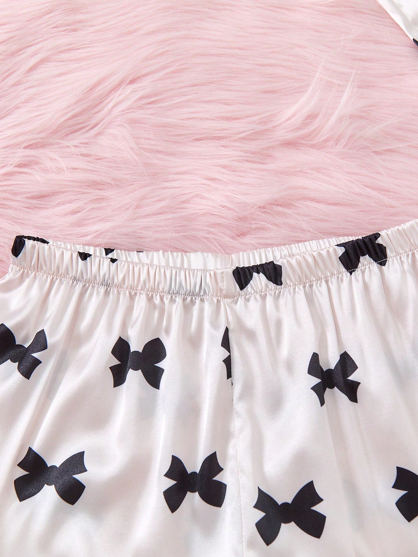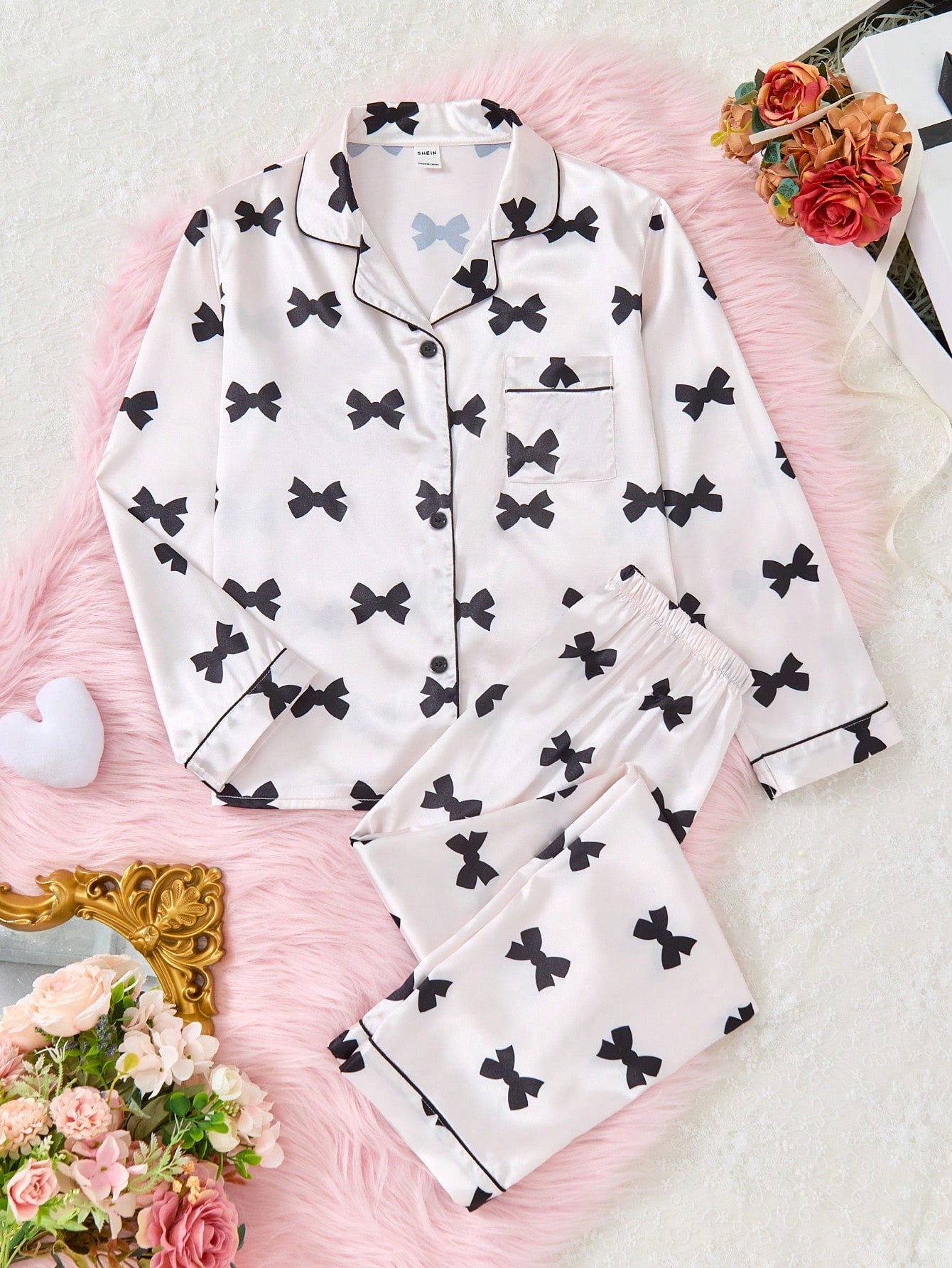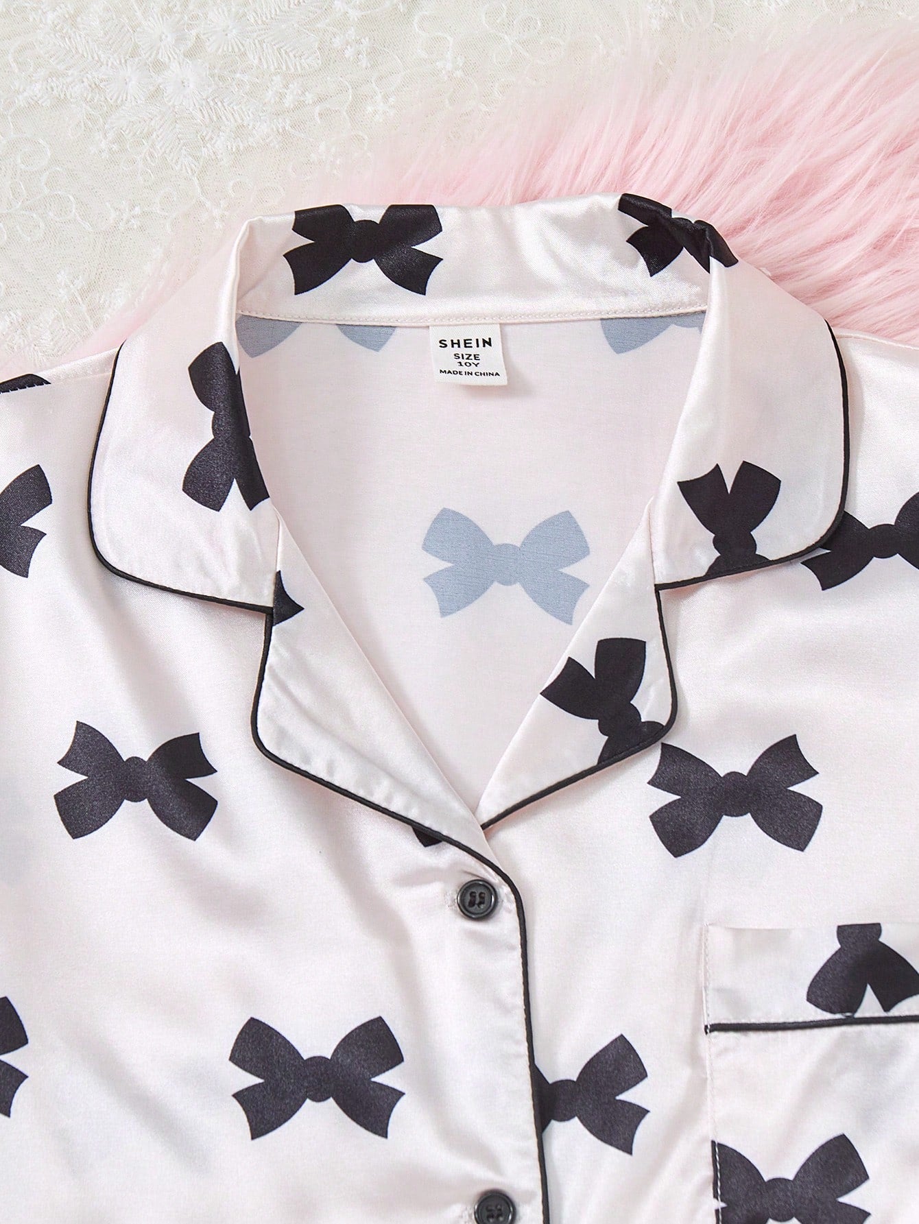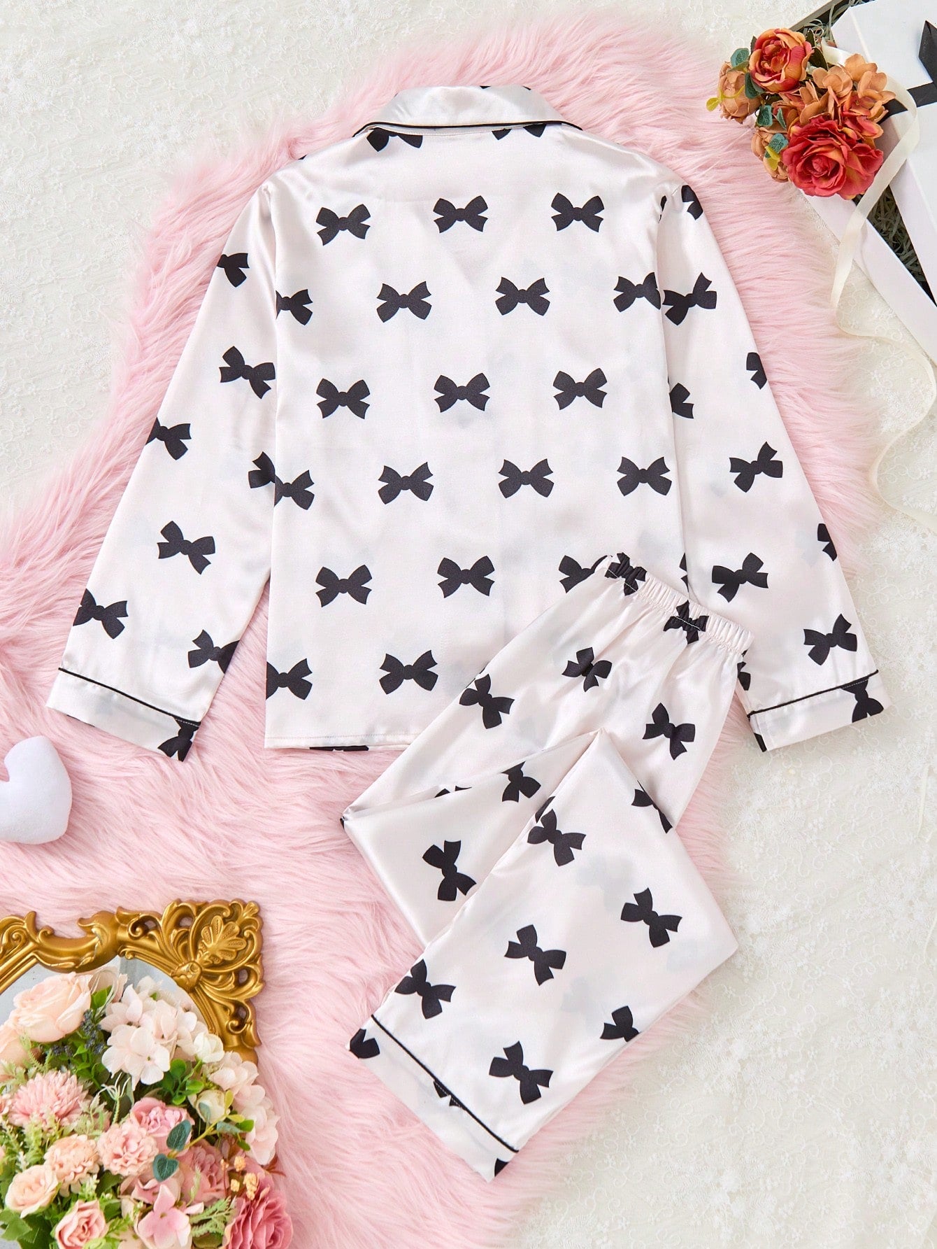 kids 2pcs/Set Young Girl' Champagne Texture Black Bow Print Long Sleeve Top & Pants Homewear Set