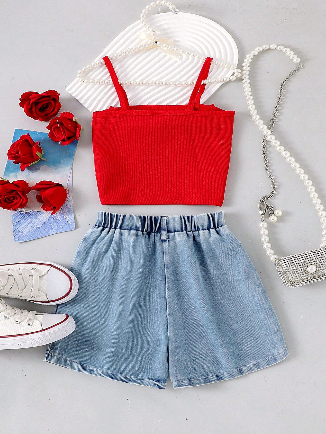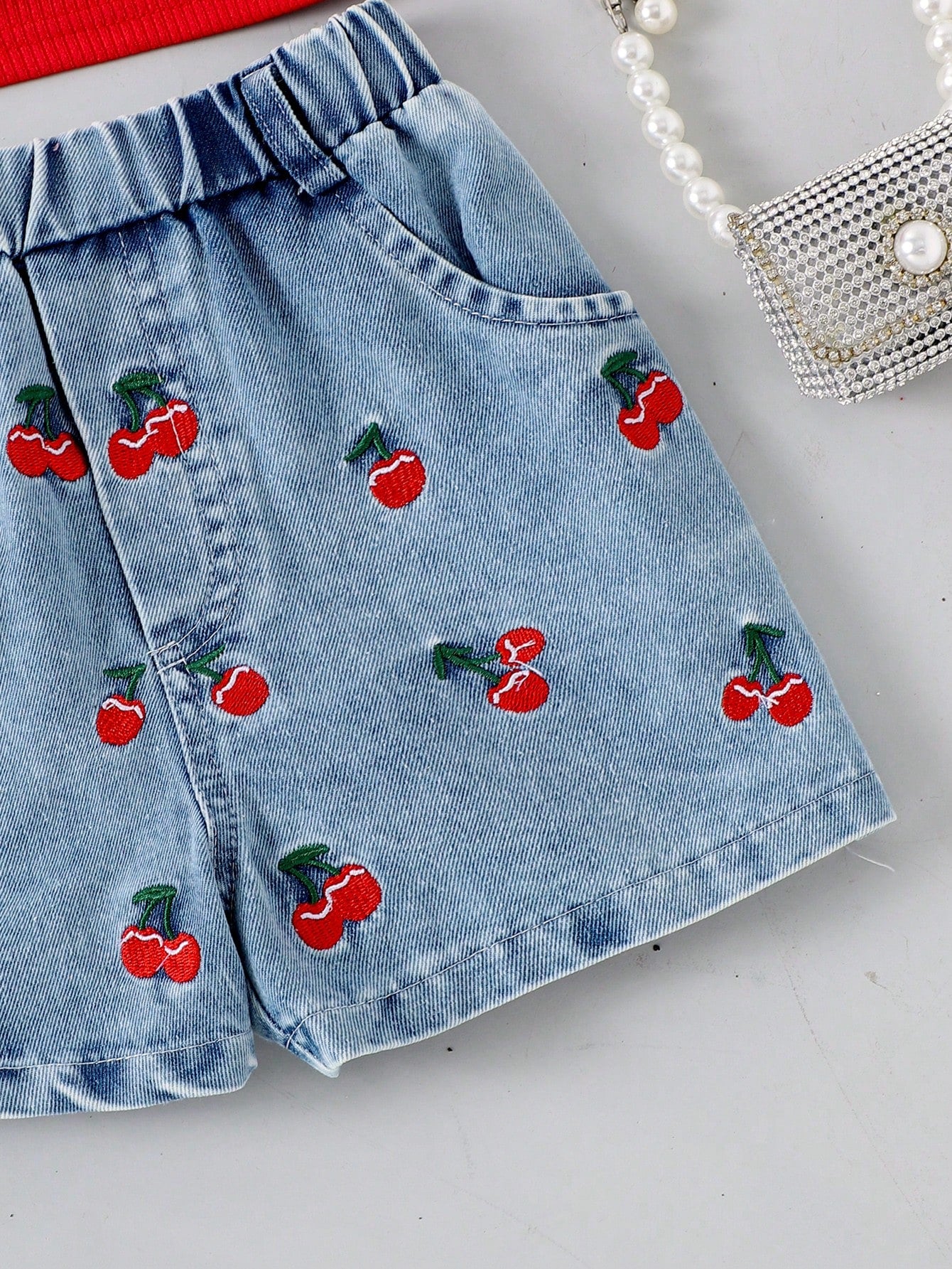 2pcs/Set Young Girl Red Bow Cami Top And Blue Denim Cherries Embroidered Shorts, Summer Casual Cute Vacation