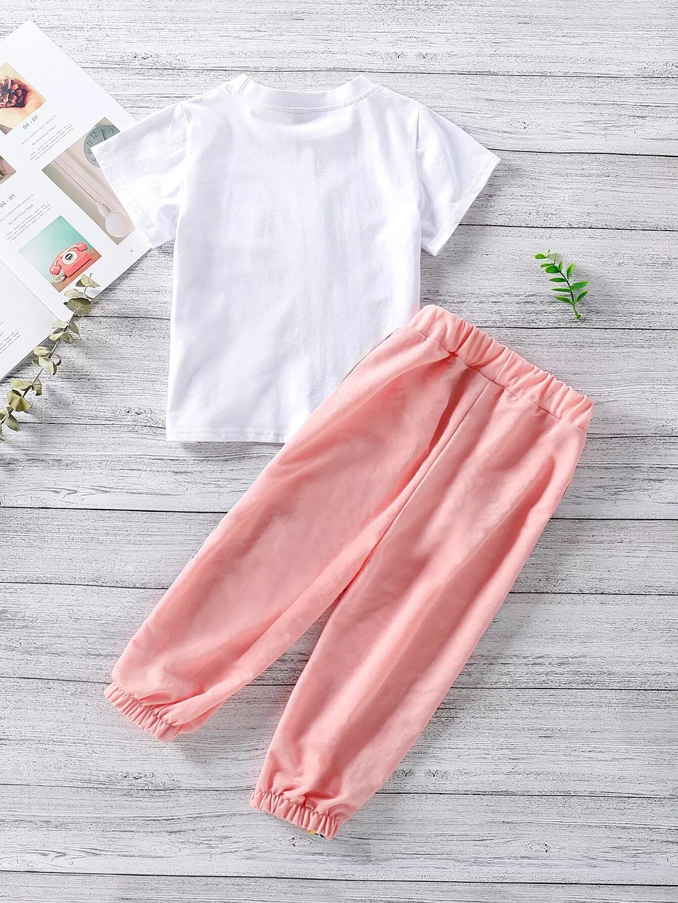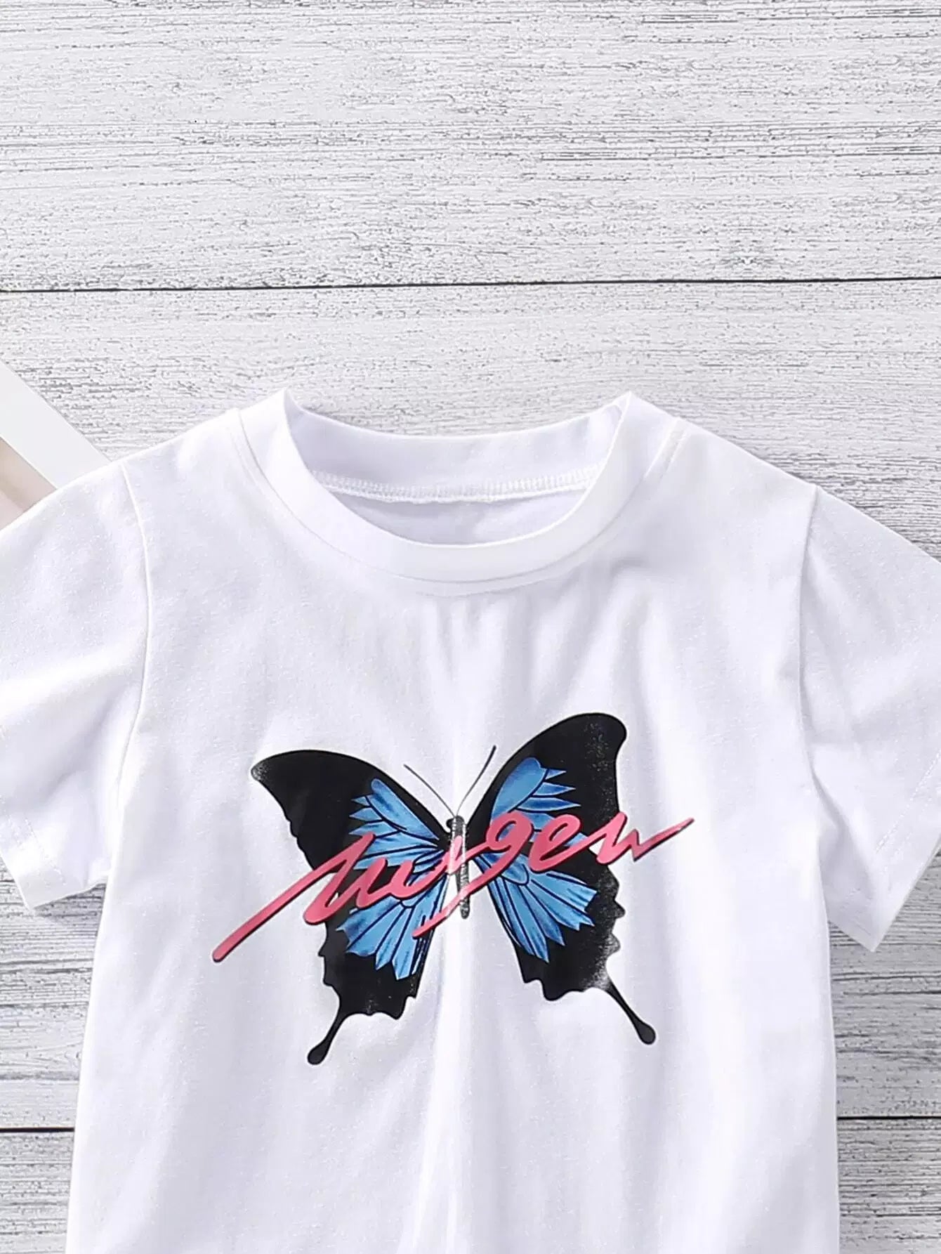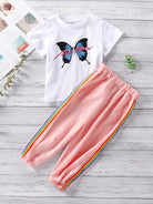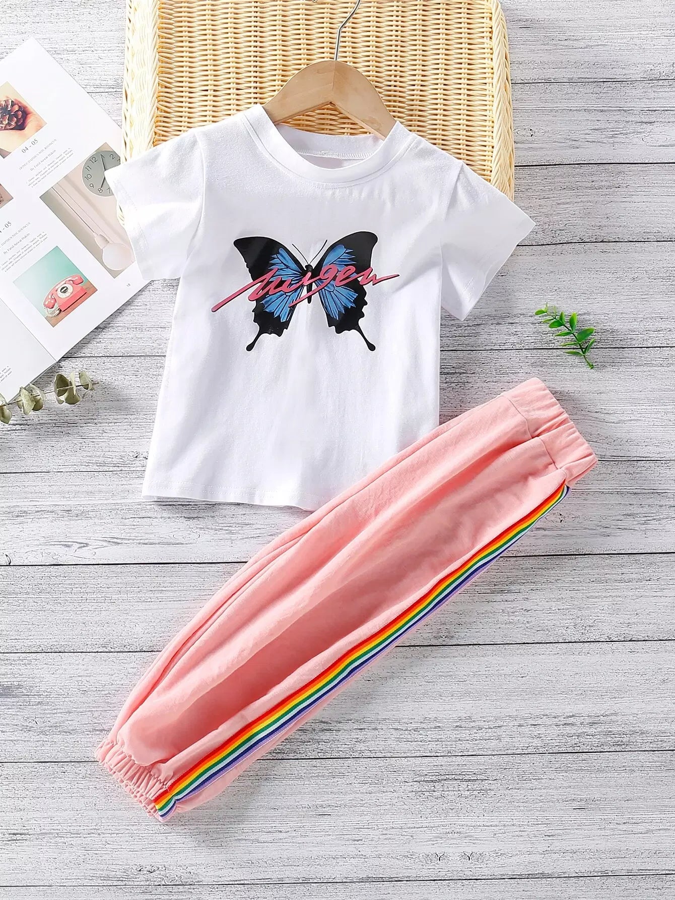 تي شيرت بطبعة فراشات للبنات الصغار مع بنطال رياضي بشريط قوس قزح