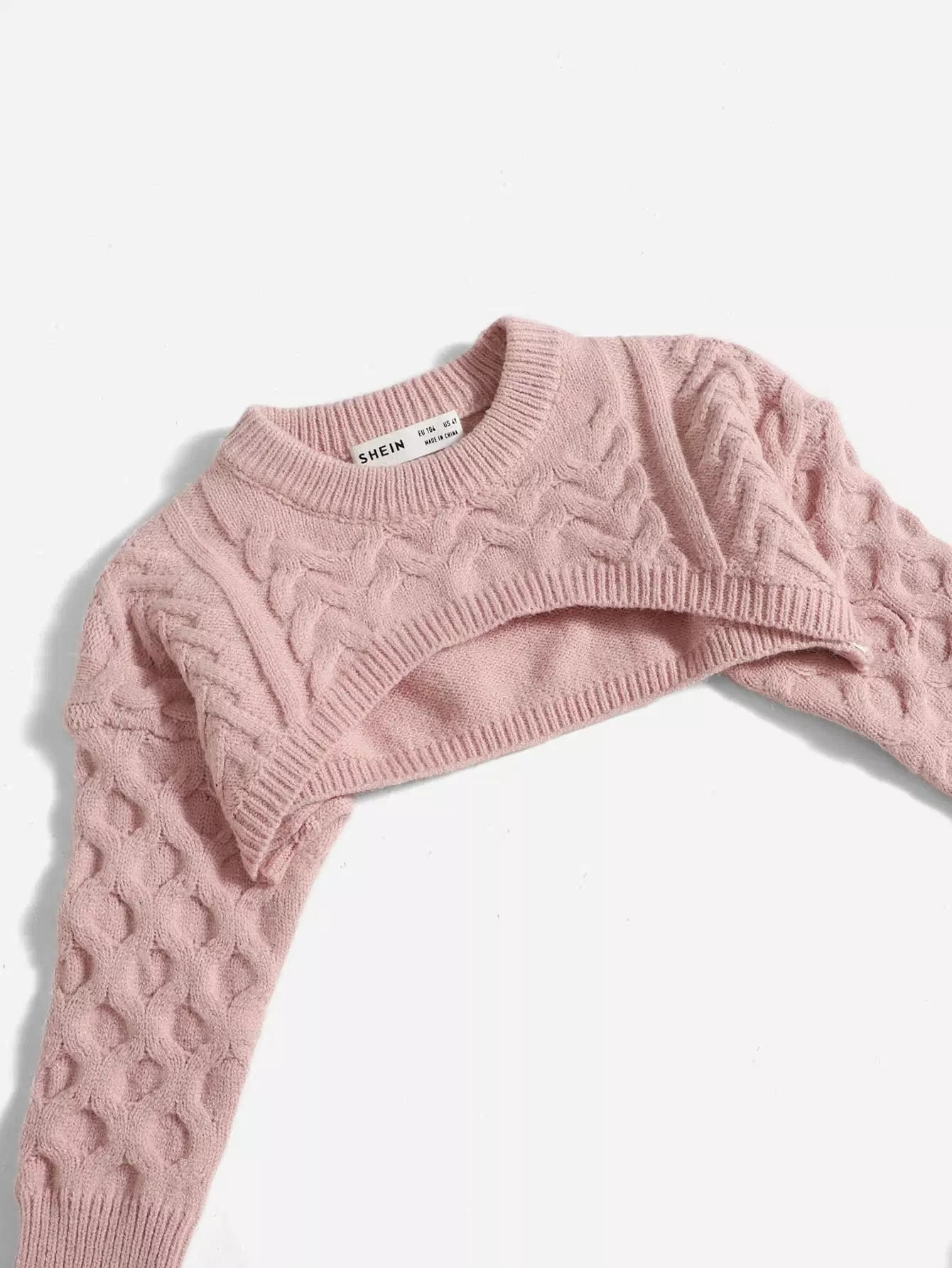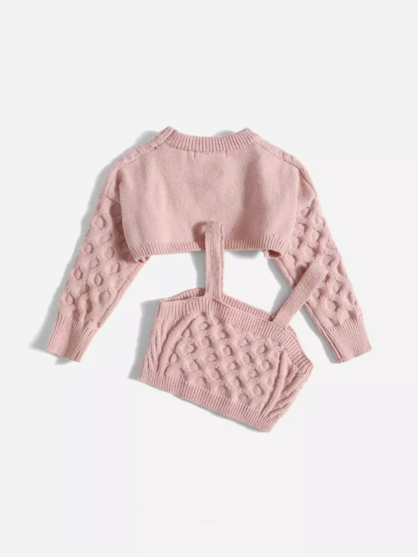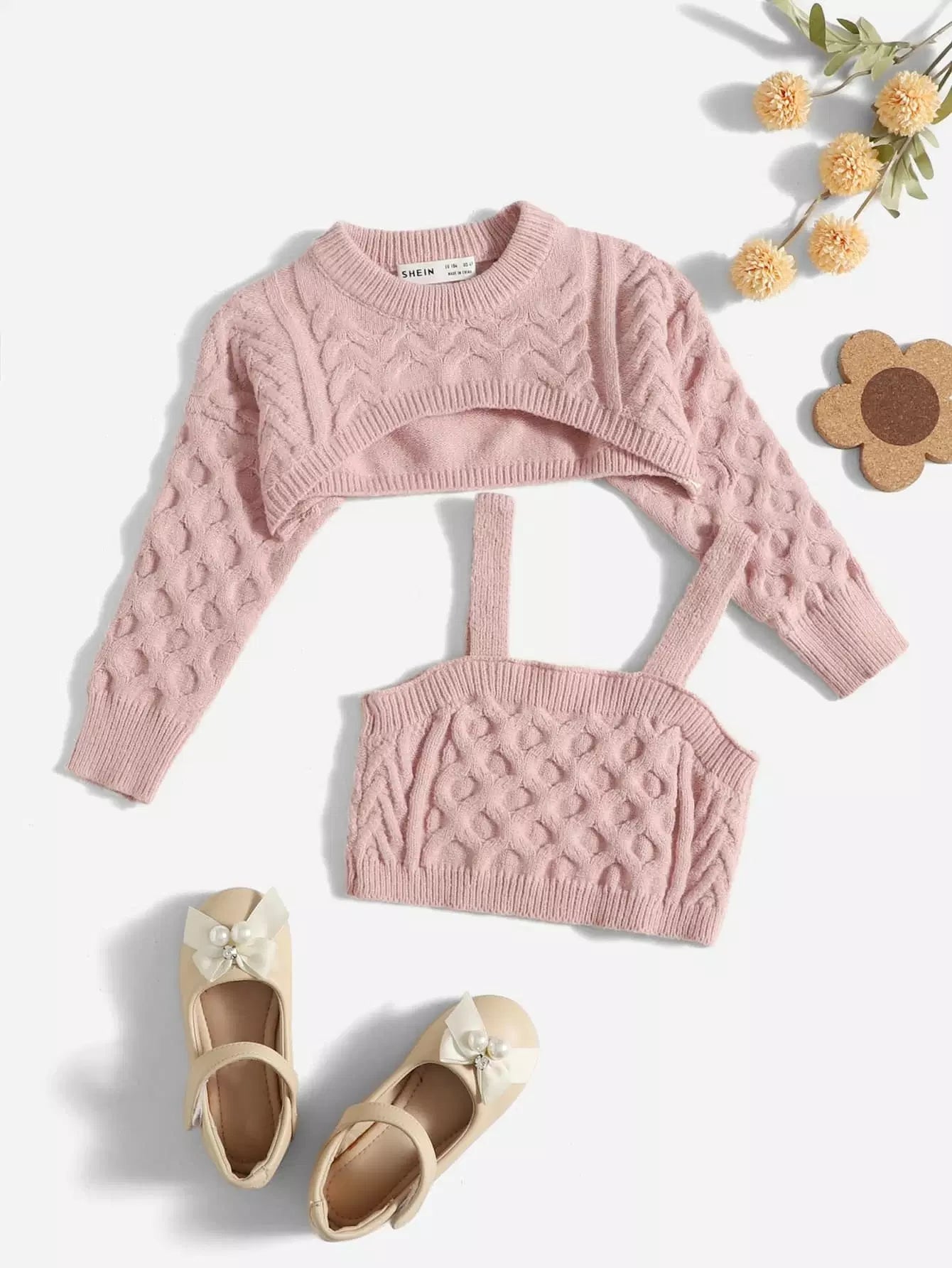 سترة قصيرة للغاية من الكابلات المحبوكة للفتيات الصغيرات مع بلوزة محبوكة