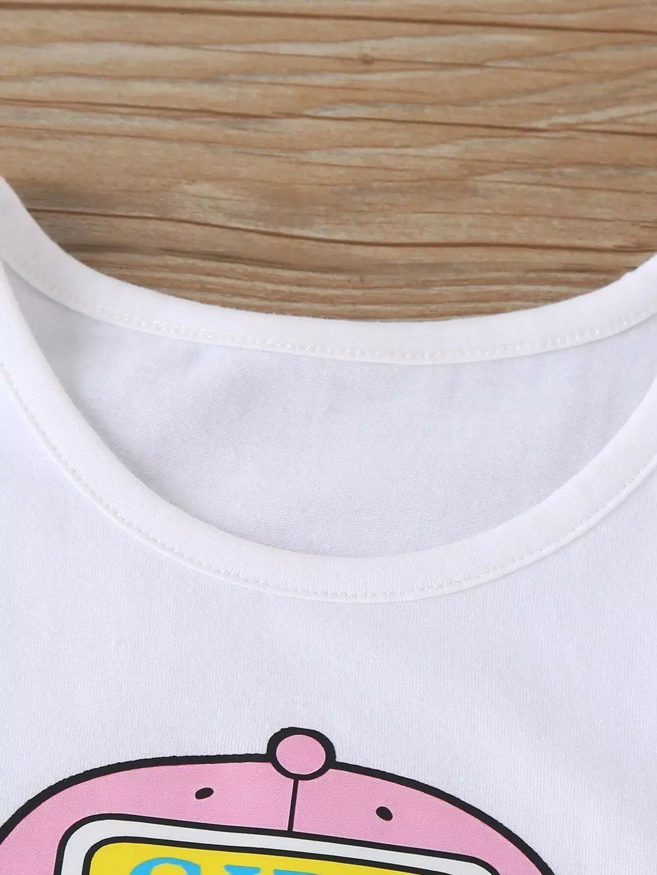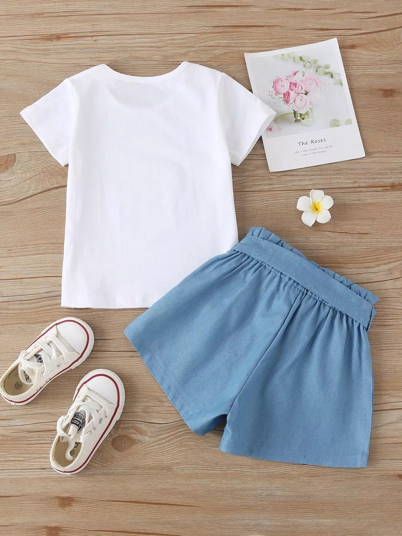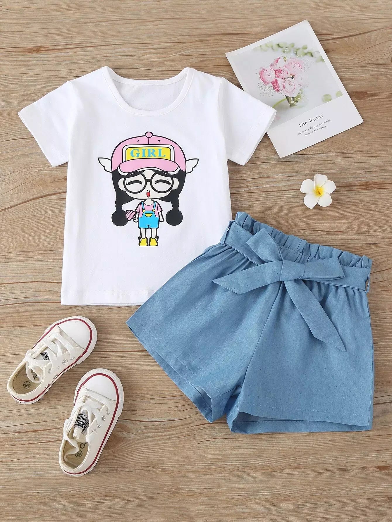 تي شيرت برسوم كرتونية للفتيات الصغيرات مع شورت خصر بحقيبة ورقية بدون حزام