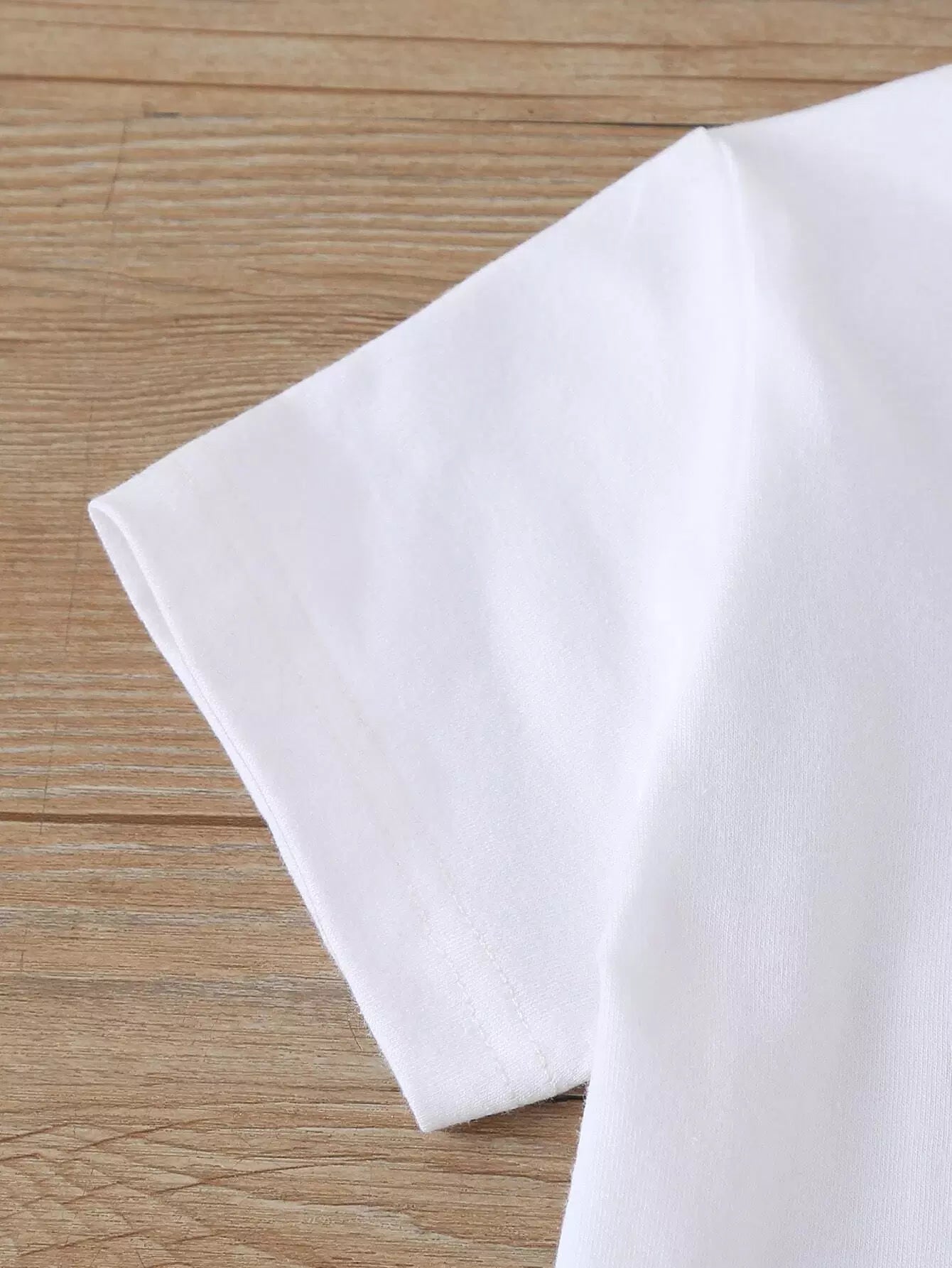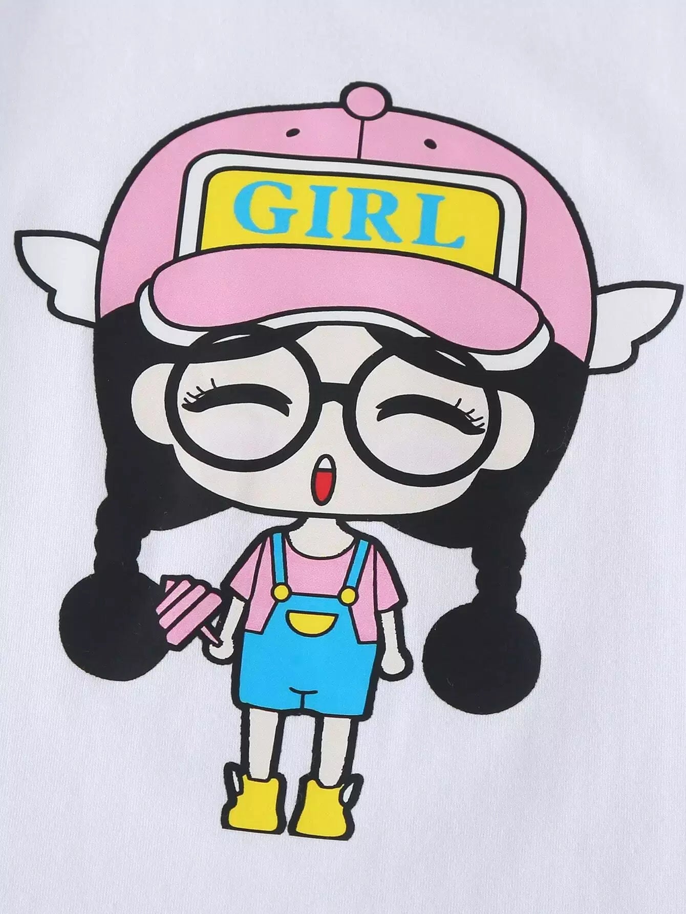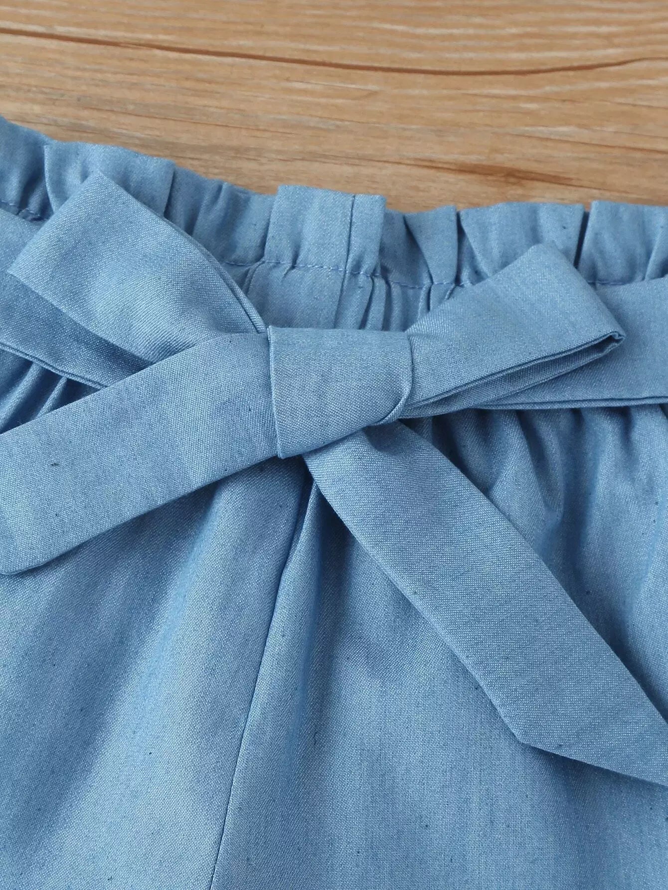 تي شيرت برسوم كرتونية للفتيات الصغيرات مع شورت خصر بحقيبة ورقية بدون حزام