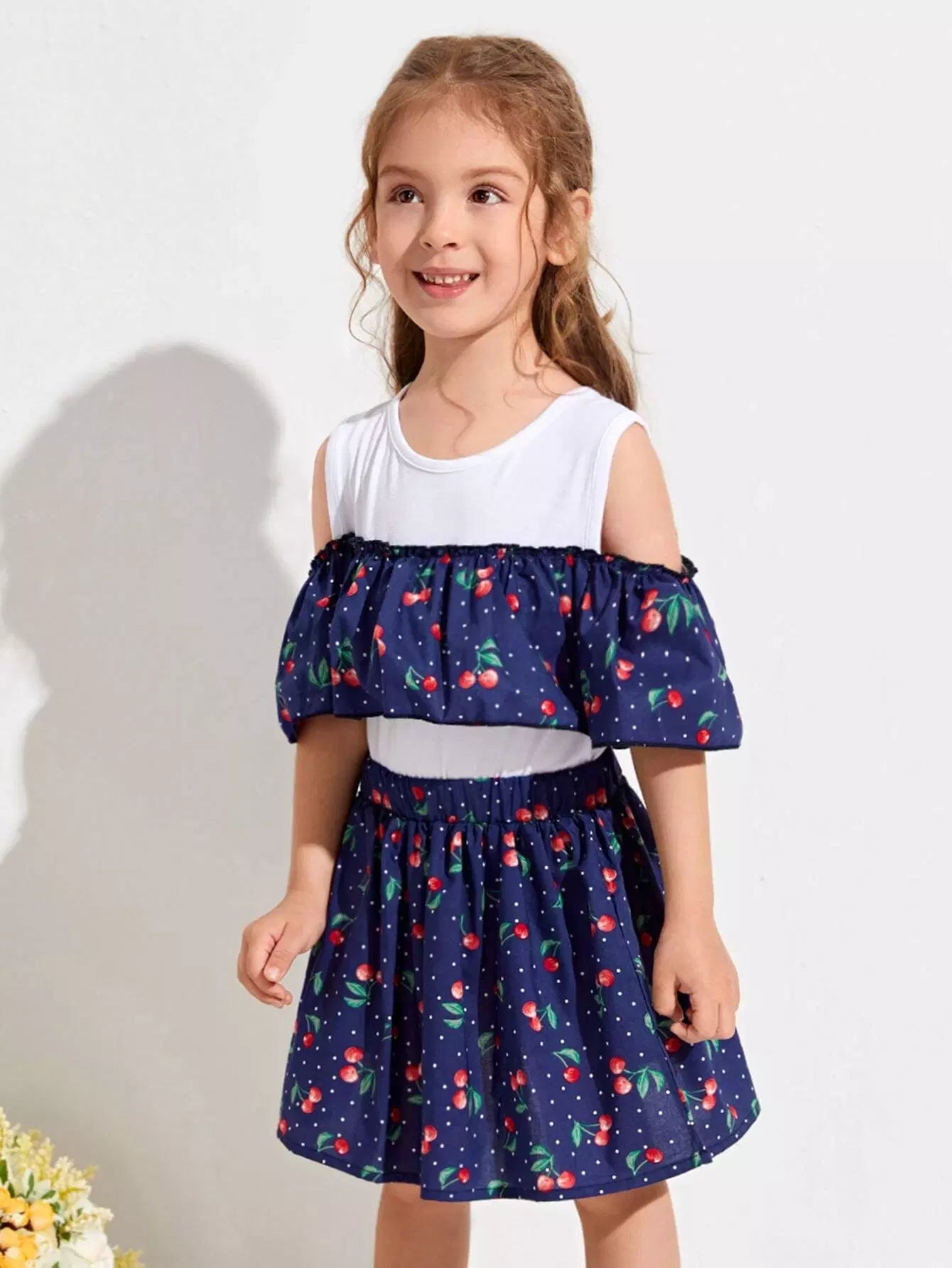 تي شيرت بأكتاف باردة منقوشة بالكرز والبولكا المنقطة مع تنورة
