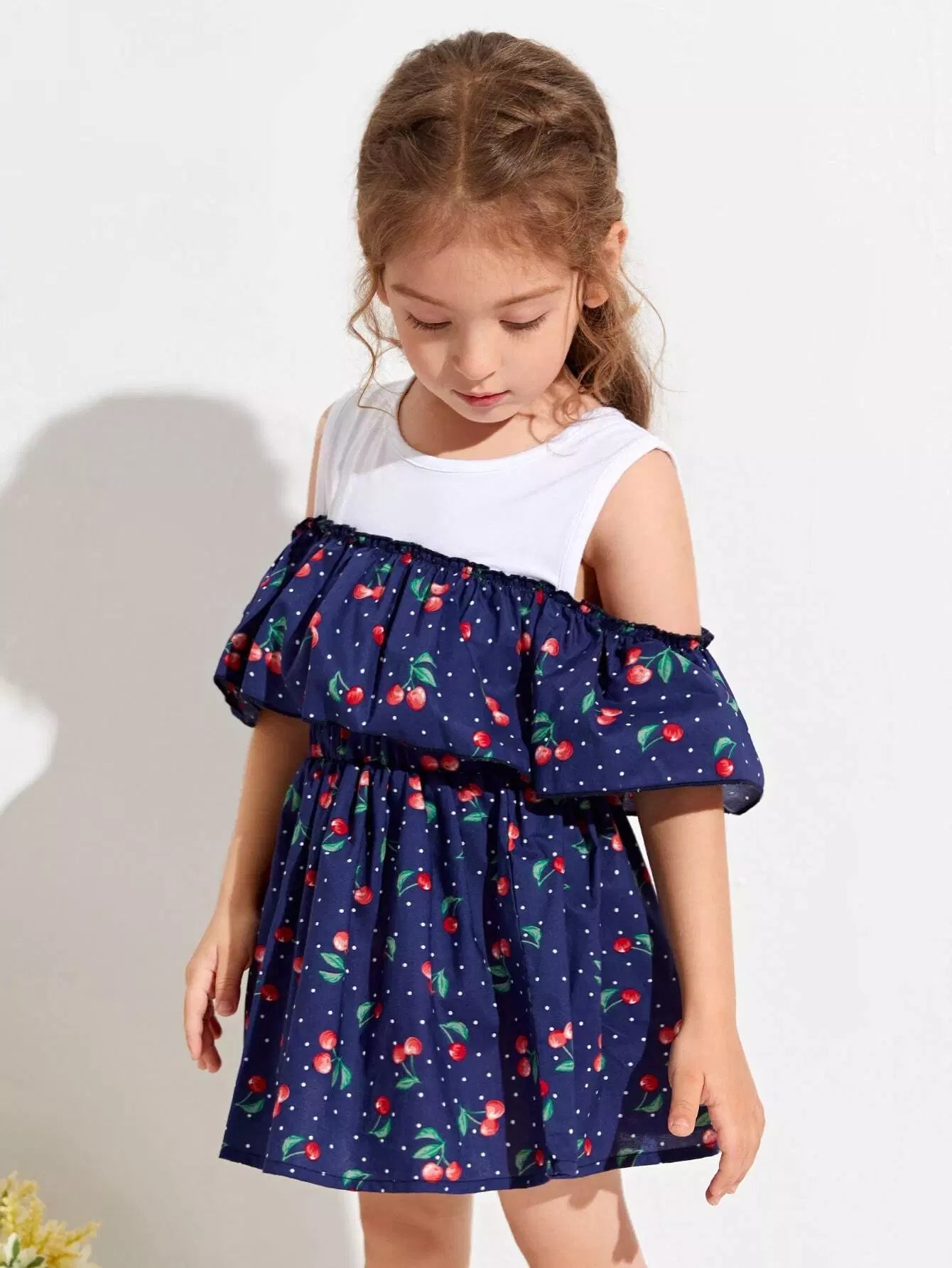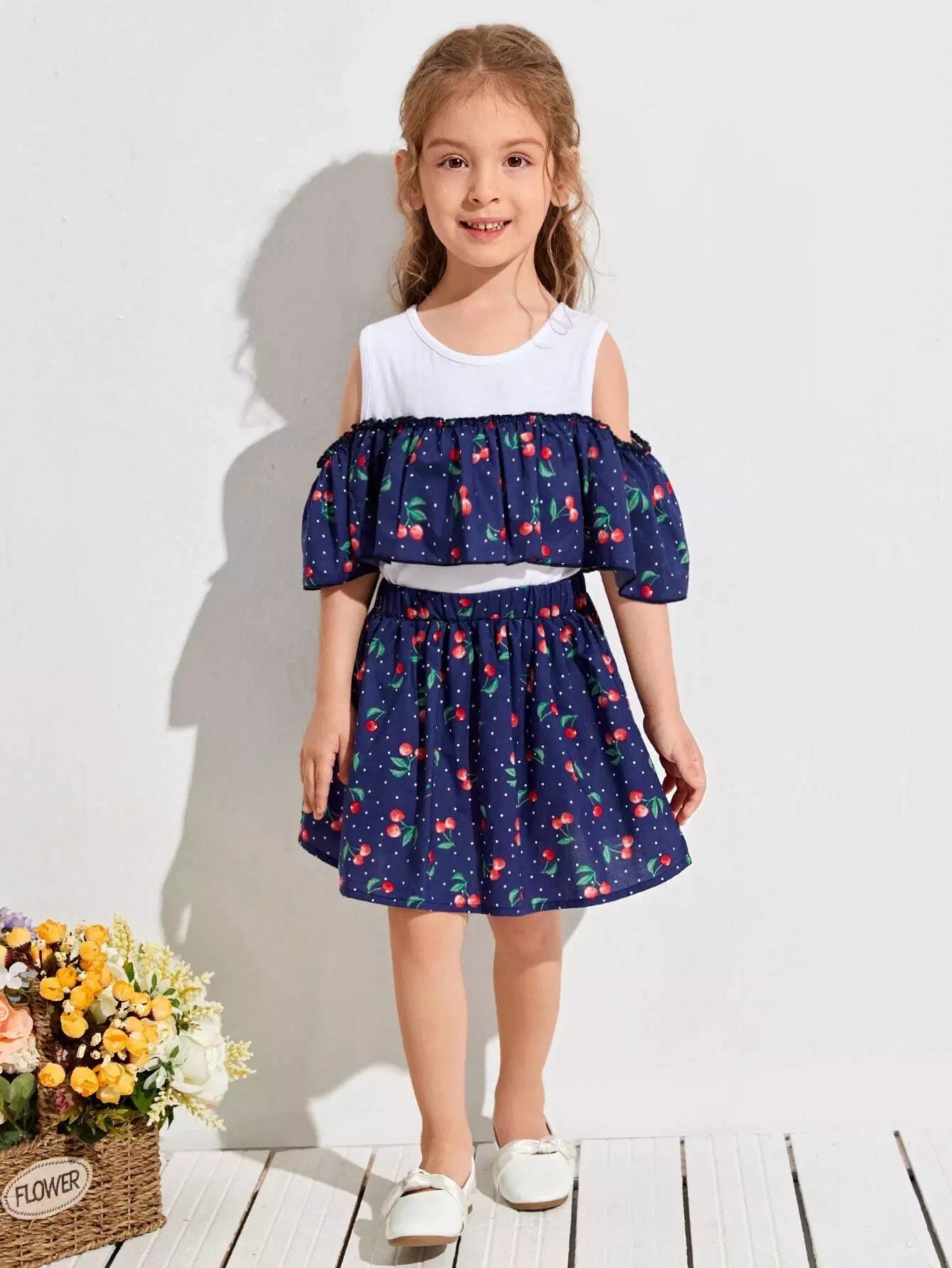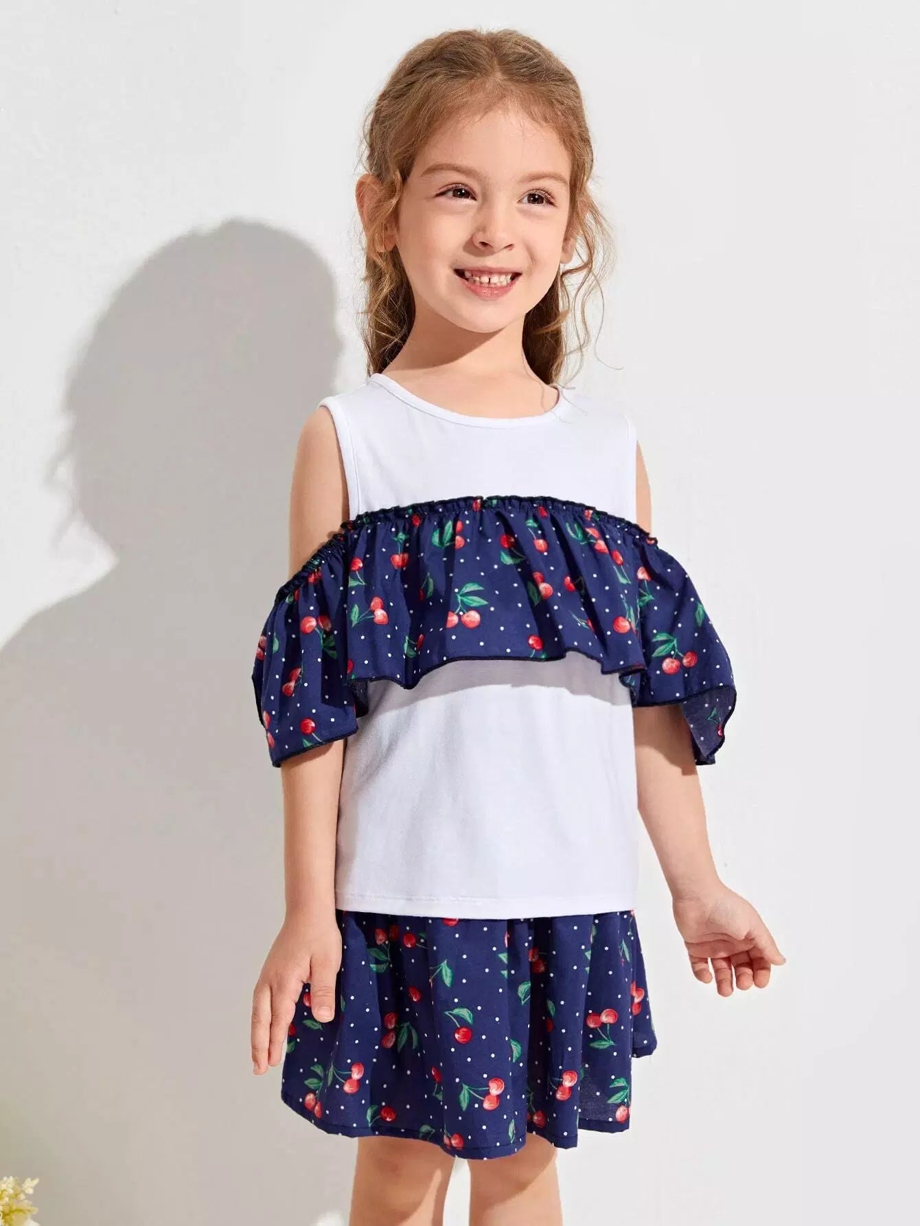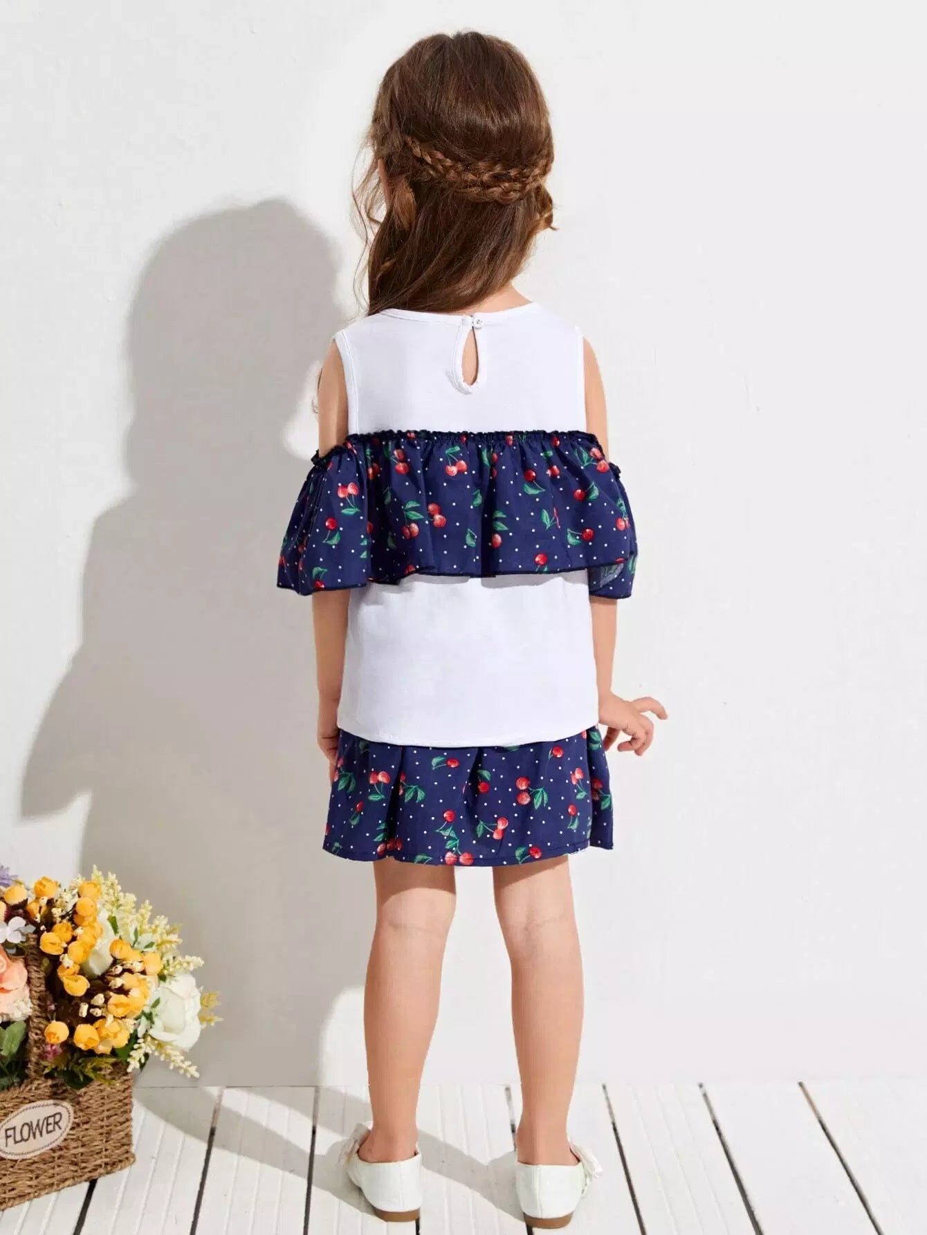الأطفال - تي شيرت للفتيات الصغيرات بأكتاف كرزية وبولكا دوت مع تنورة