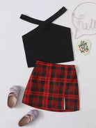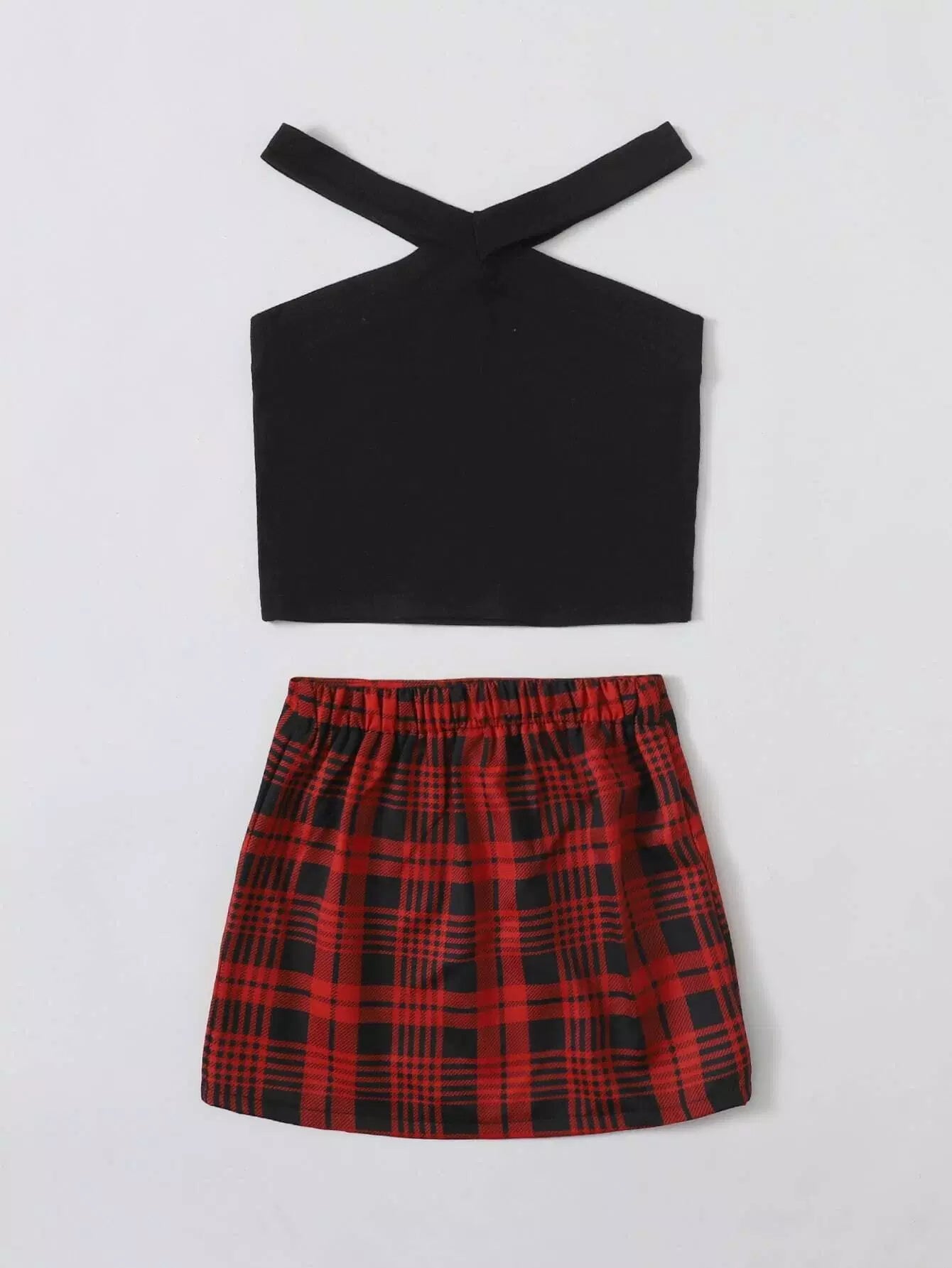 الأطفال - بلوزة هالتر للفتيات الصغيرات وتنورة منقوشة مقسمة