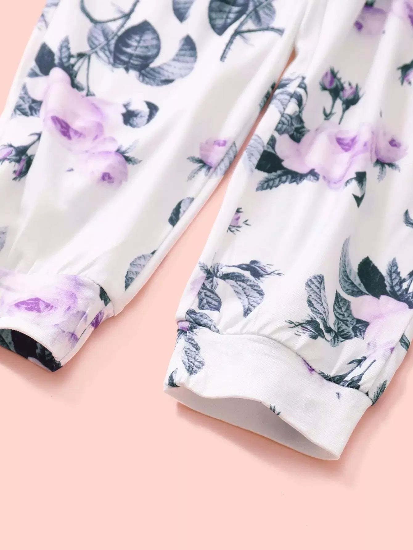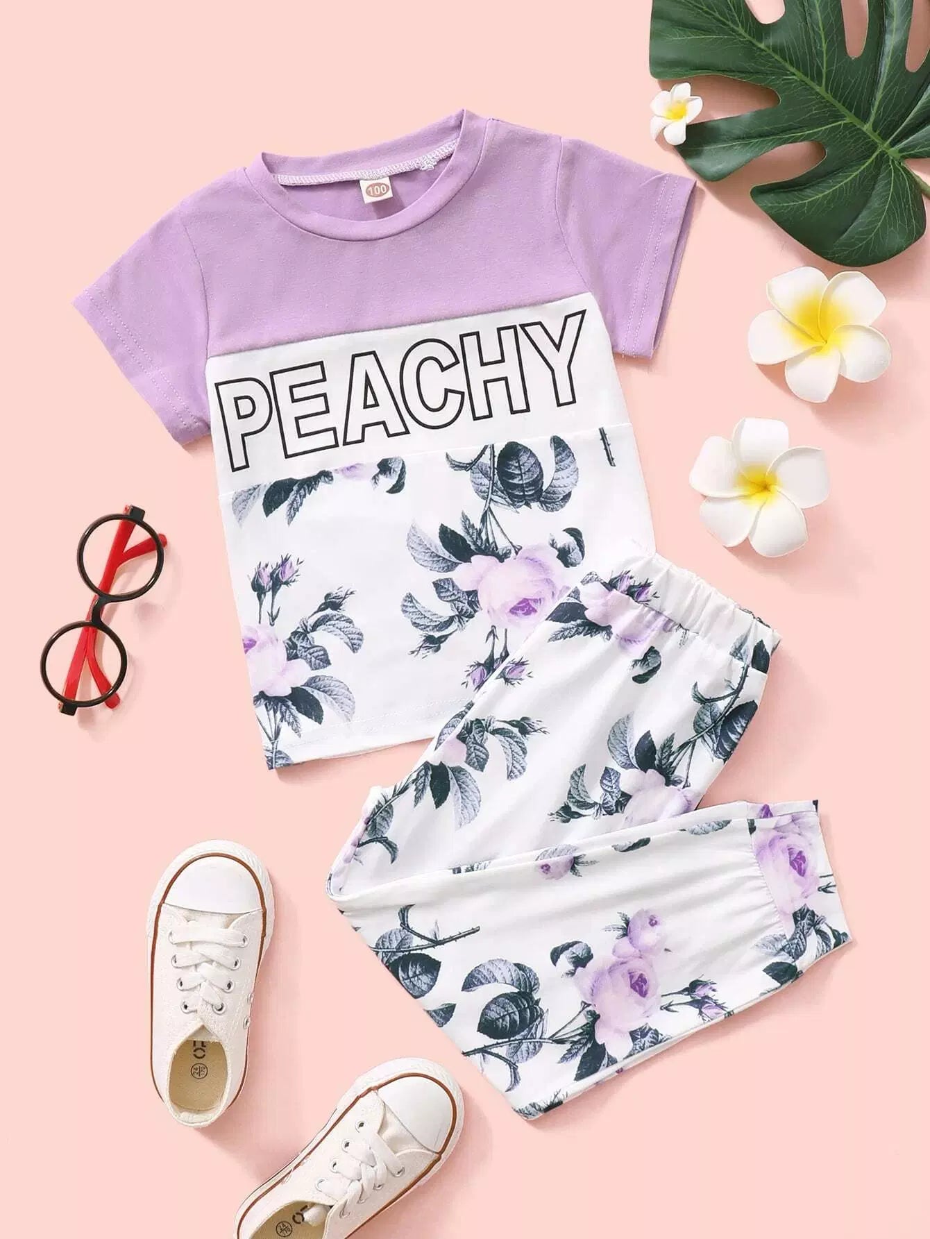 تي شيرت جرافيك برسوم حروف للبنات الصغار وبنطال رياضي بطبعة زهور
