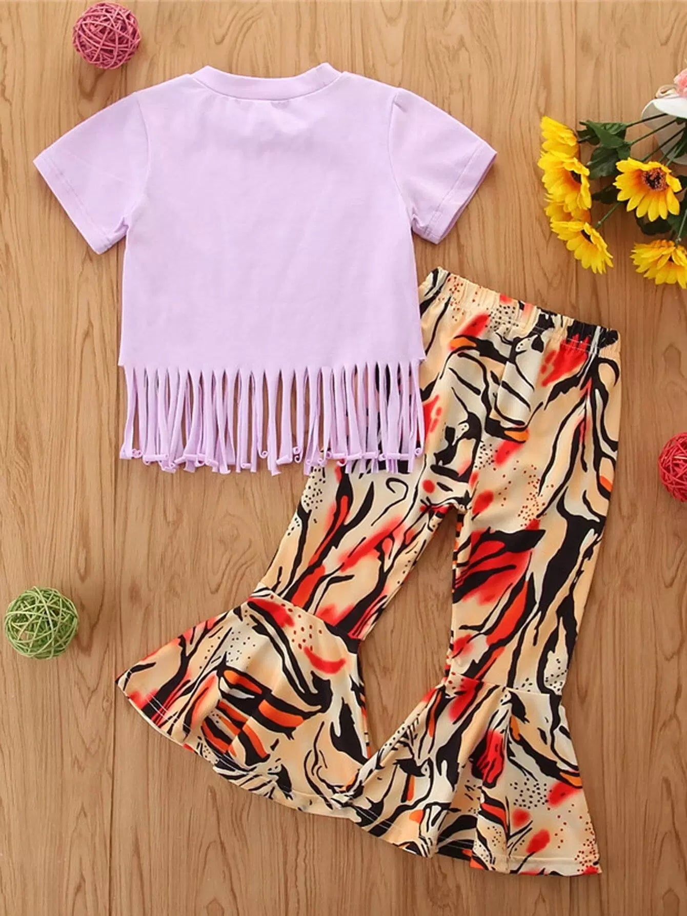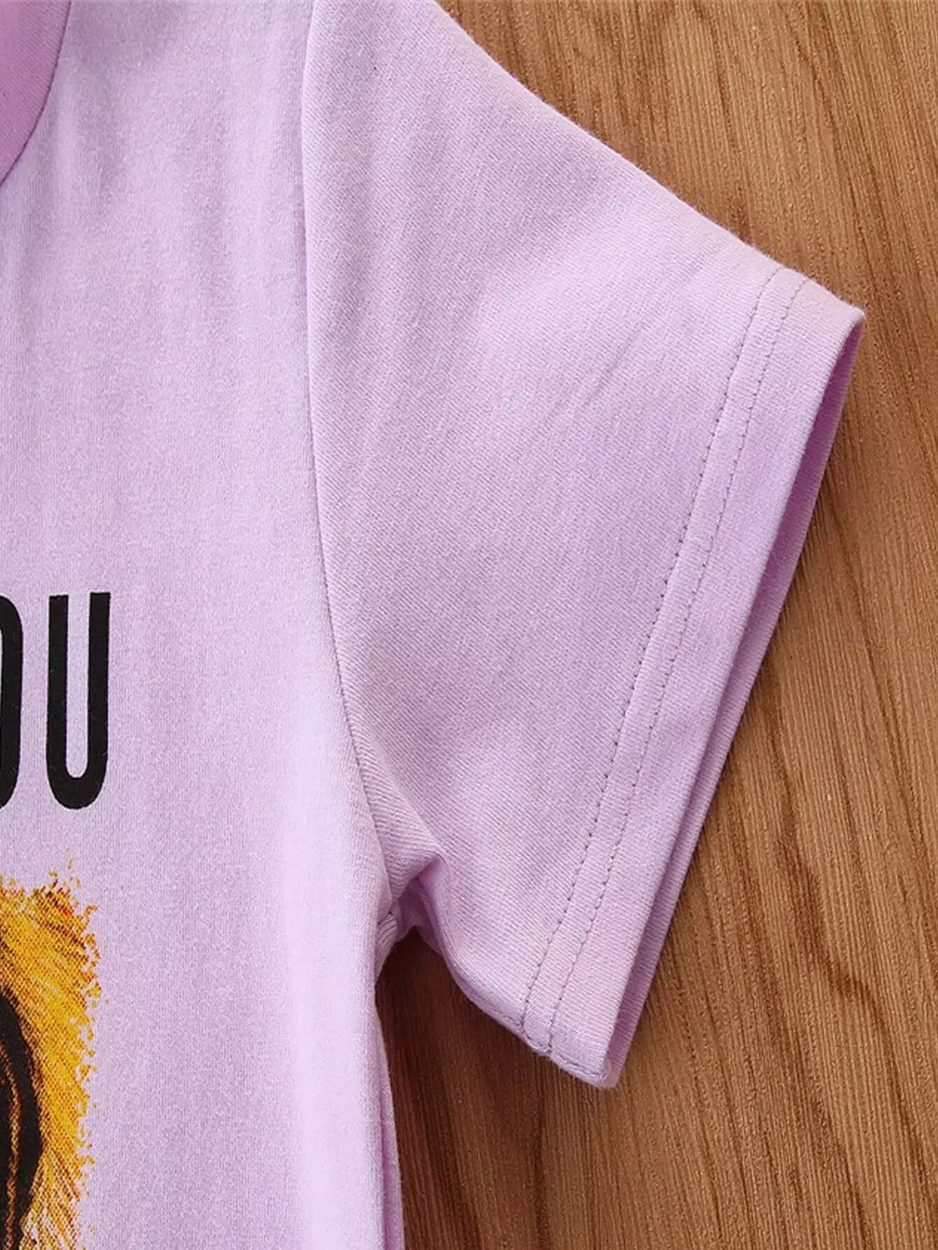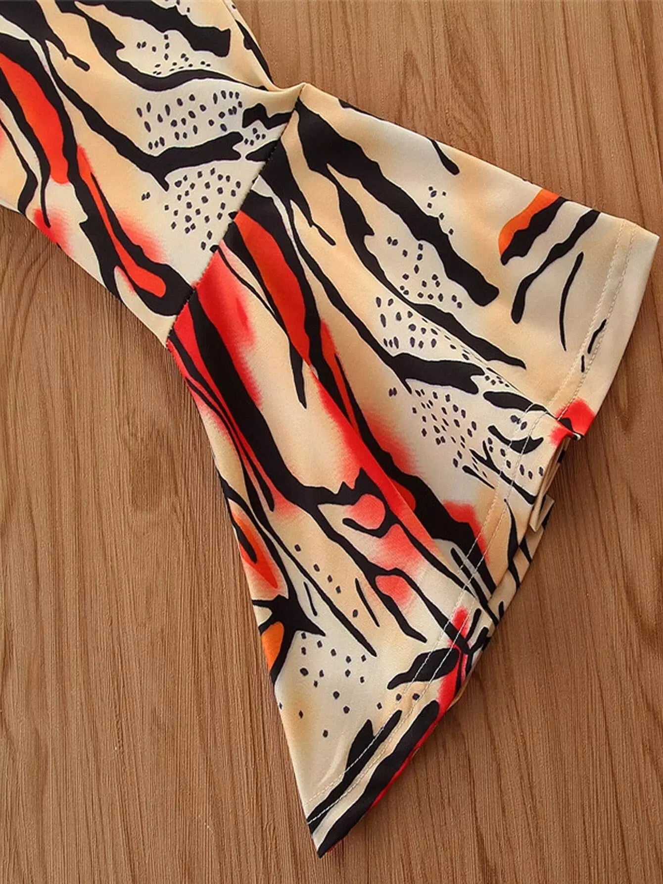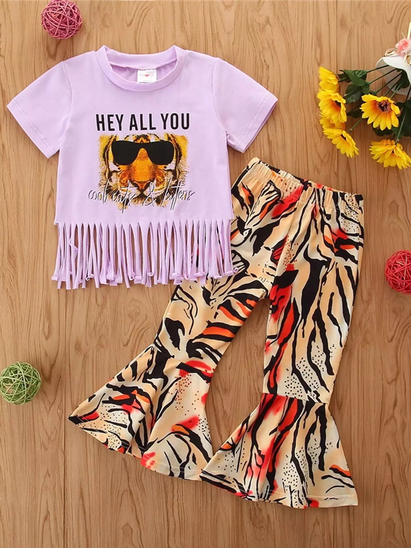 تي شيرت بشراشيب مطبوع عليه حروف ونمر وبنطال واسع للبنات الصغار