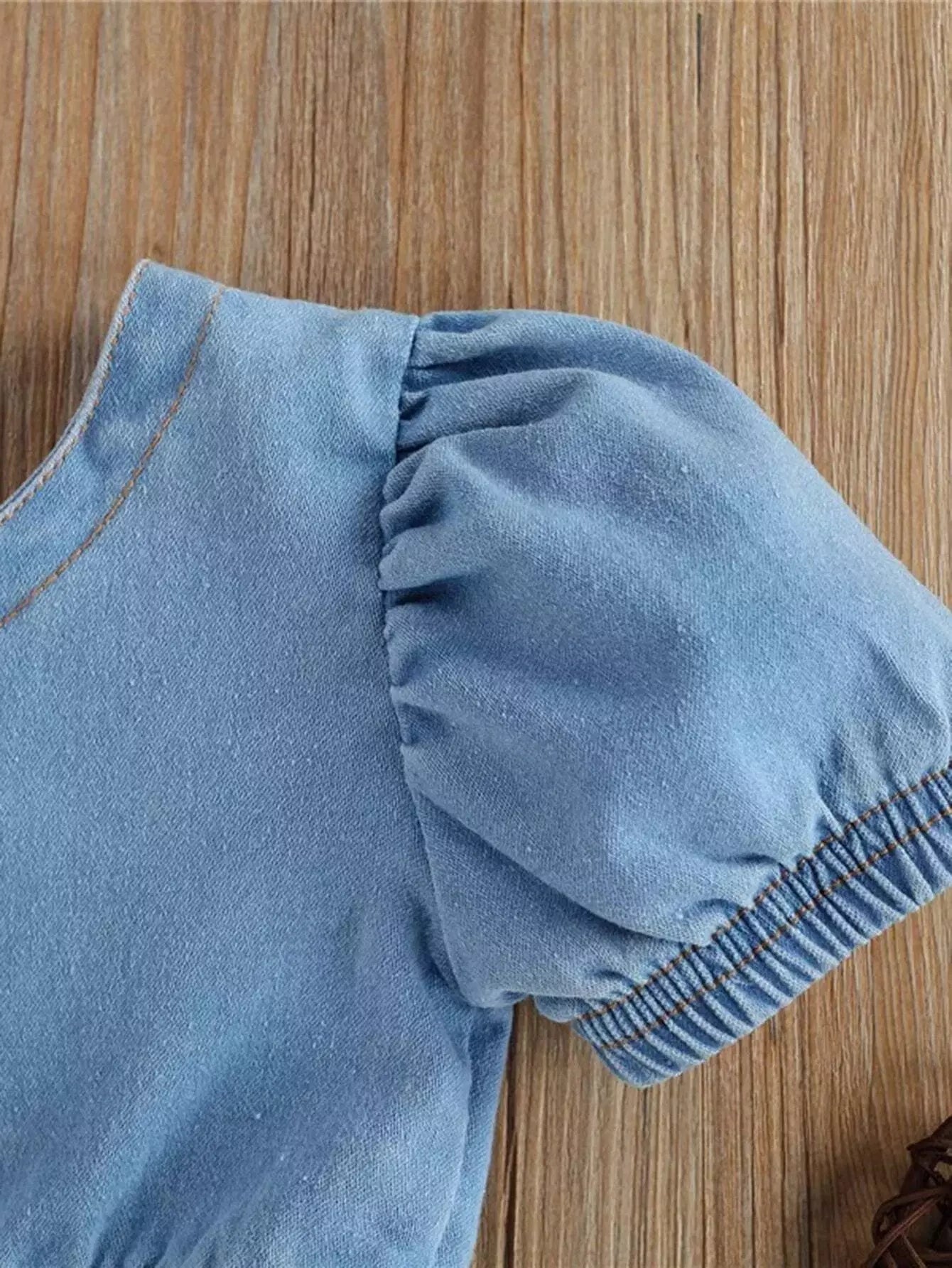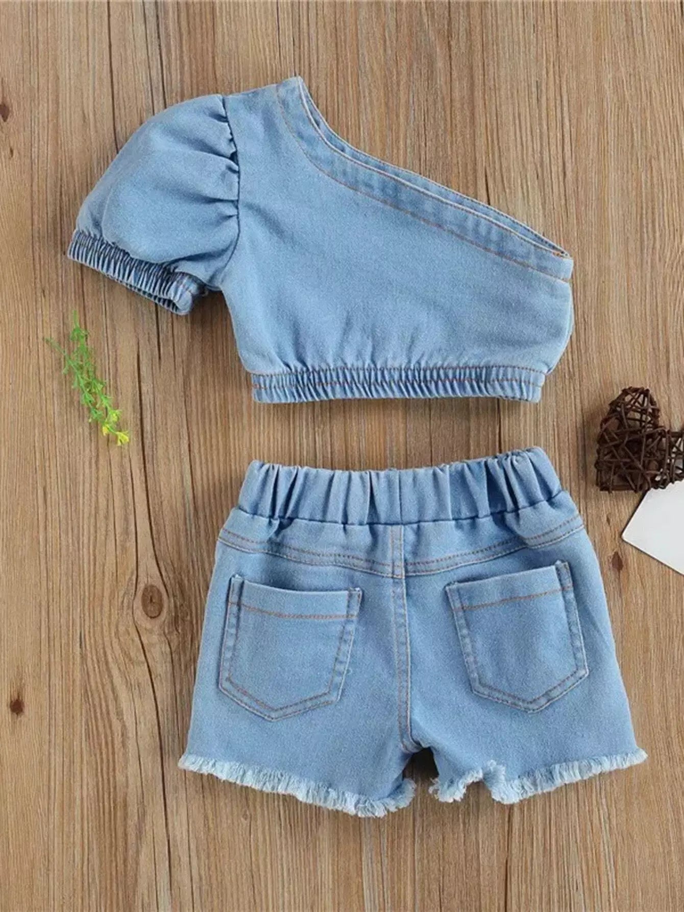 بلوزة دنيم بكتف واحد للبنات الصغيرات وشورت دنيم