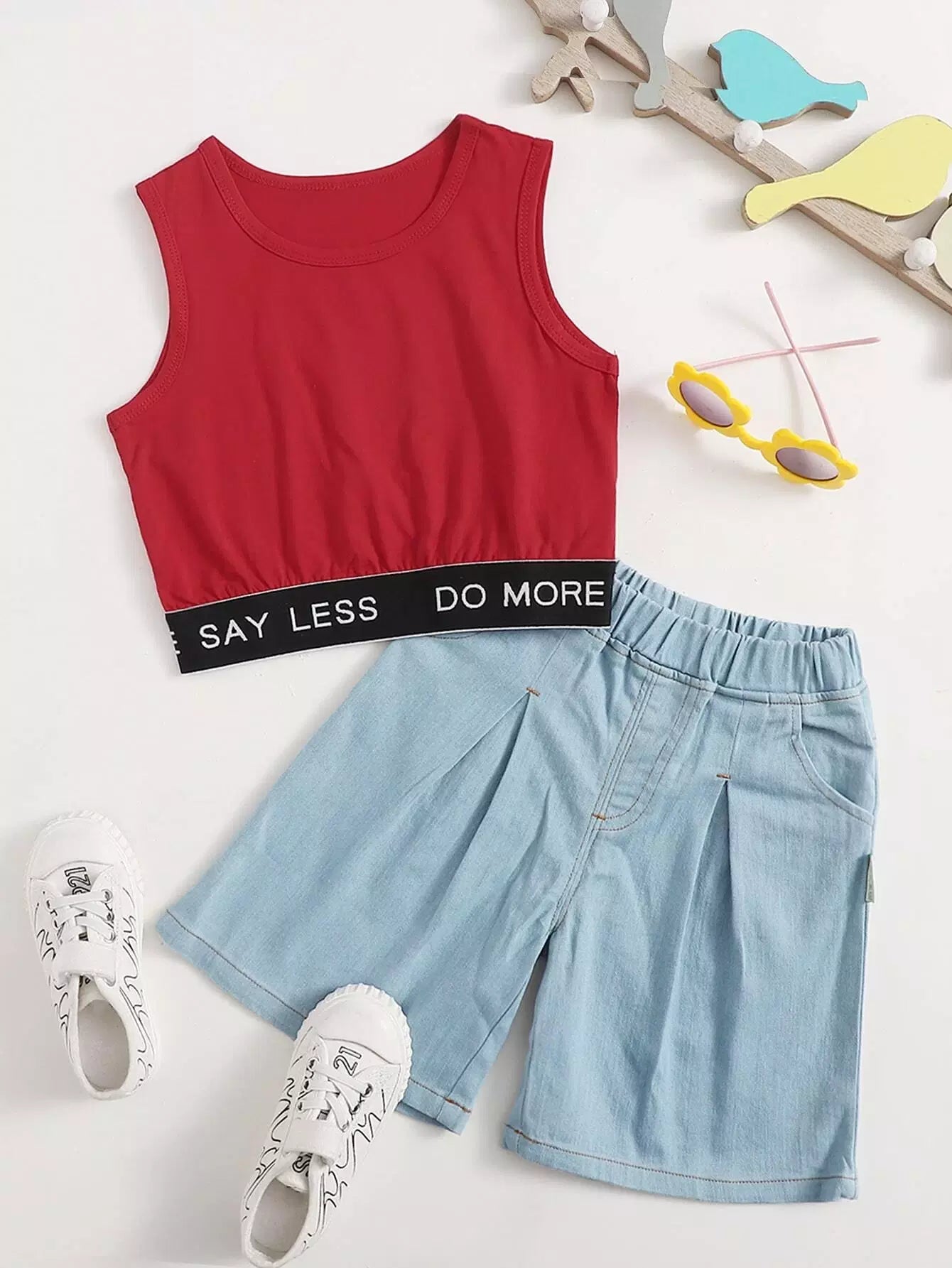 تانك بدون أكمام بشعار شعار البنات الصغيرات مع شورت جينز