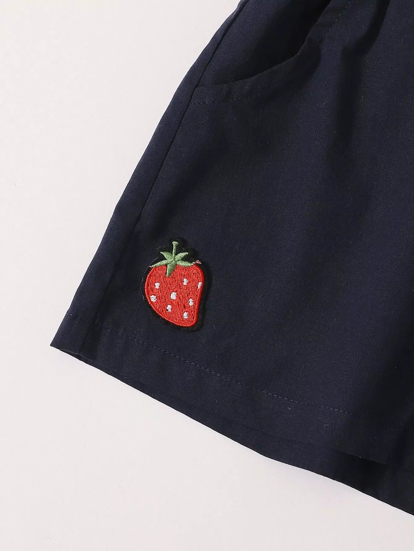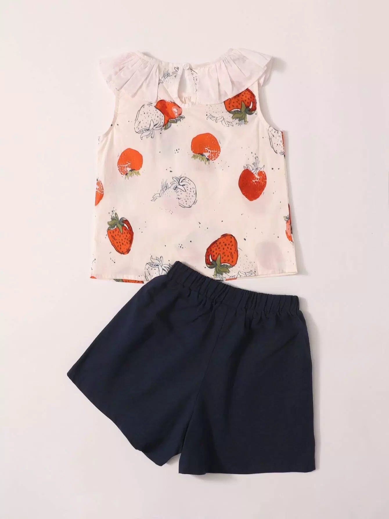 الأطفال - بلوزة مكشكشة بطبعة فراولة للفتيات الصغيرات وسروال قصير مرقّع