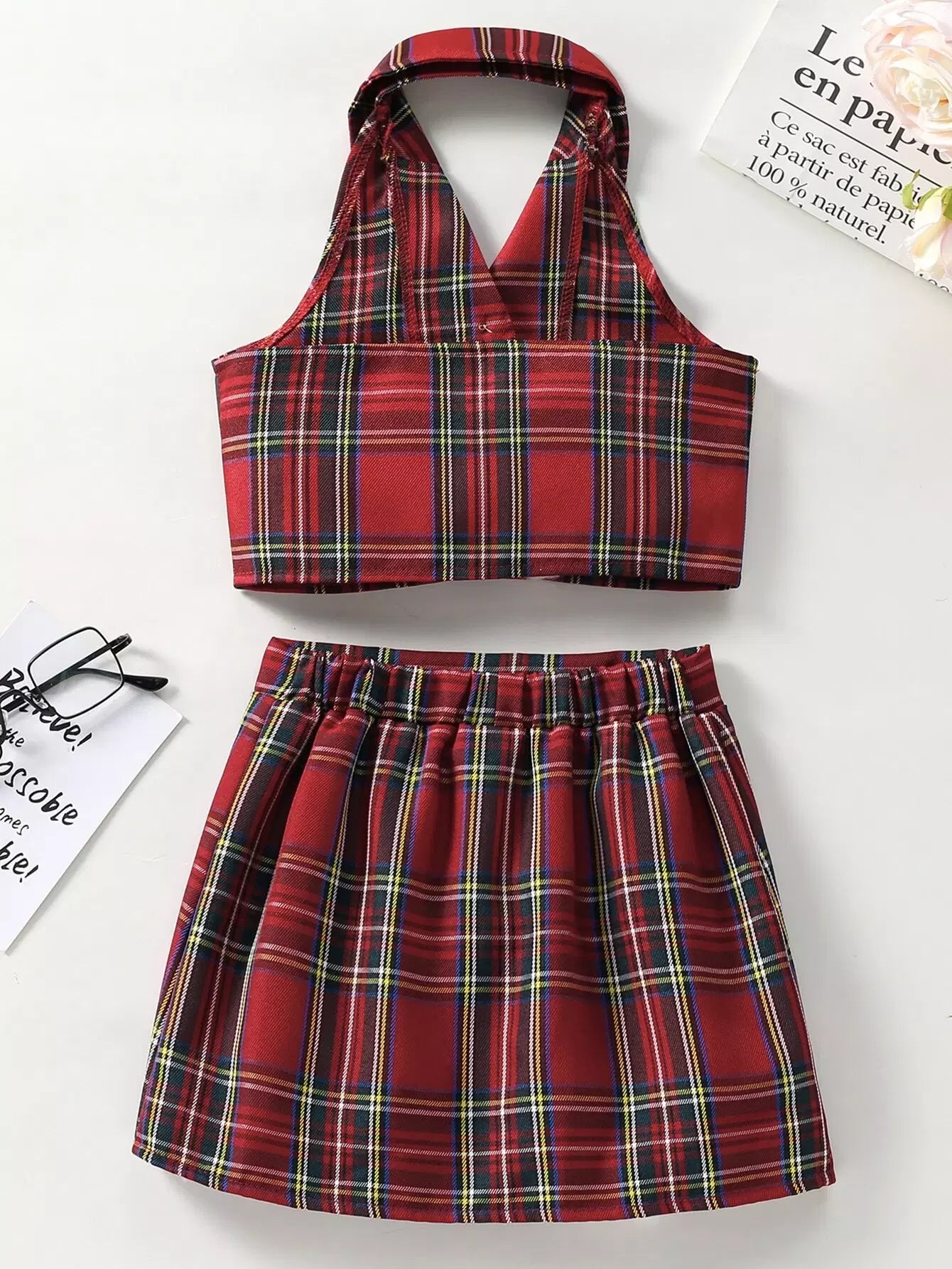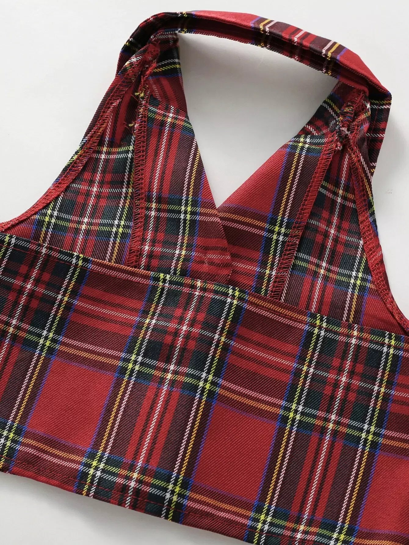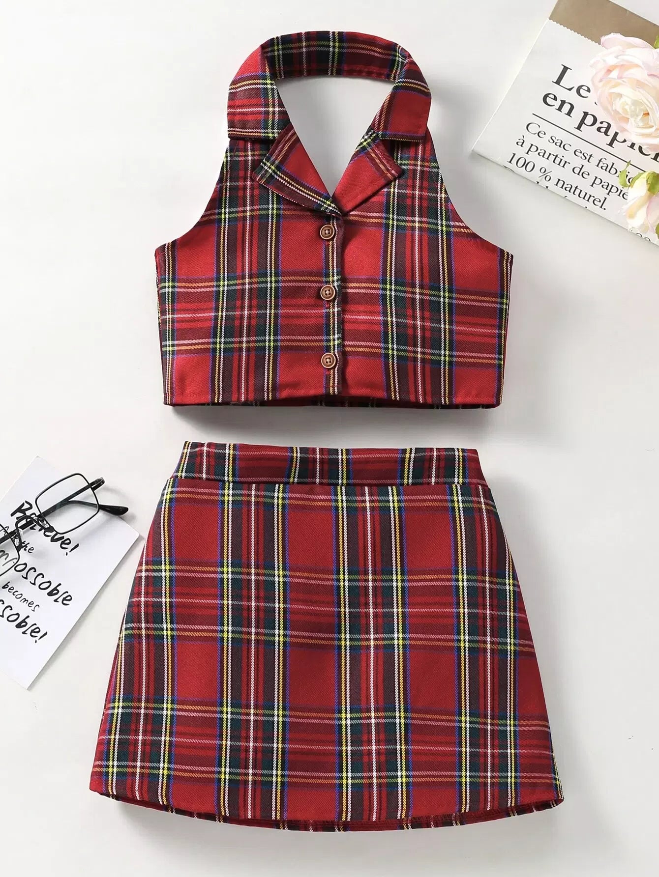 بلوزة وتنورة تارتان بصدر واحد للبنات الصغيرات ذات الرسن الواحد