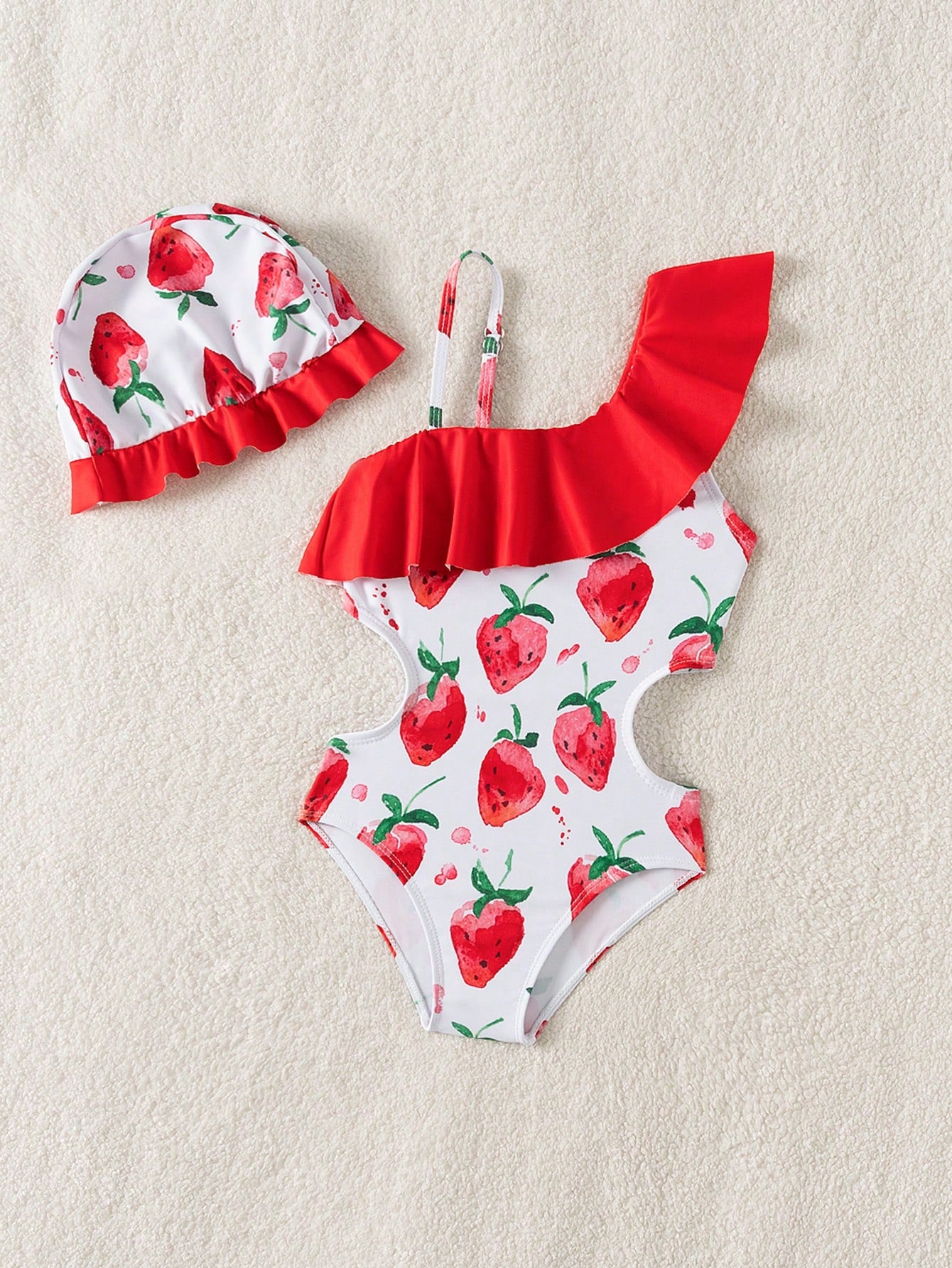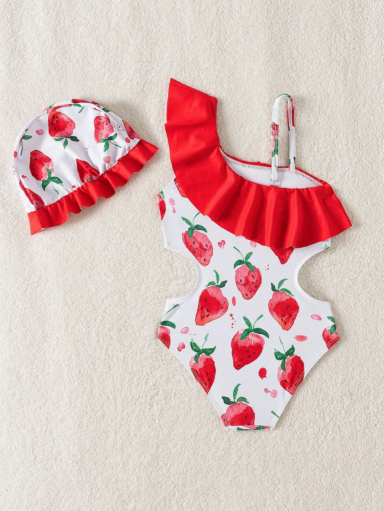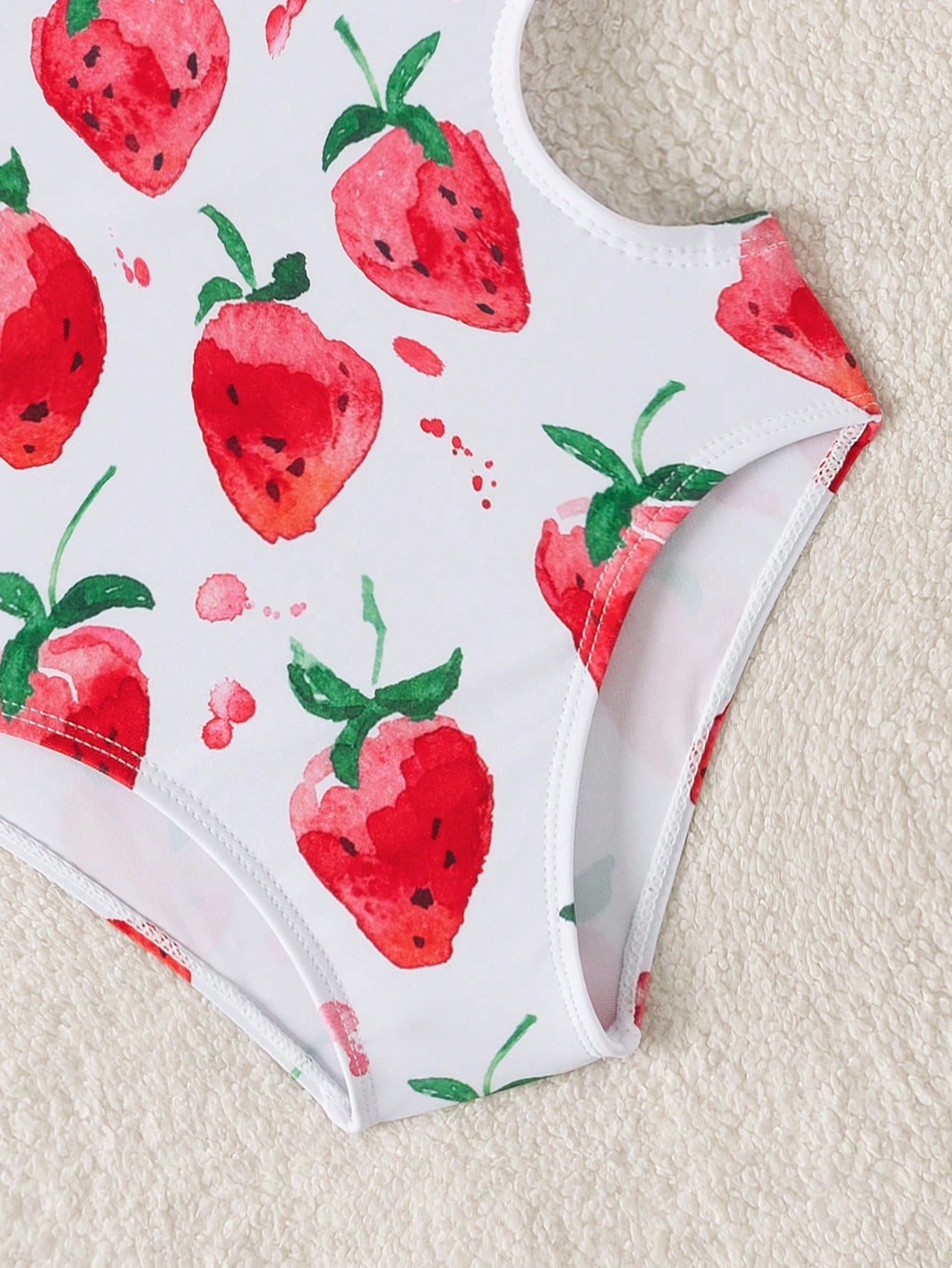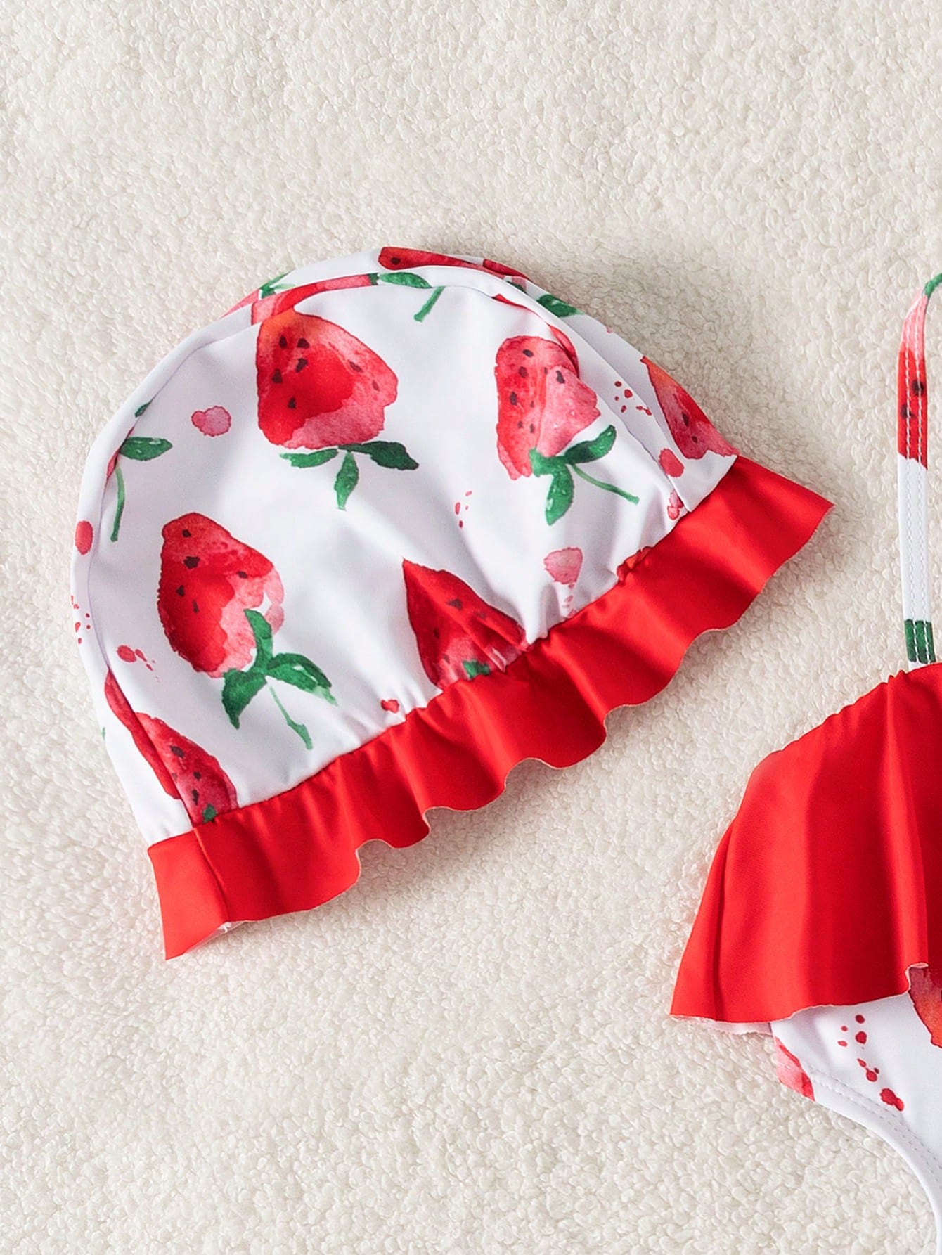 ملابس سباحة مطبوعة بنقشة الفراولة للفتيات الصغيرات بحافة مكشكشة وتصميم مجوف