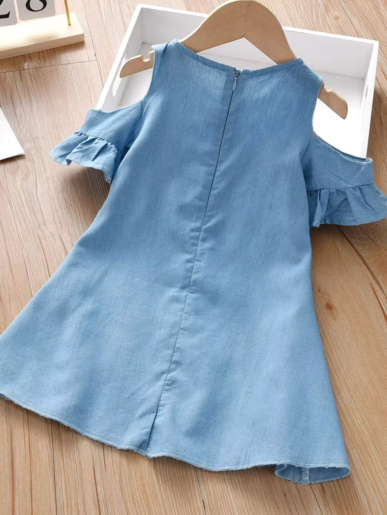 فستان دنيم كارتون كارتون للبنات الصغيرات ذوات الأكتاف الباردة