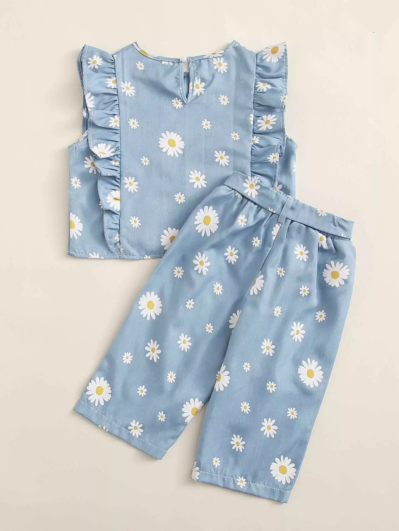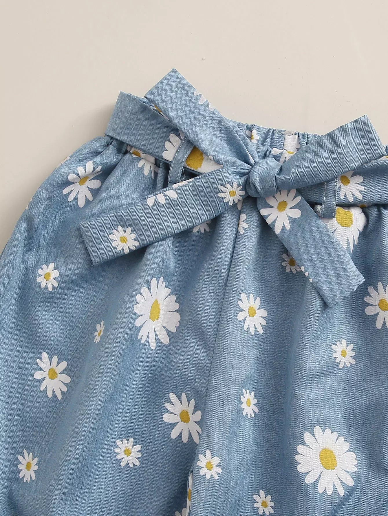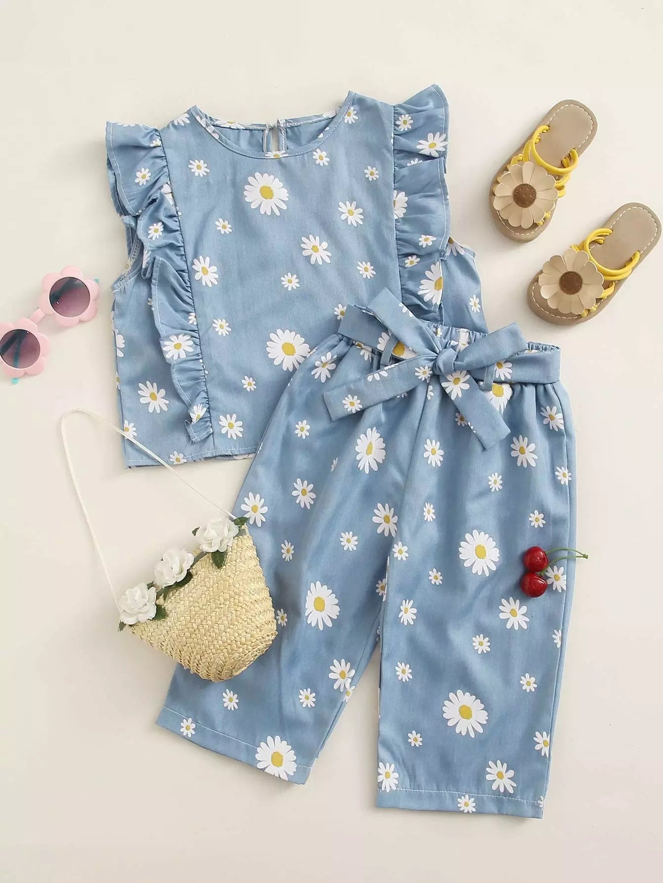 الأطفال - بلوزة ديزي من الدنيم مكشكشة للفتيات الصغيرات مع جينز بحزام