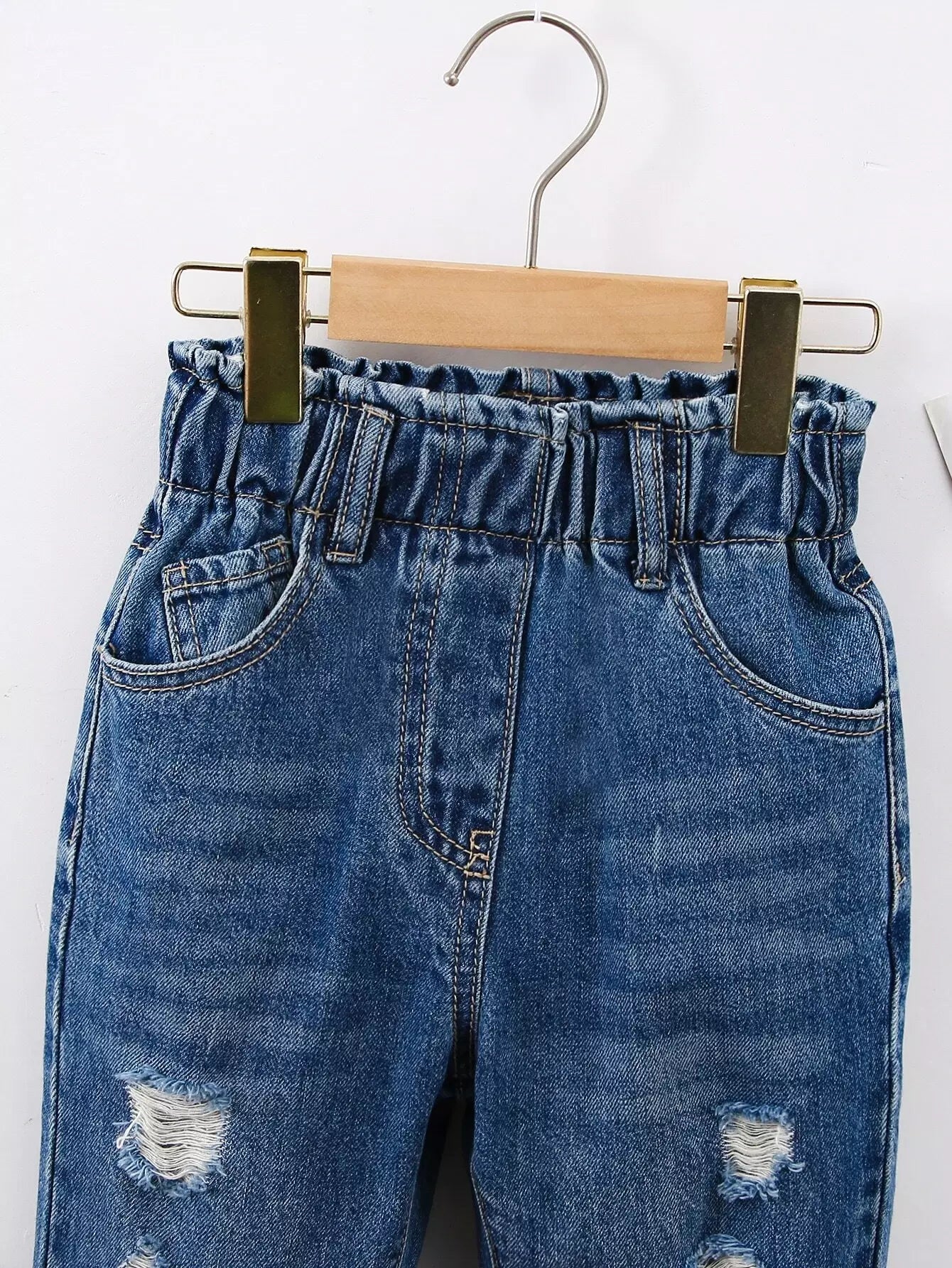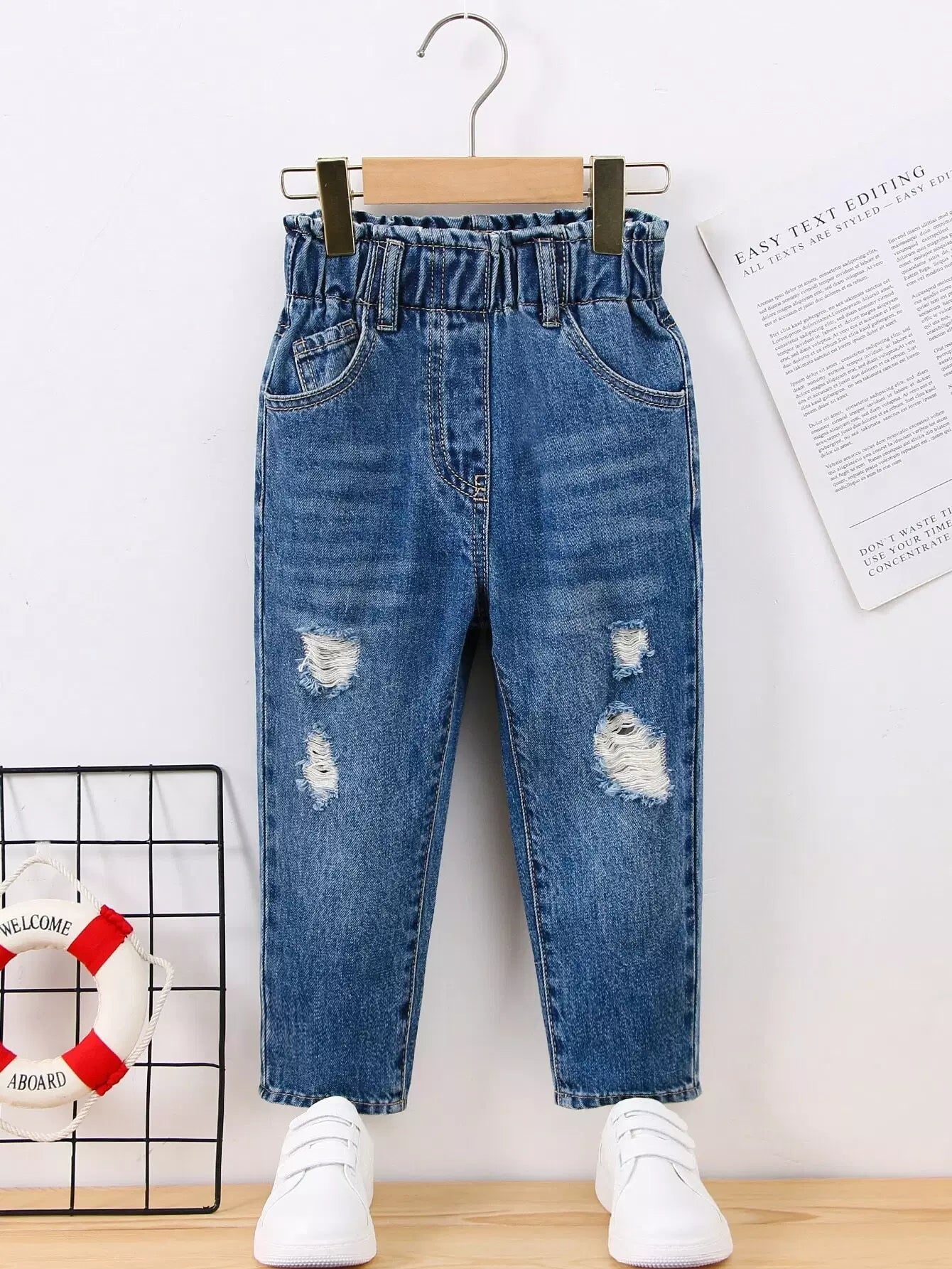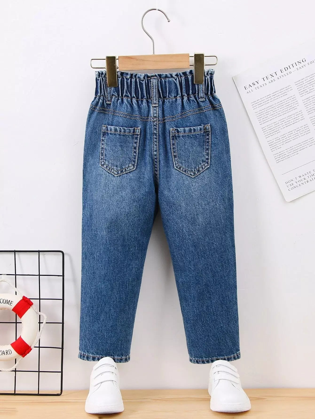 بنطلون جينز ممزق مغسول بشعار قطة وخصر مطاطي للفتيات الصغيرات