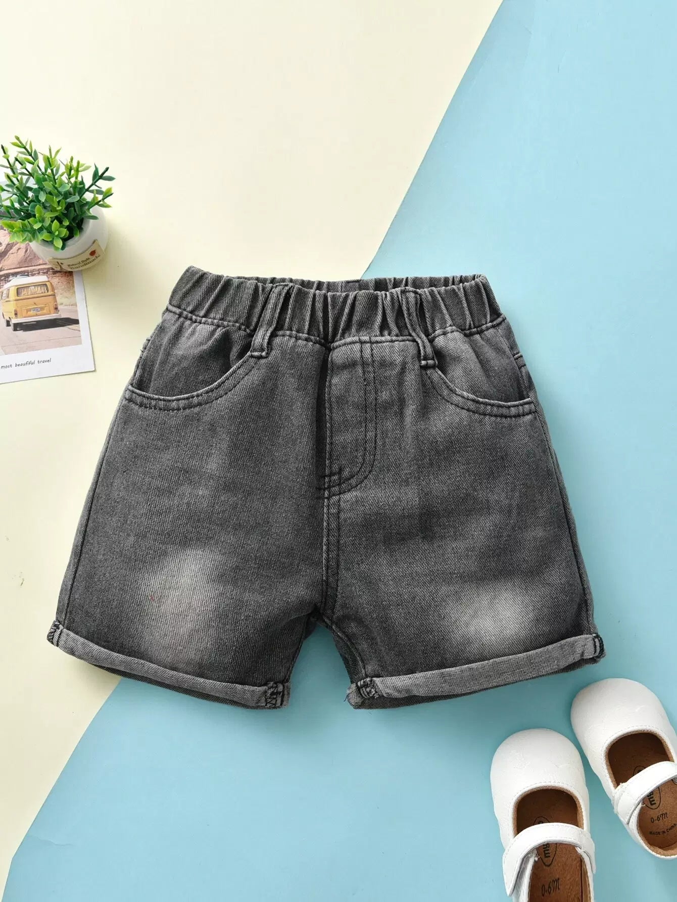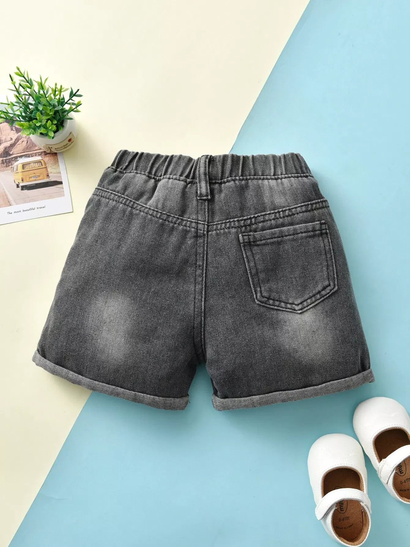 الأطفال - شورت جينز للفتيات الصغيرات بحاشية قابلة للطي بجيب