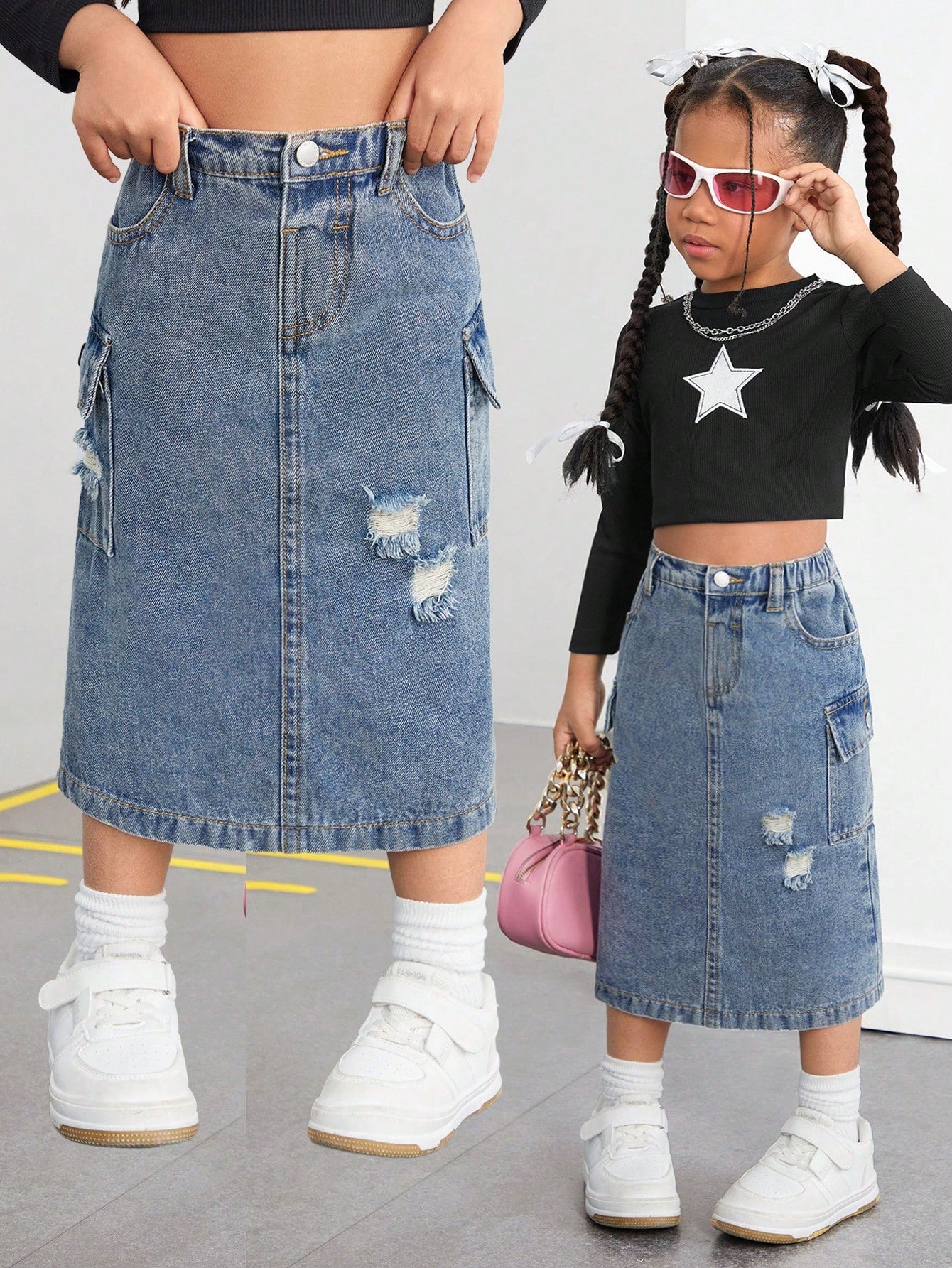Young Girl Y2K Button Waist Belt Loop Pocket Fashion Street Style Blue Denim Cargo Mini Skirt,Kid Girl