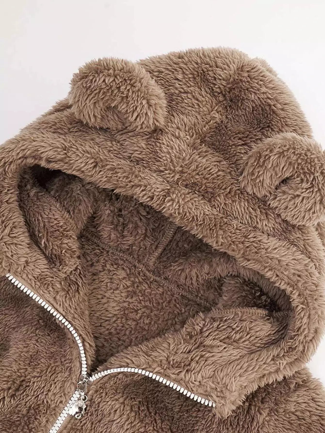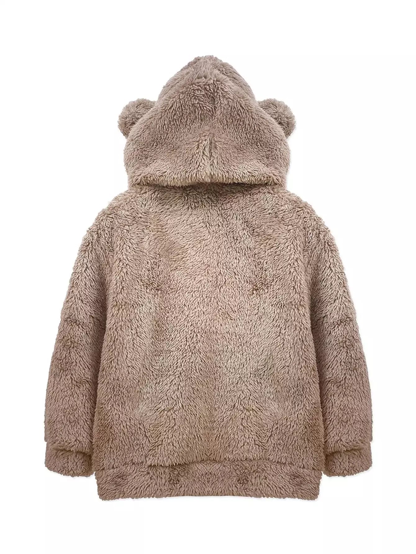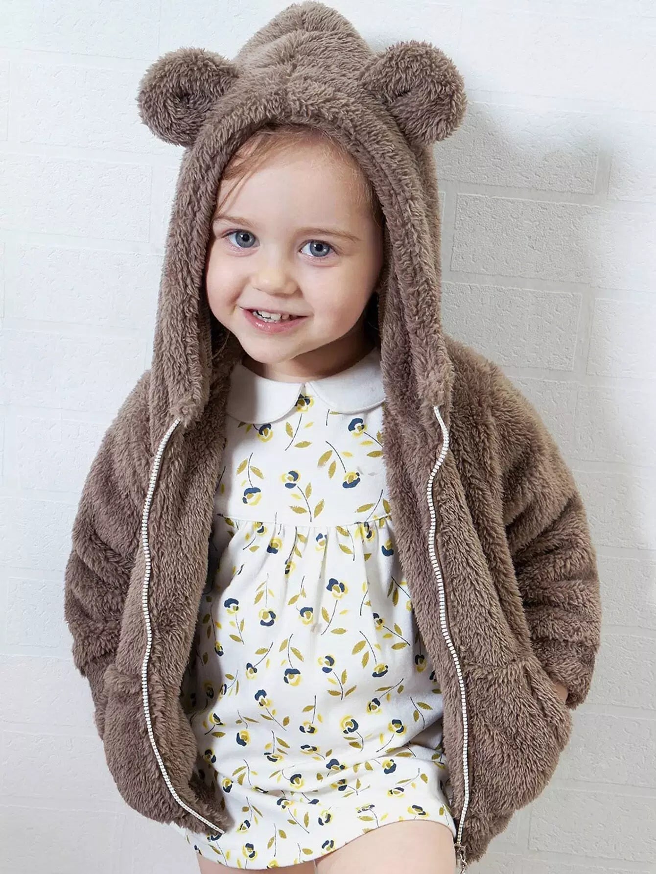 جاكيت تيدي بغطاء رأس مرقع بسحاب ثلاثي الأبعاد للبنات الصغار