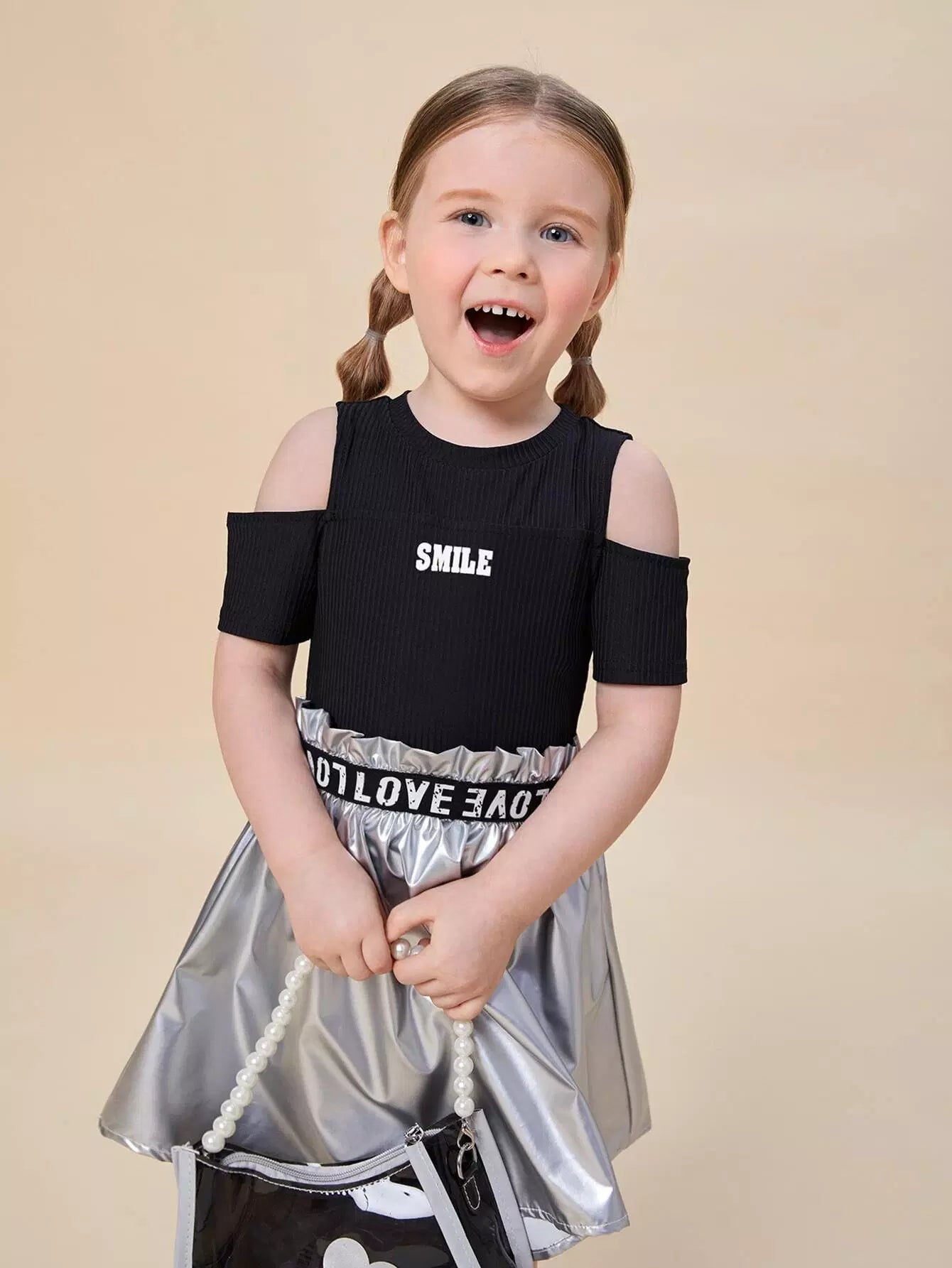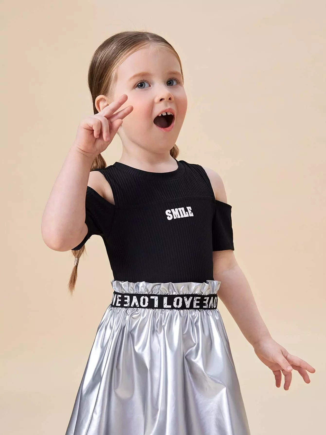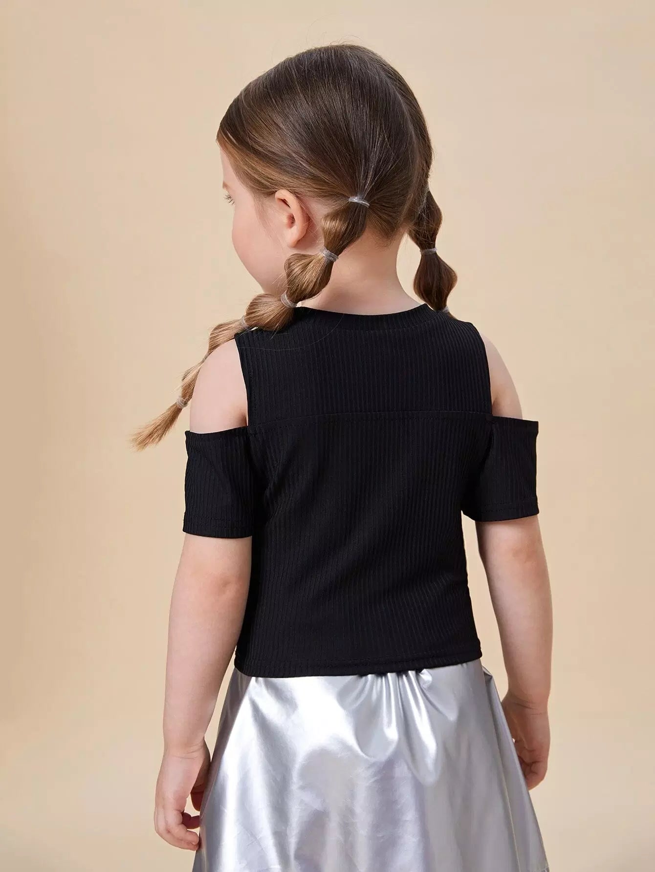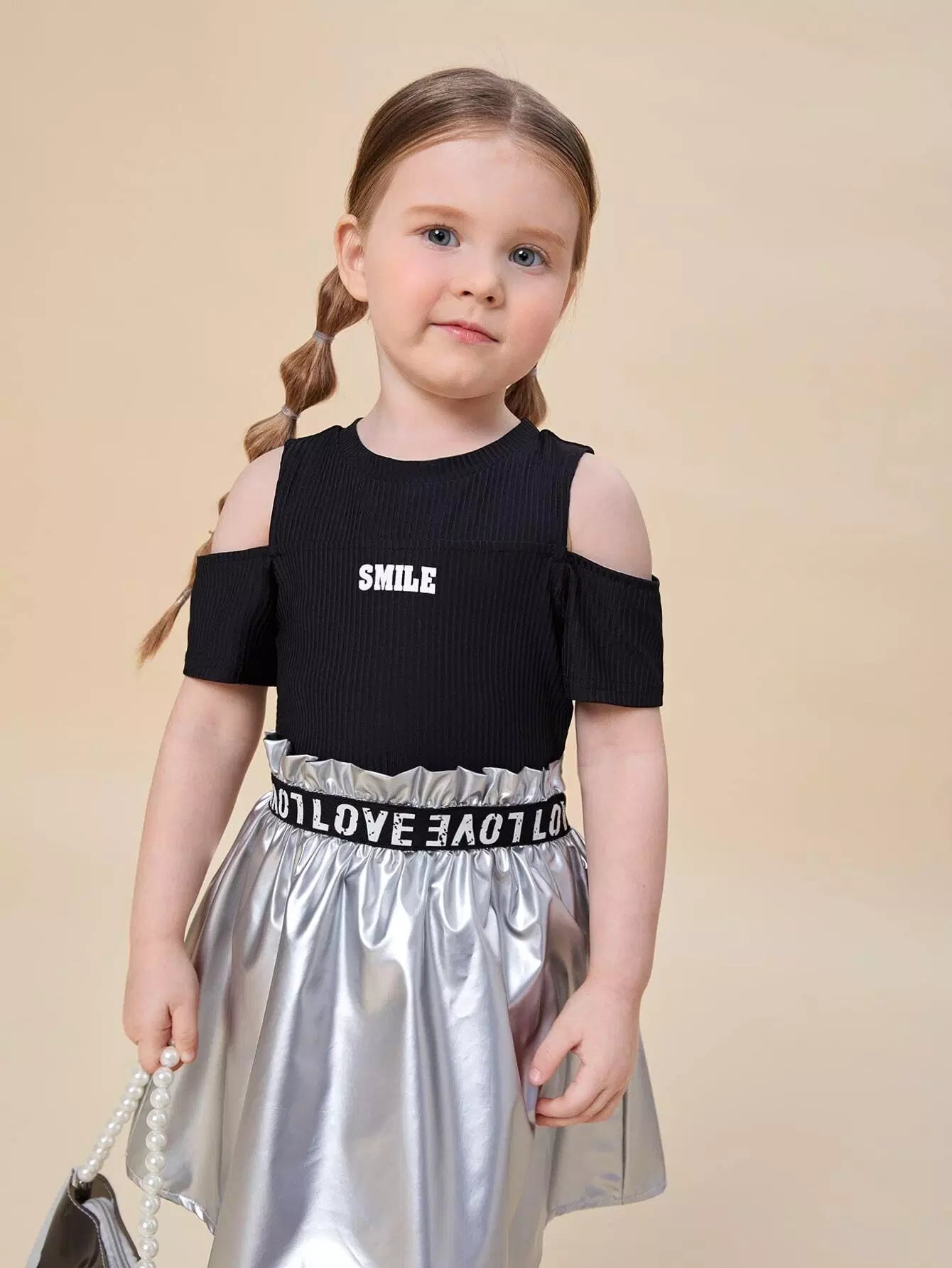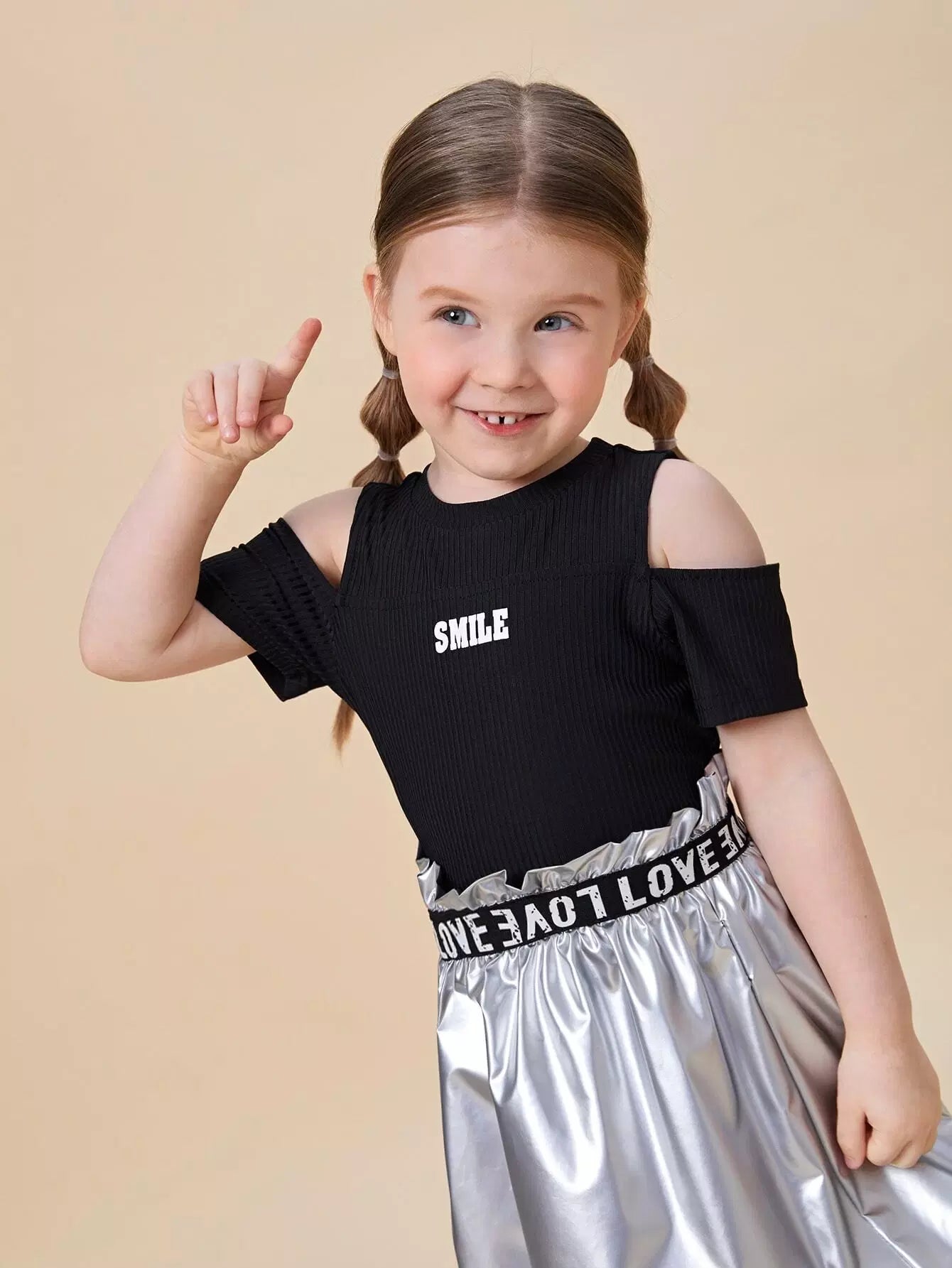 تي شيرت برسومات وأحرف مكشوفة الكتفين للفتيات الصغيرات