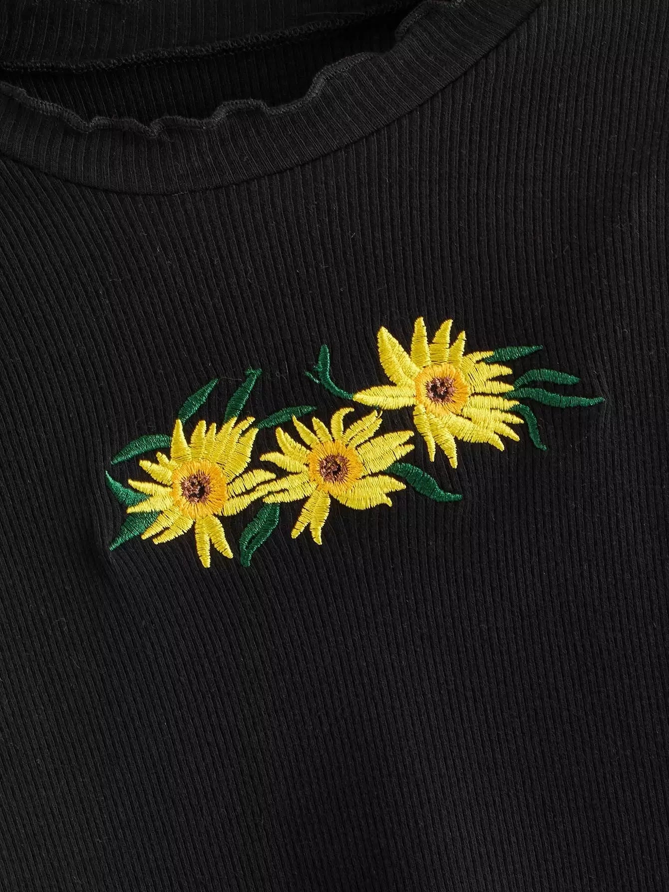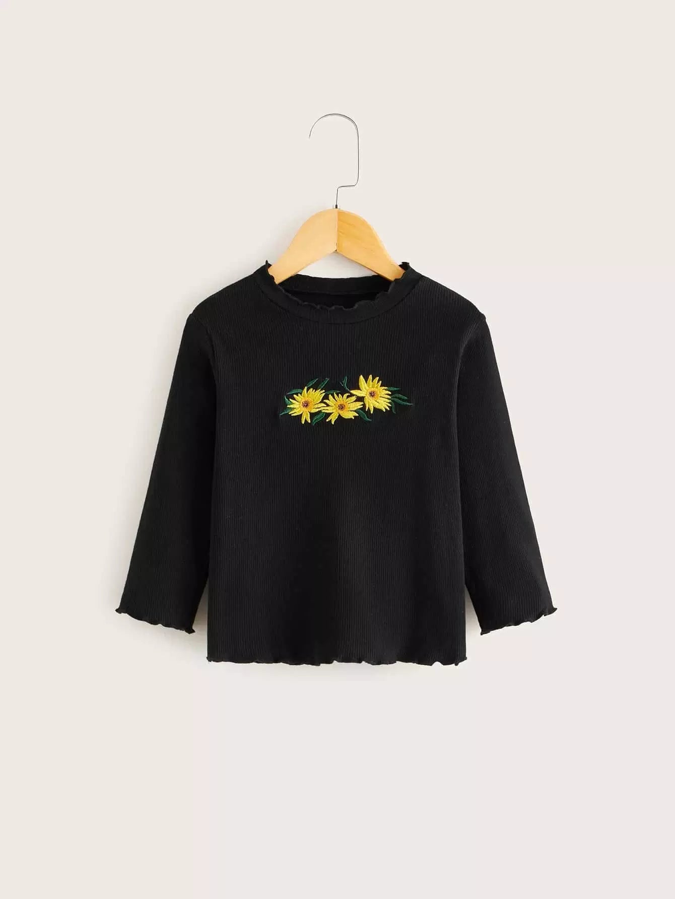 تي شيرت مطرز بتطريز زهرة دوار الشمس للبنات الصغيرات