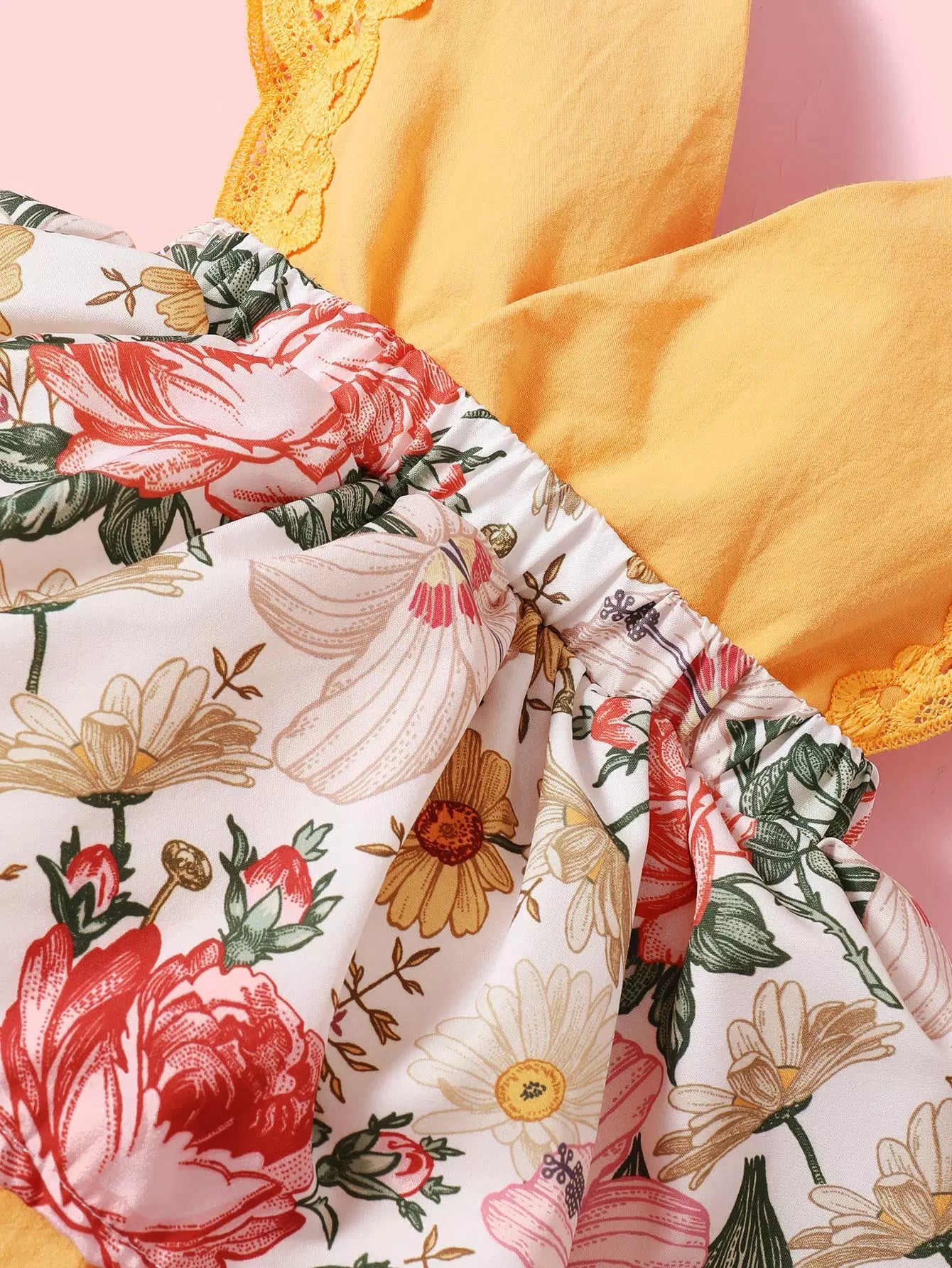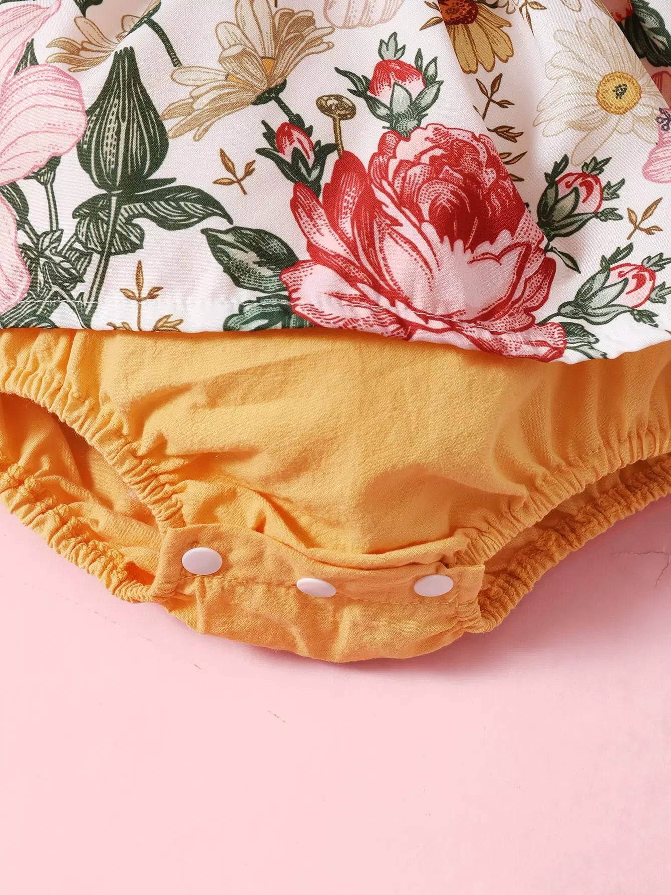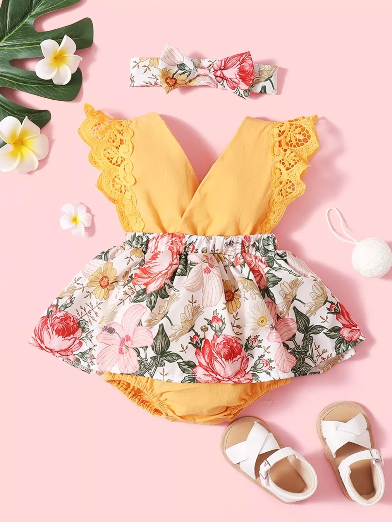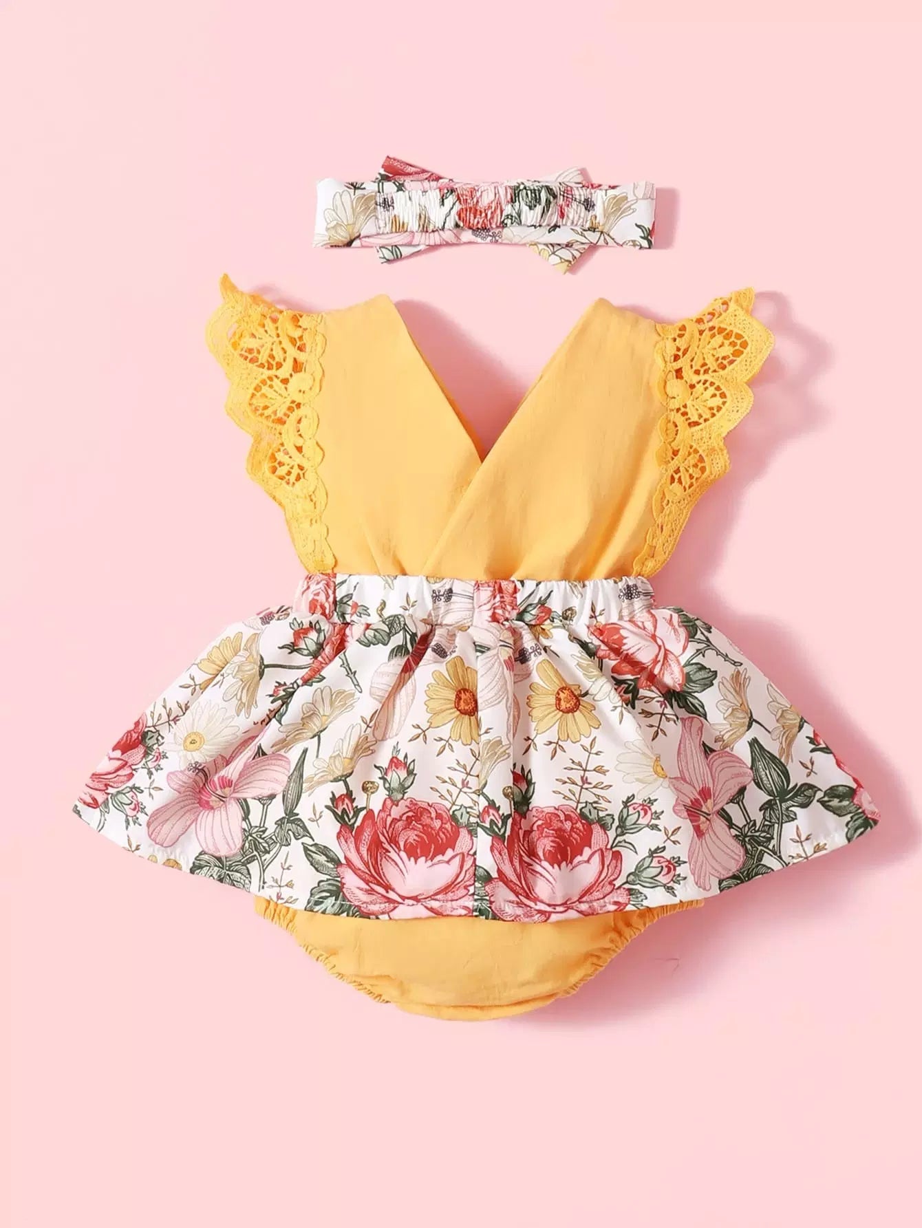 فستان طفلة رضيعة، فستان وعصبة رأس بطبعة زهور من الدانتيل