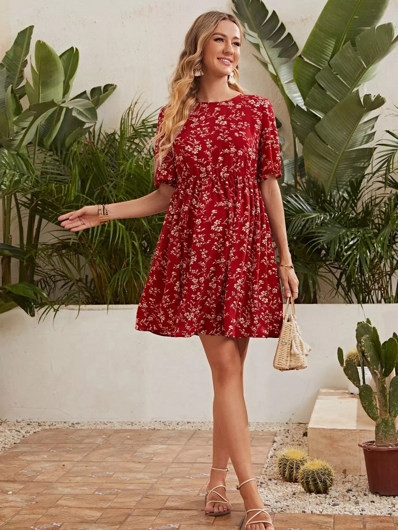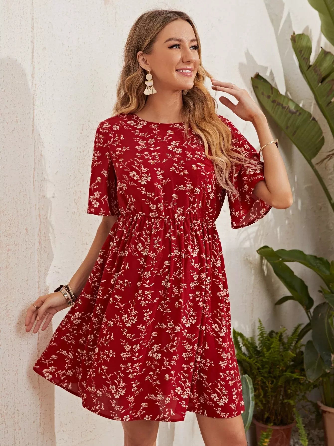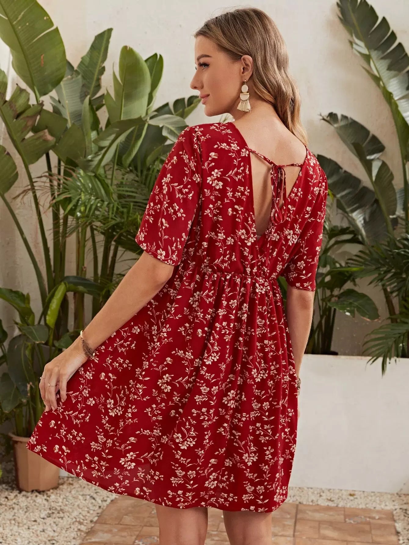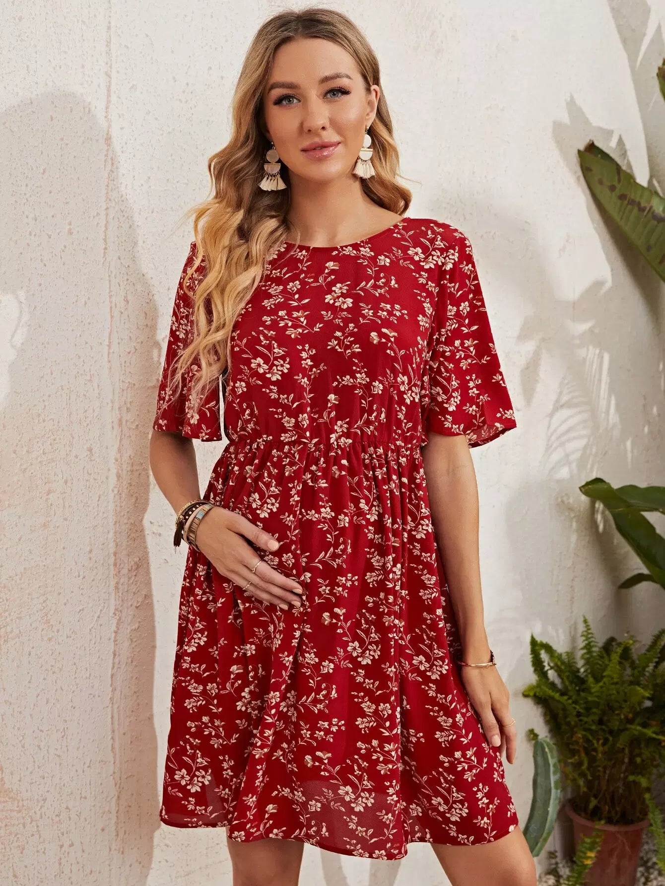 فستان بأكمام جرس للحوامل بأربطة على الظهر مزين بالزهور