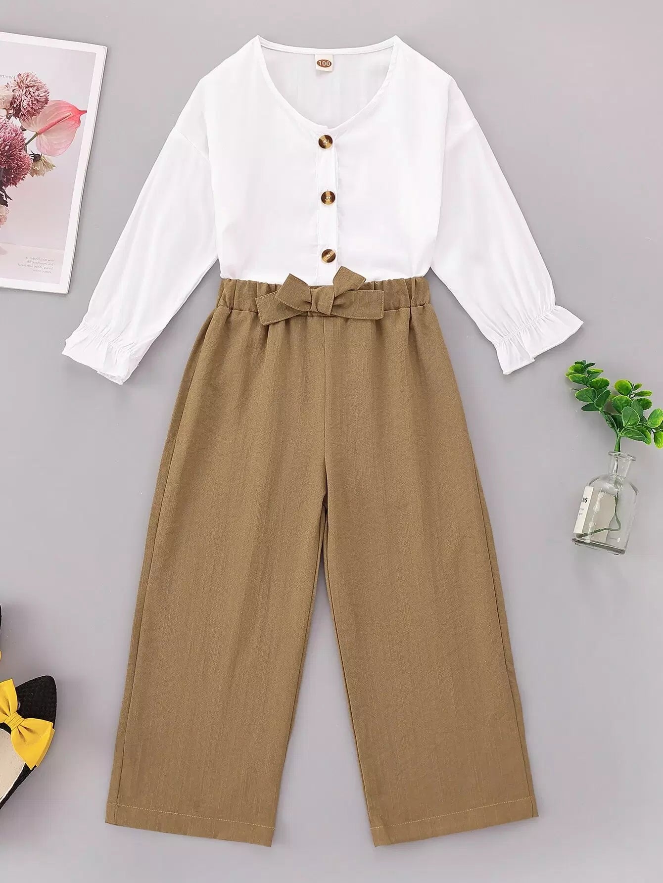 الأطفال - قميص علوي بأكمام واسعة وأزرار للفتيات الصغيرات وسروال أمامي بفيونكة