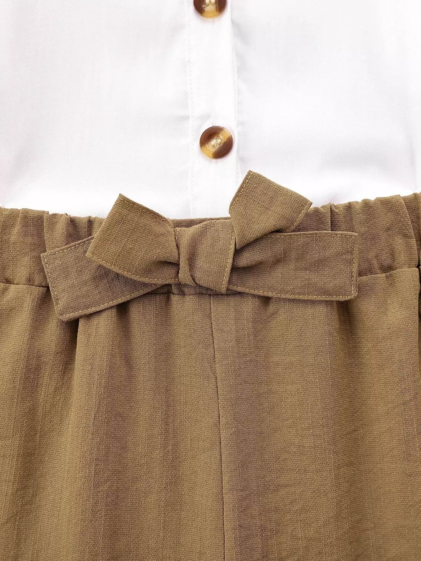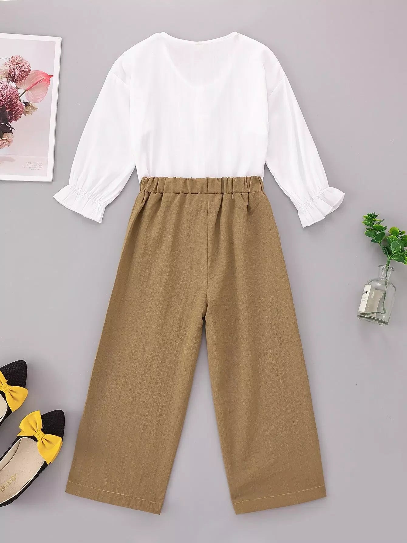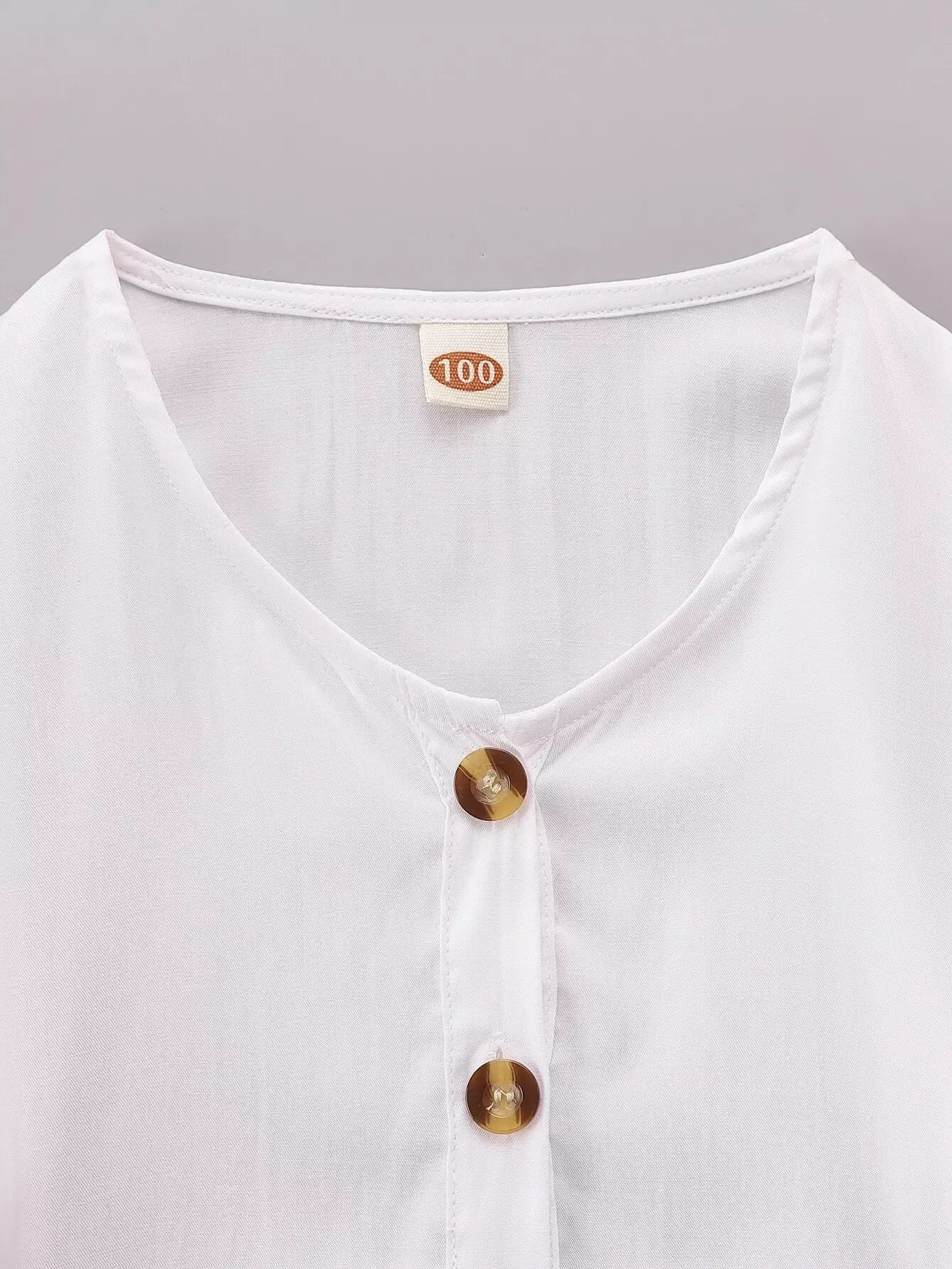 بلوزة بأزرار بأكمام منفوشة للبنات الصغيرات وبنطال بعقدة أمامية
