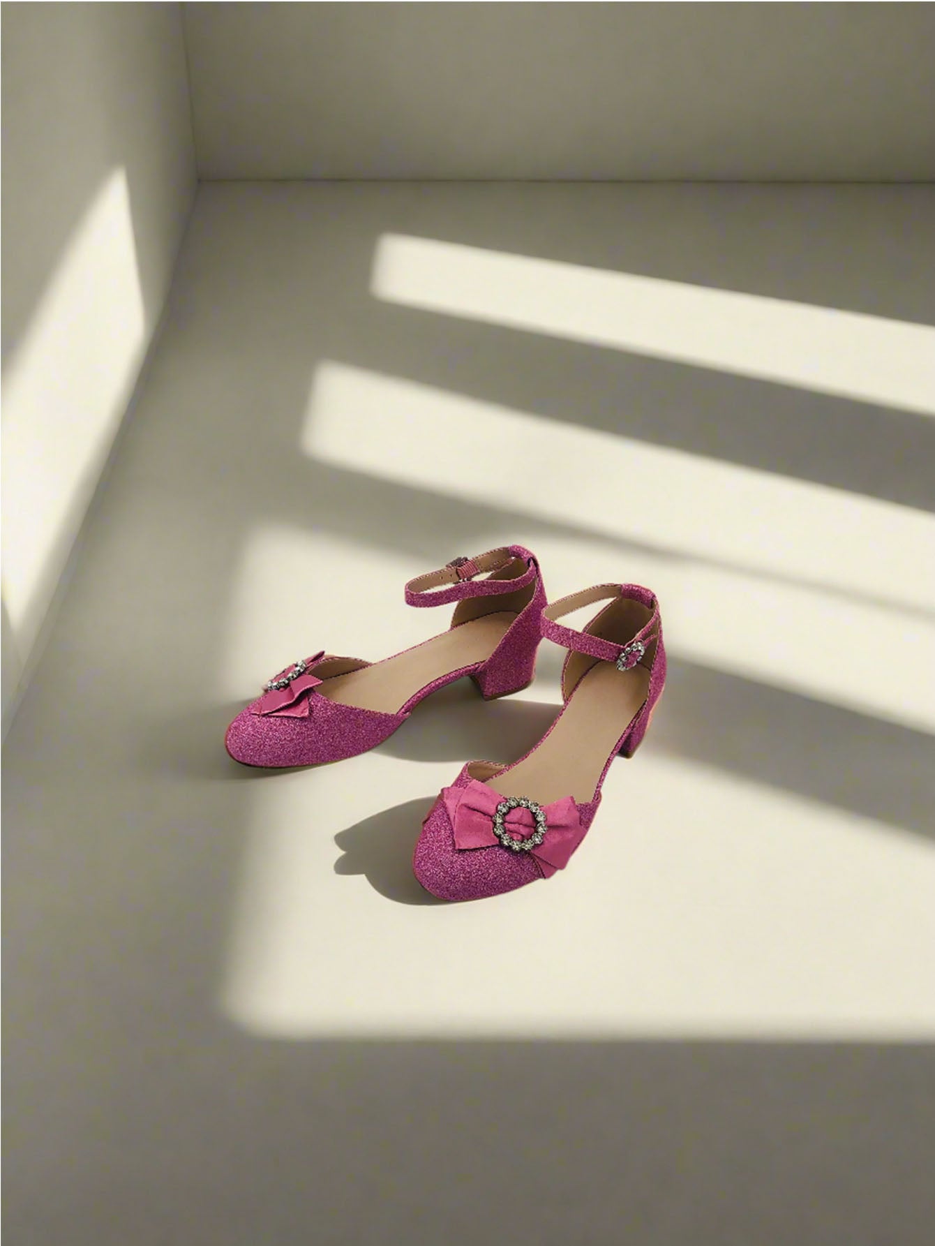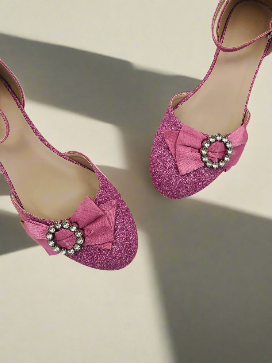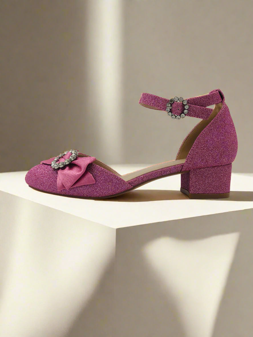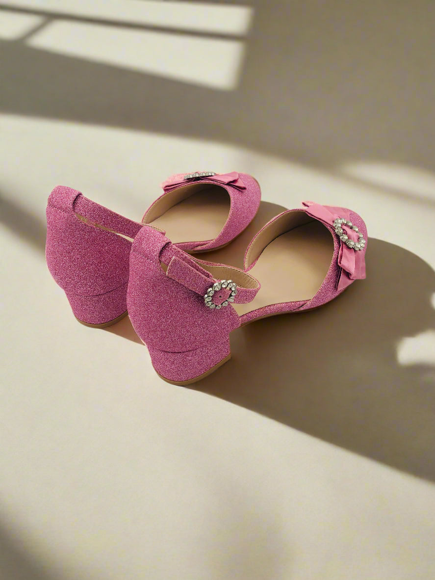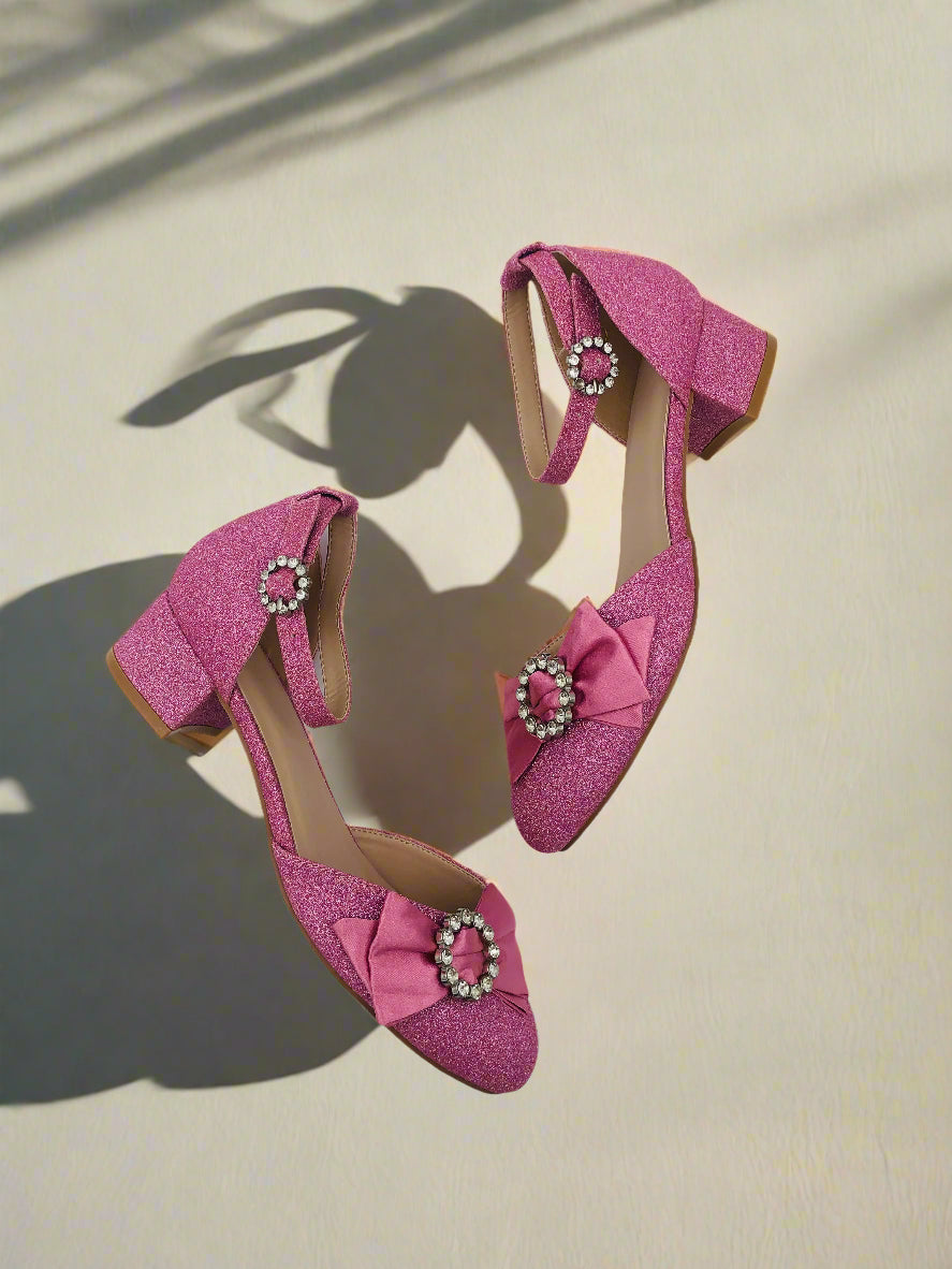 حذاء حفلات وردي اللون للبنات، لامع و يتميز بحزام للكاحل، مقدمة مدورة مع فيونكة أمامية، وكعب سميك منخفض.