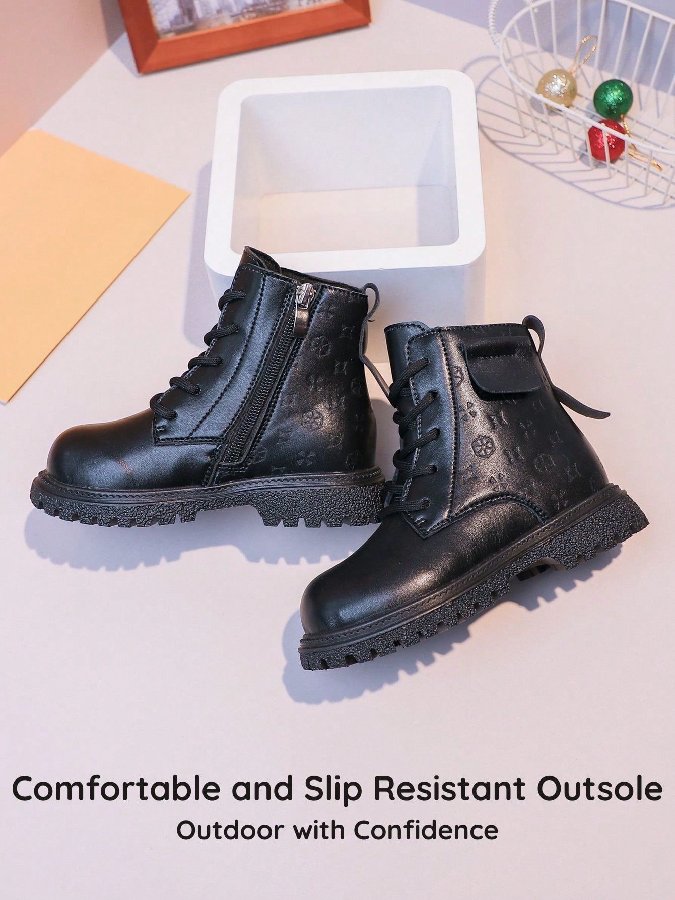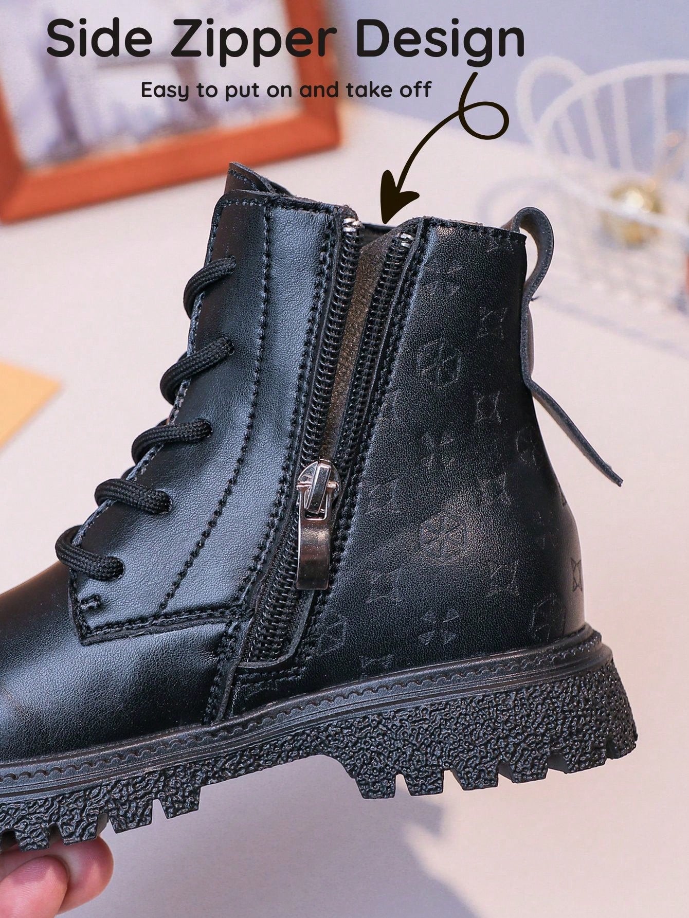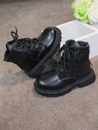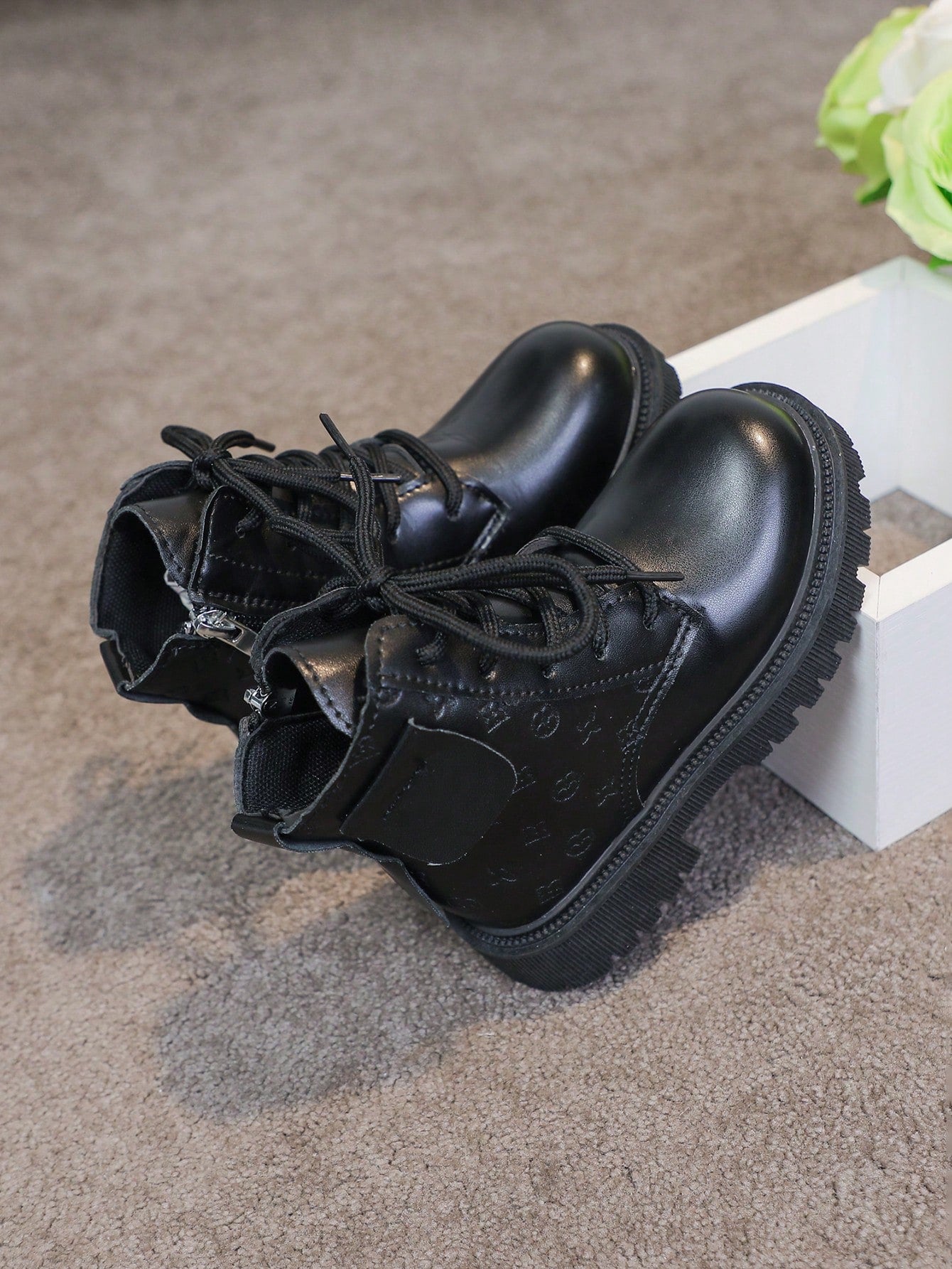زوج واحد من أحذية الأطفال الجديدة ثلاثية الأبعاد المزخرفة بالزهور - تصميم من الجلد الصناعي الأسود مع سحاب على شكل قلب