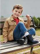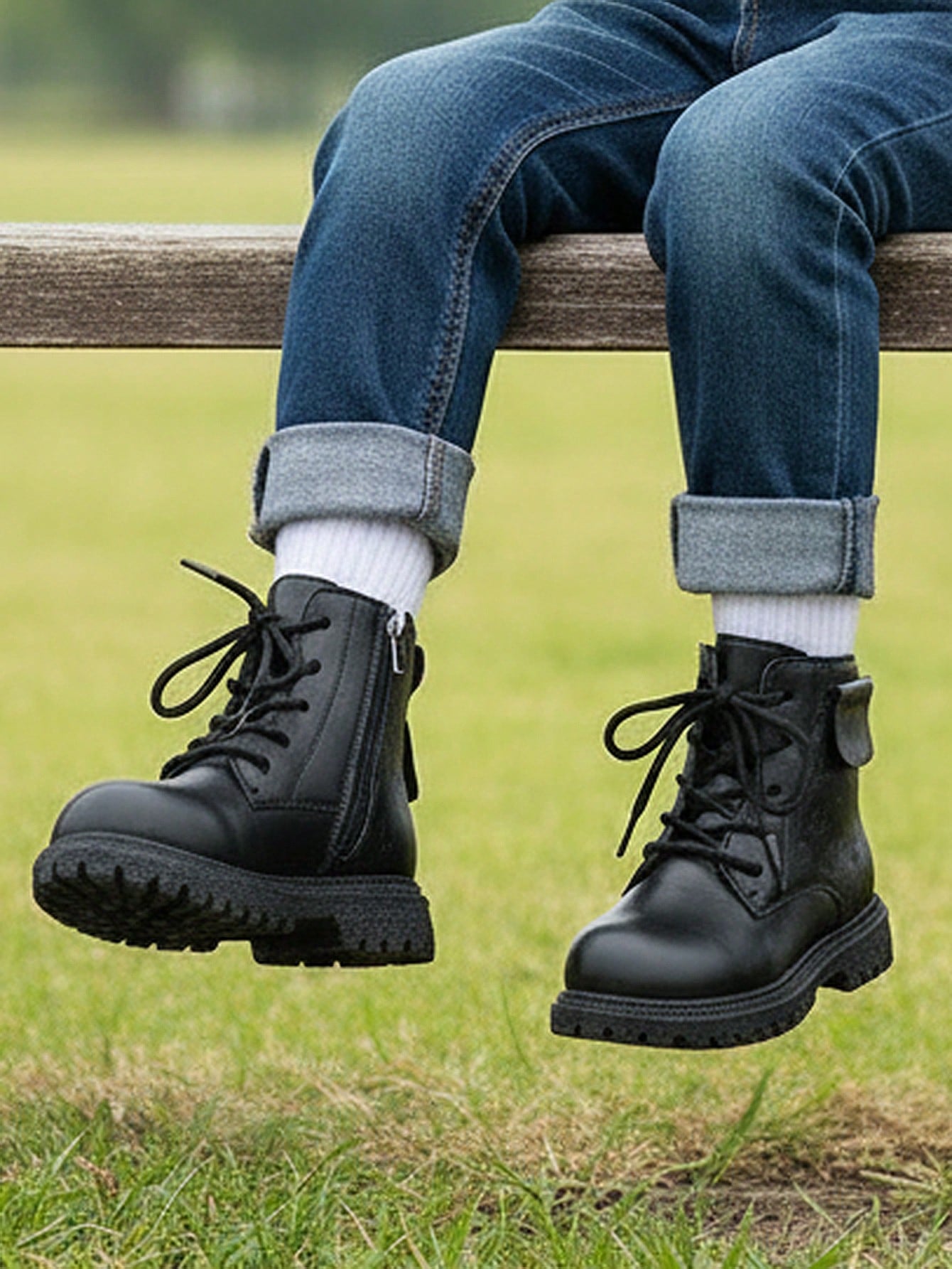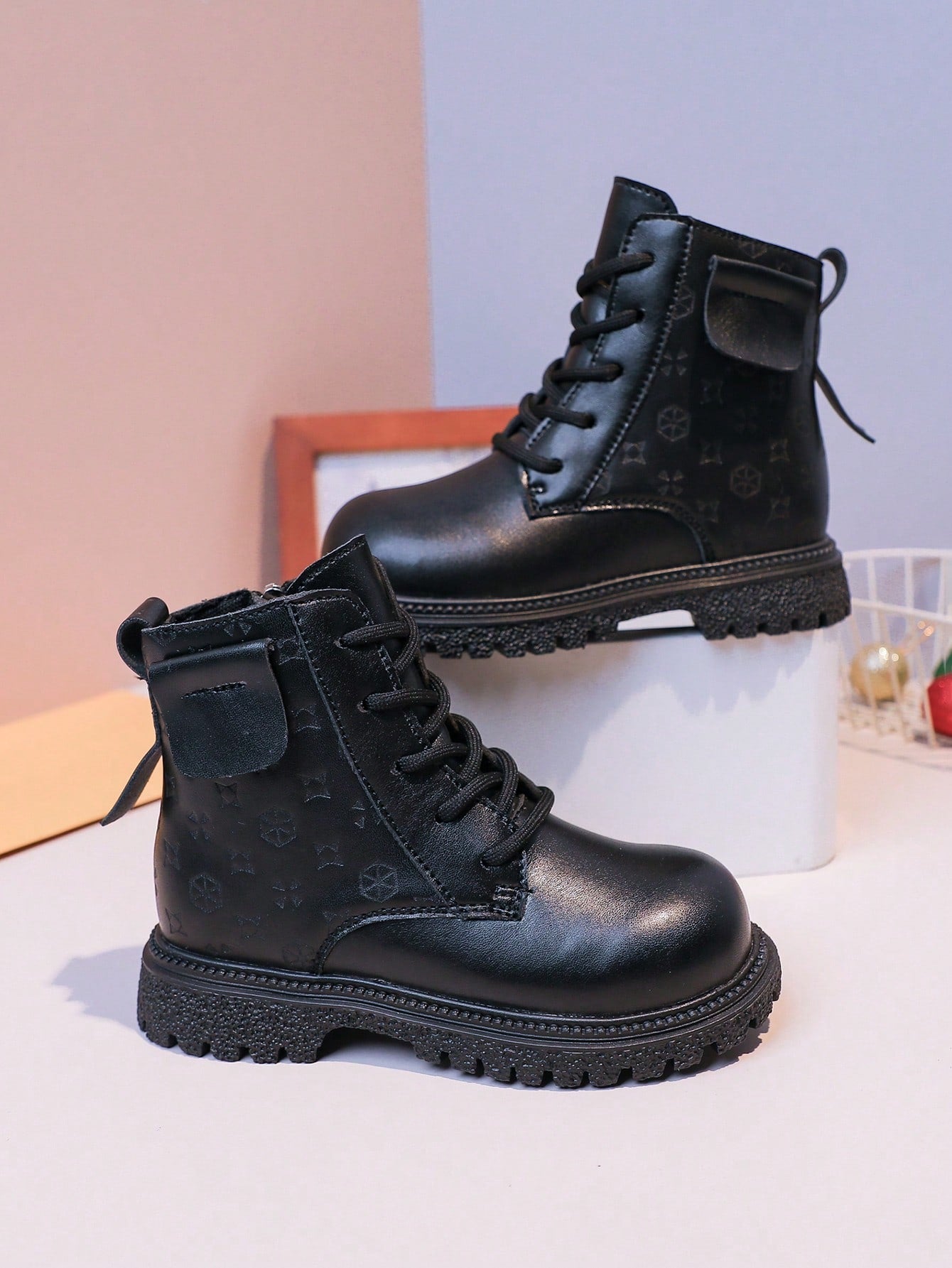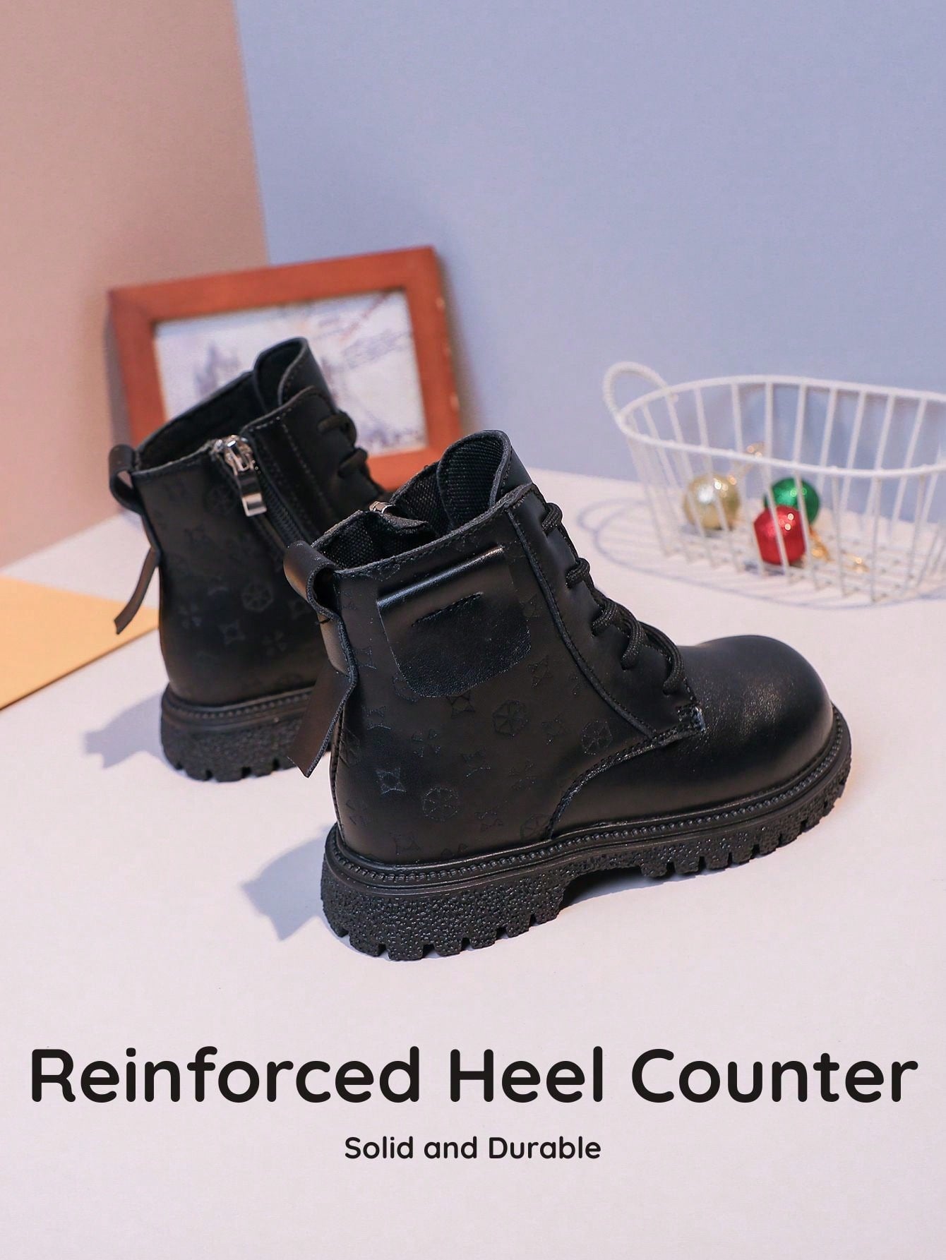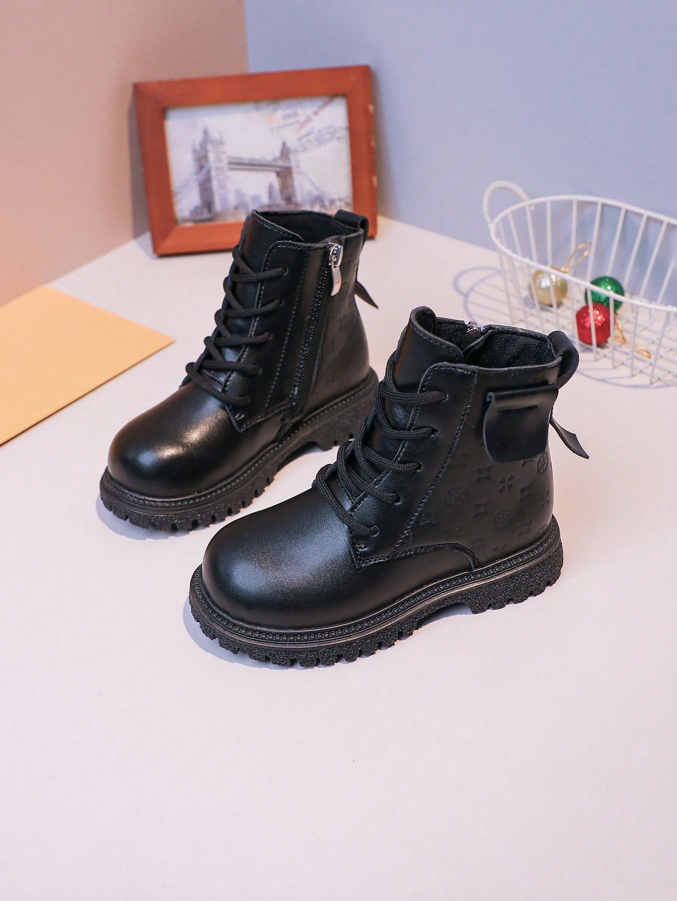 زوج واحد من أحذية الأطفال الجديدة ثلاثية الأبعاد المزخرفة بالزهور - تصميم من الجلد الصناعي الأسود مع سحاب على شكل قلب
