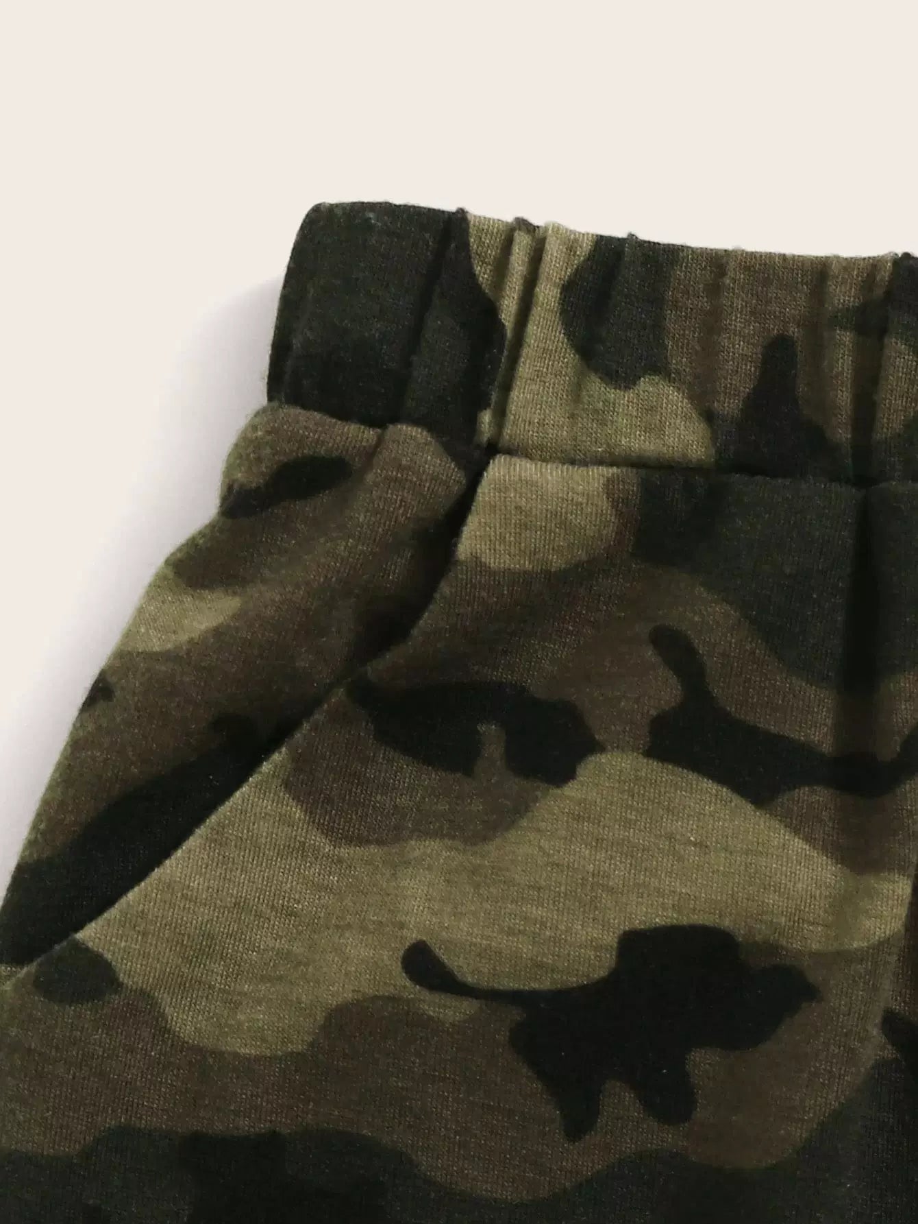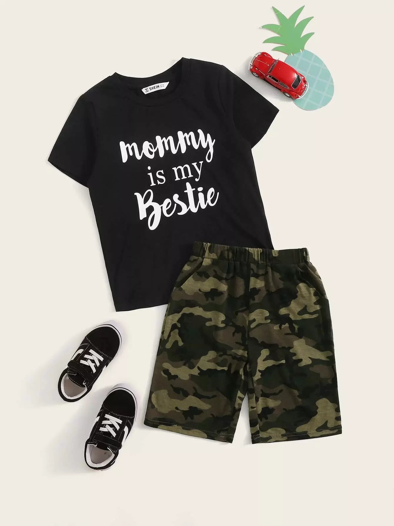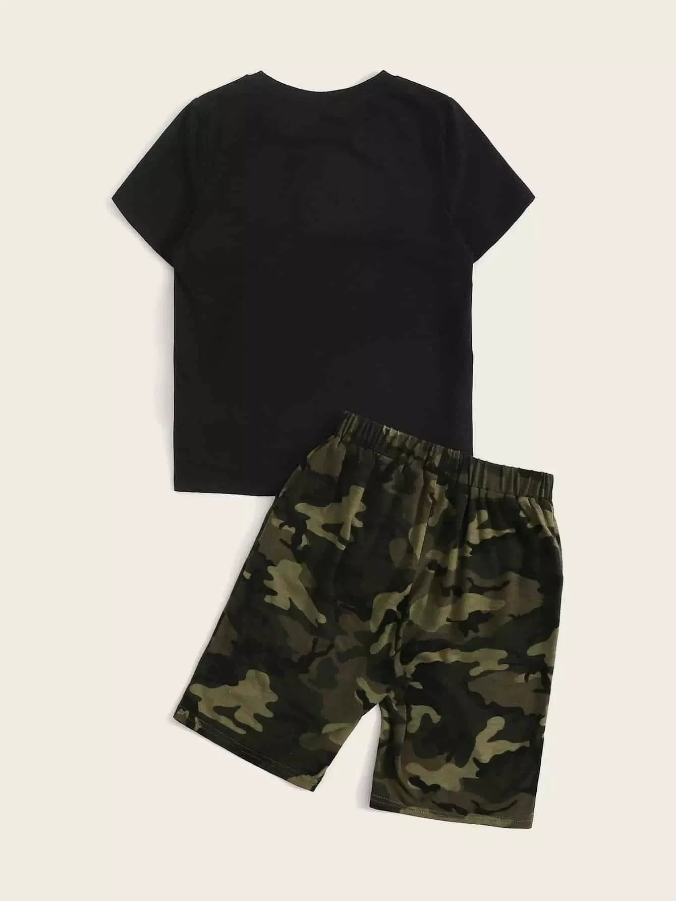 طقم تي شيرت برسومات شعارات وشورت مموه للأولاد