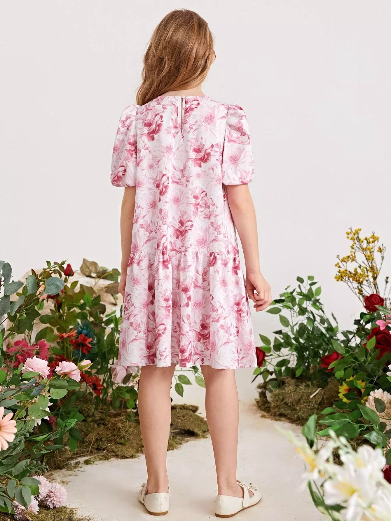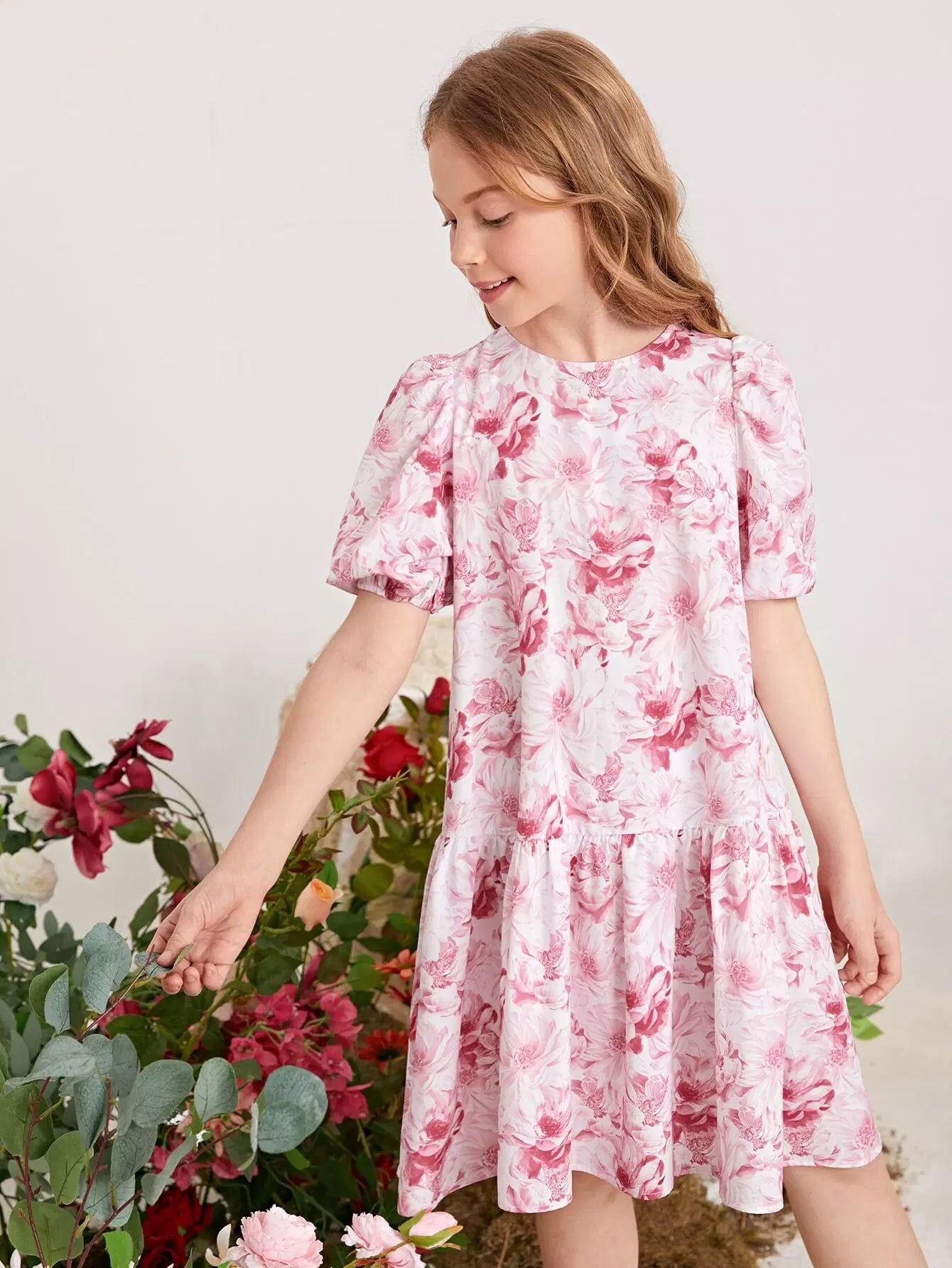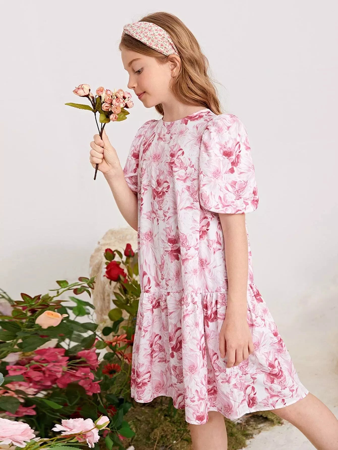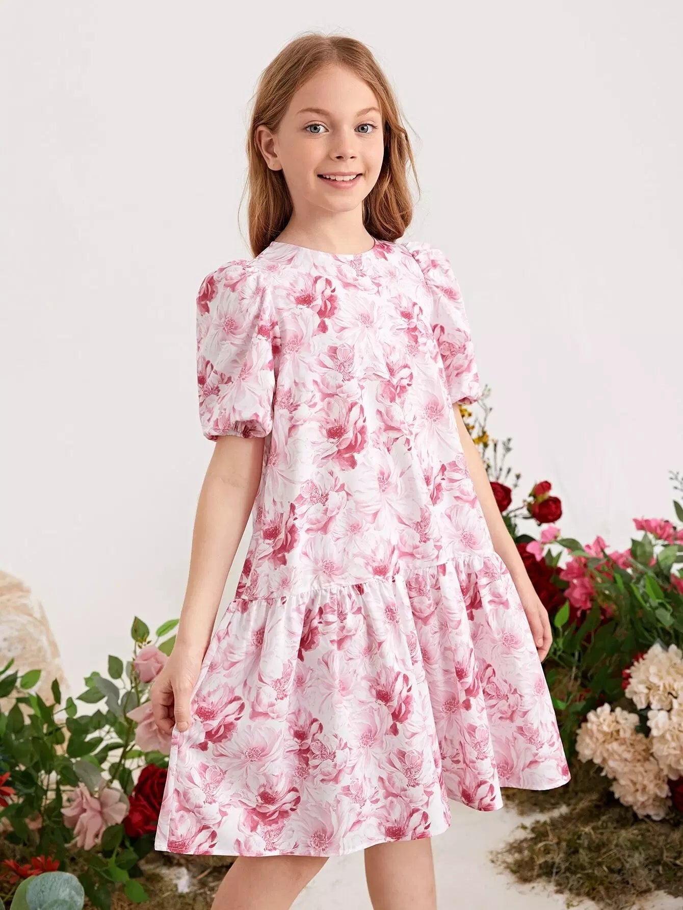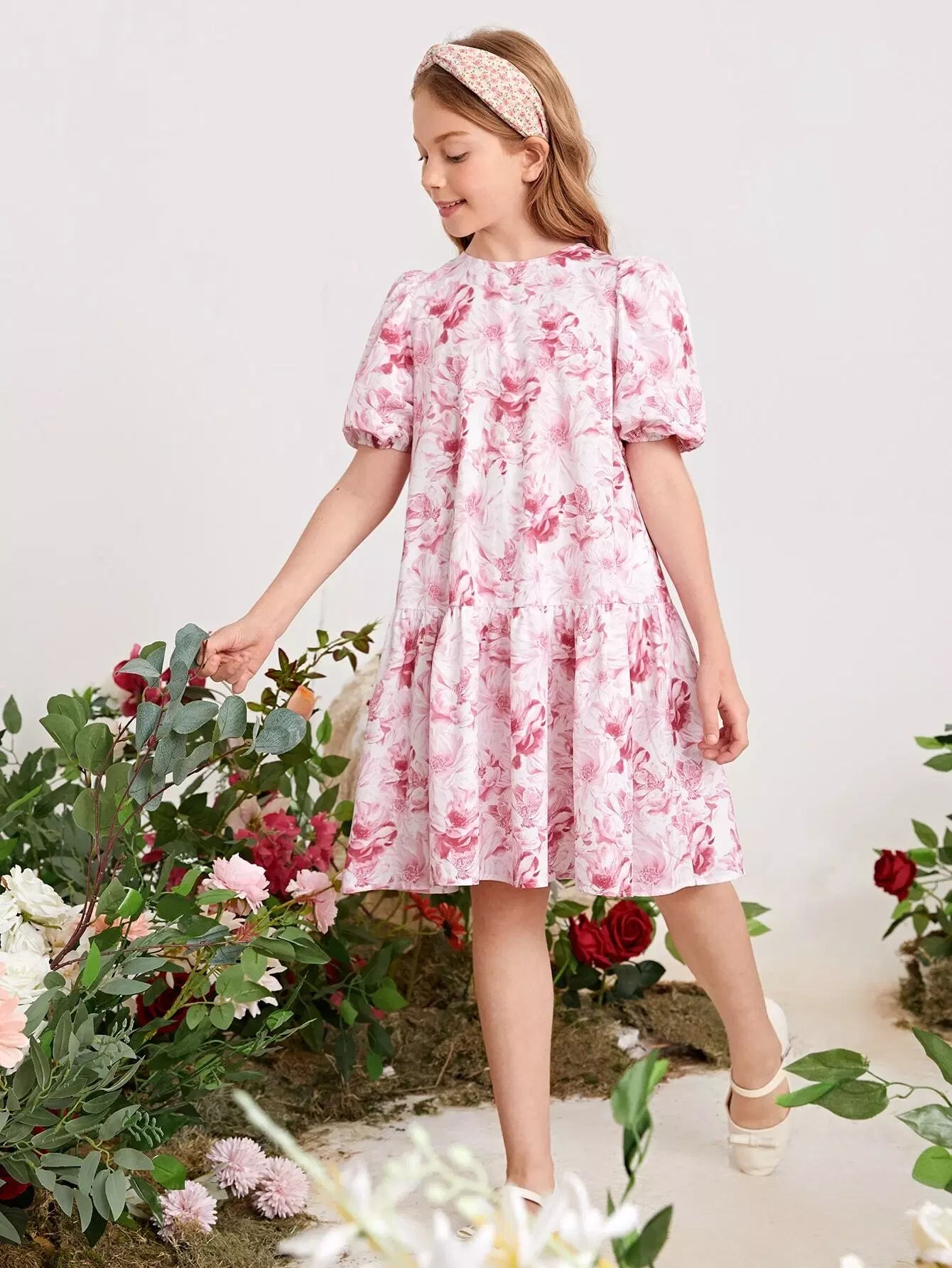 فستان بناتي بأكمام منفوخة وطبعات زهور