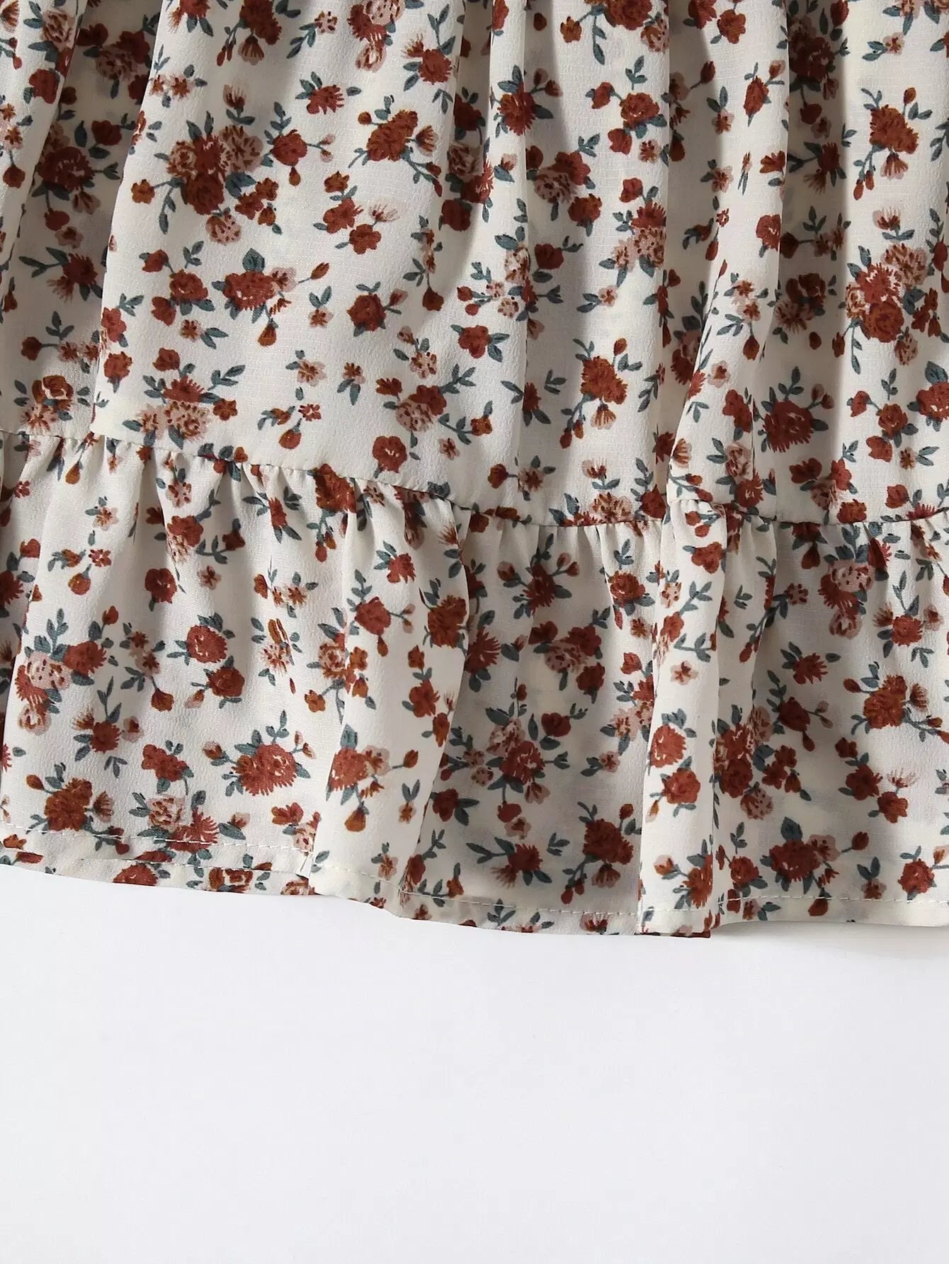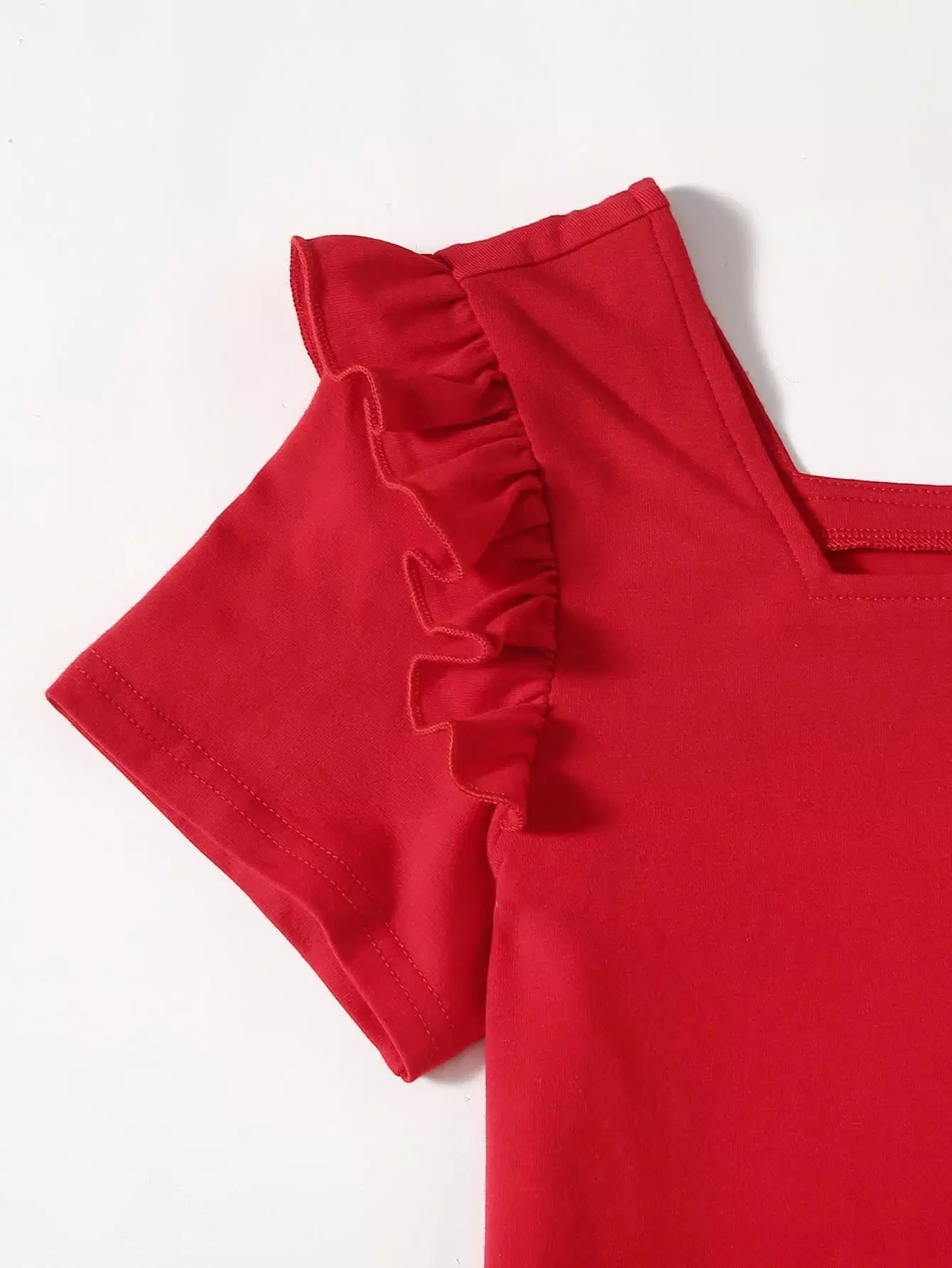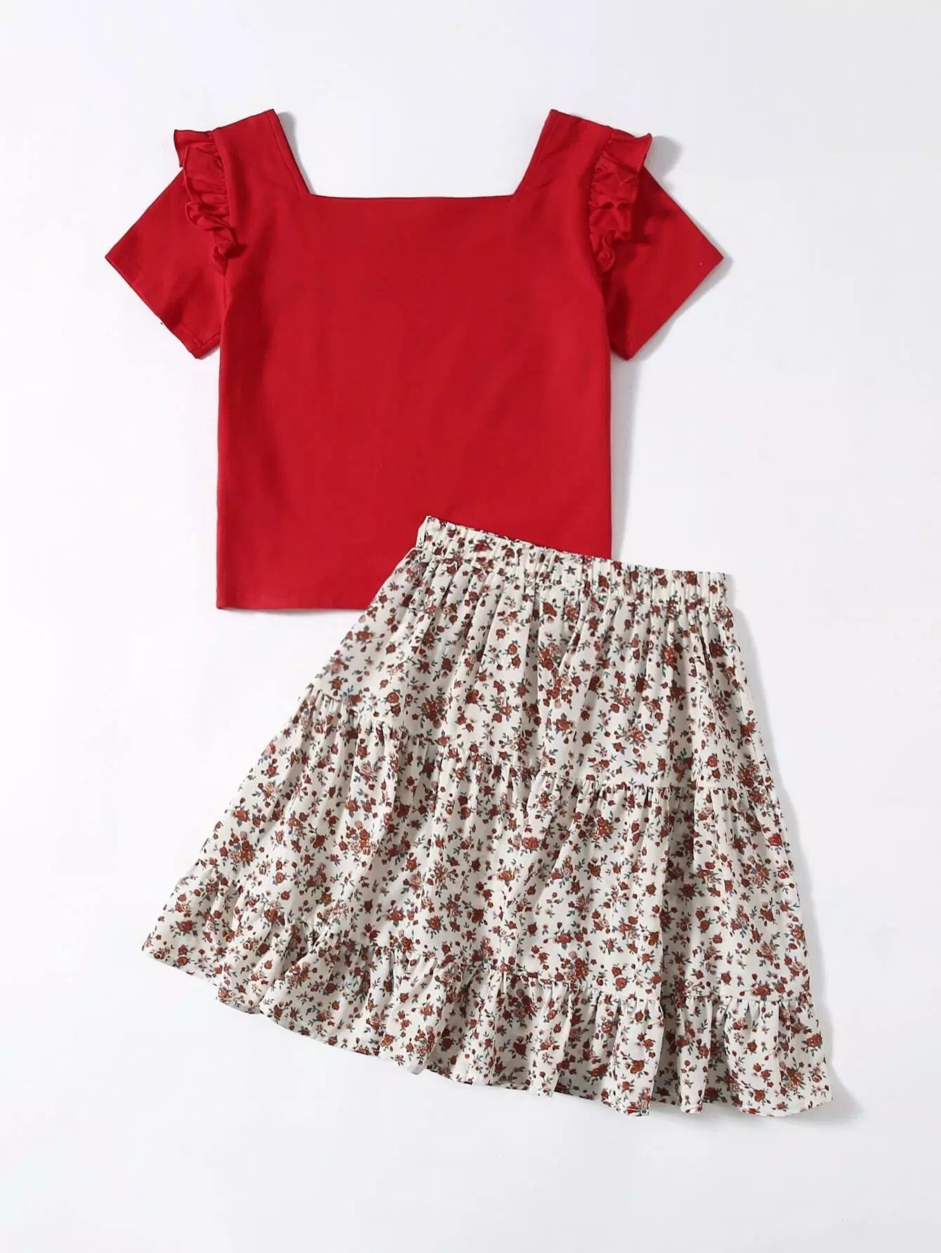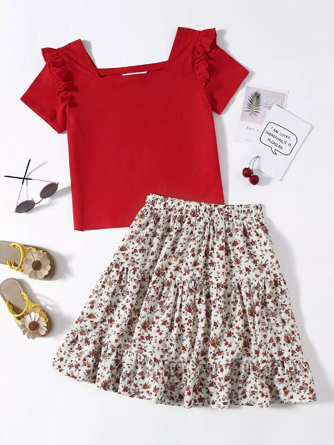 طقم بناتي من بلوزة ذات رقبة مربعة وحواف مكشكشة وتنورة مزينة بنقشة الزهور