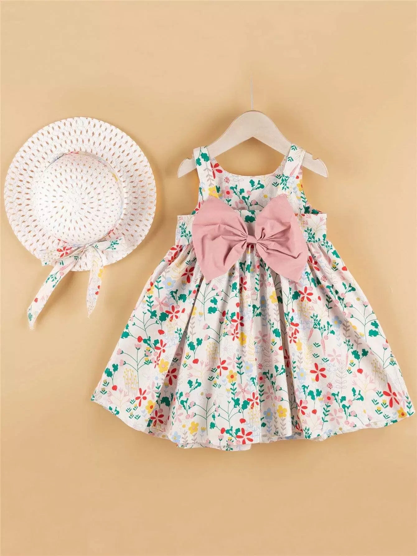 فستان بناتي صغيرات بعقدة على شكل زهور مع قبعة
