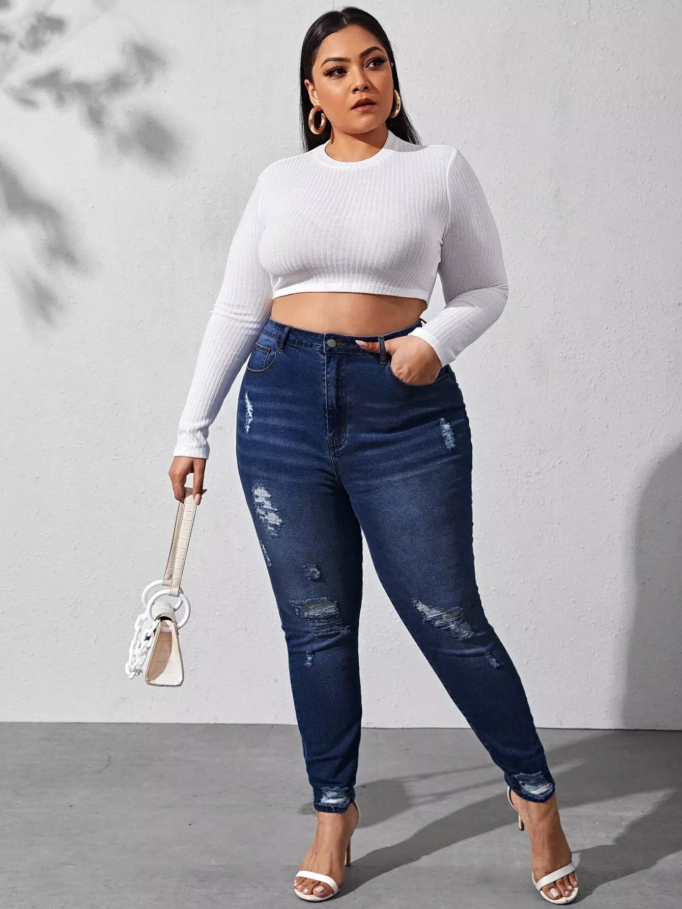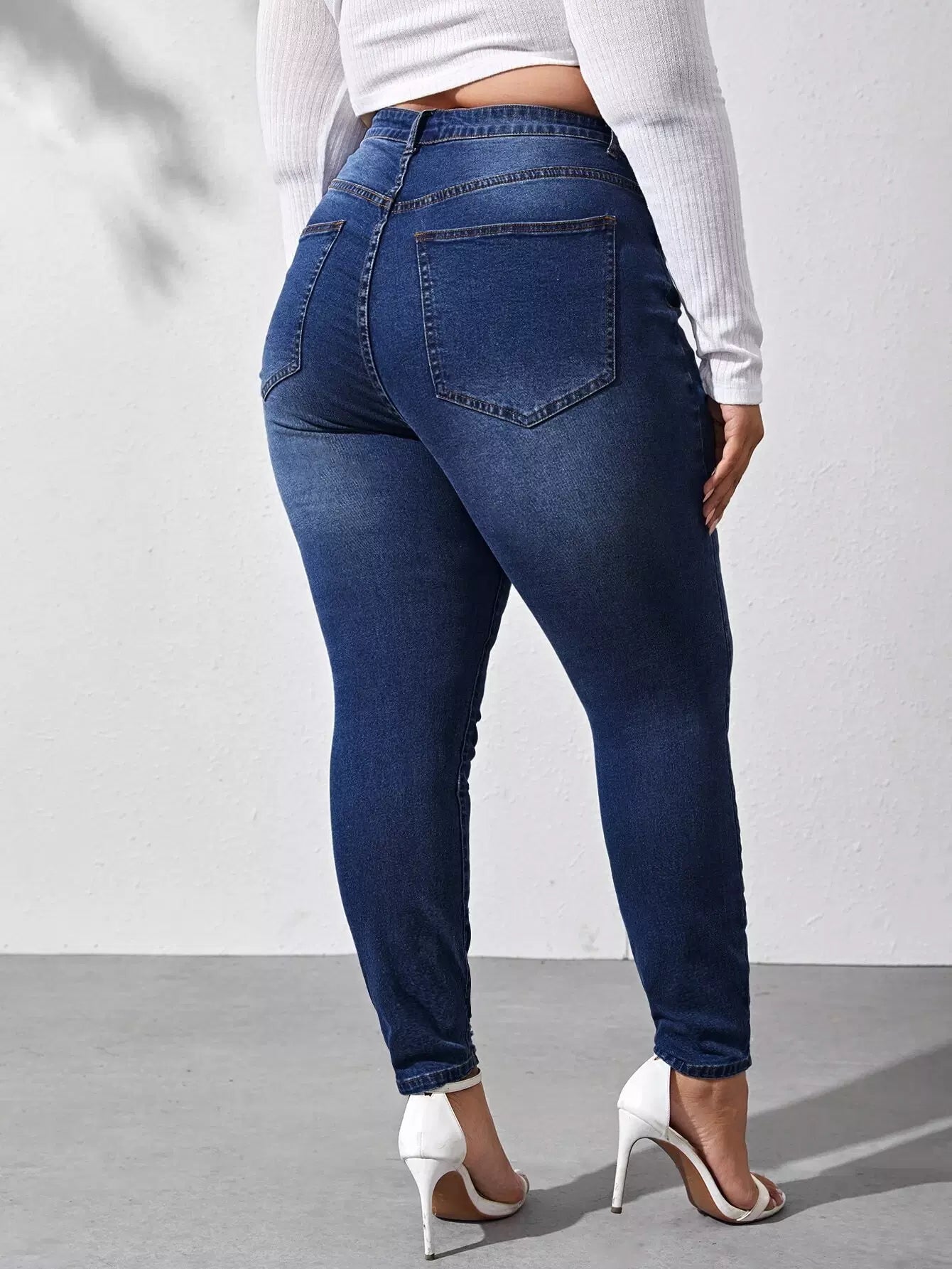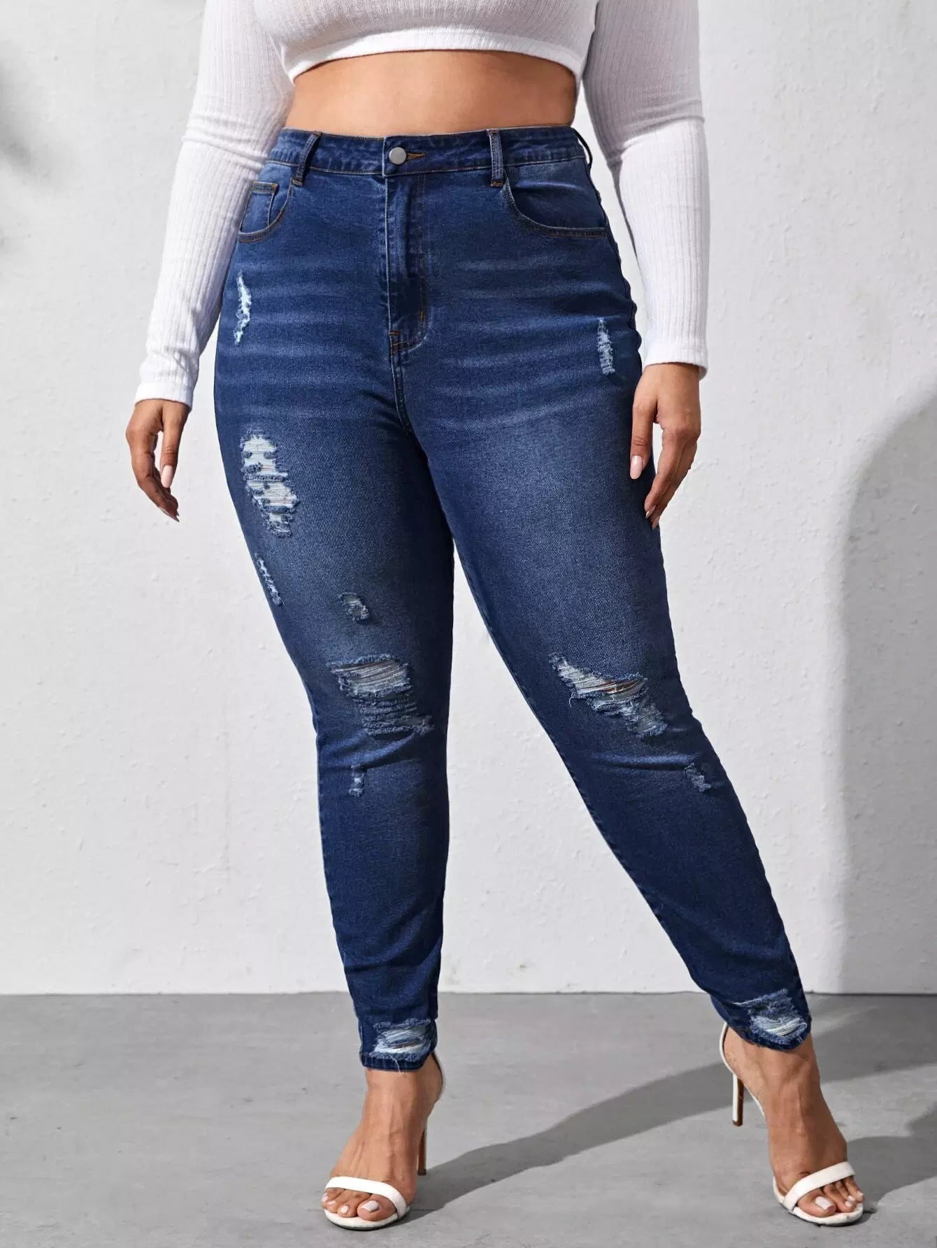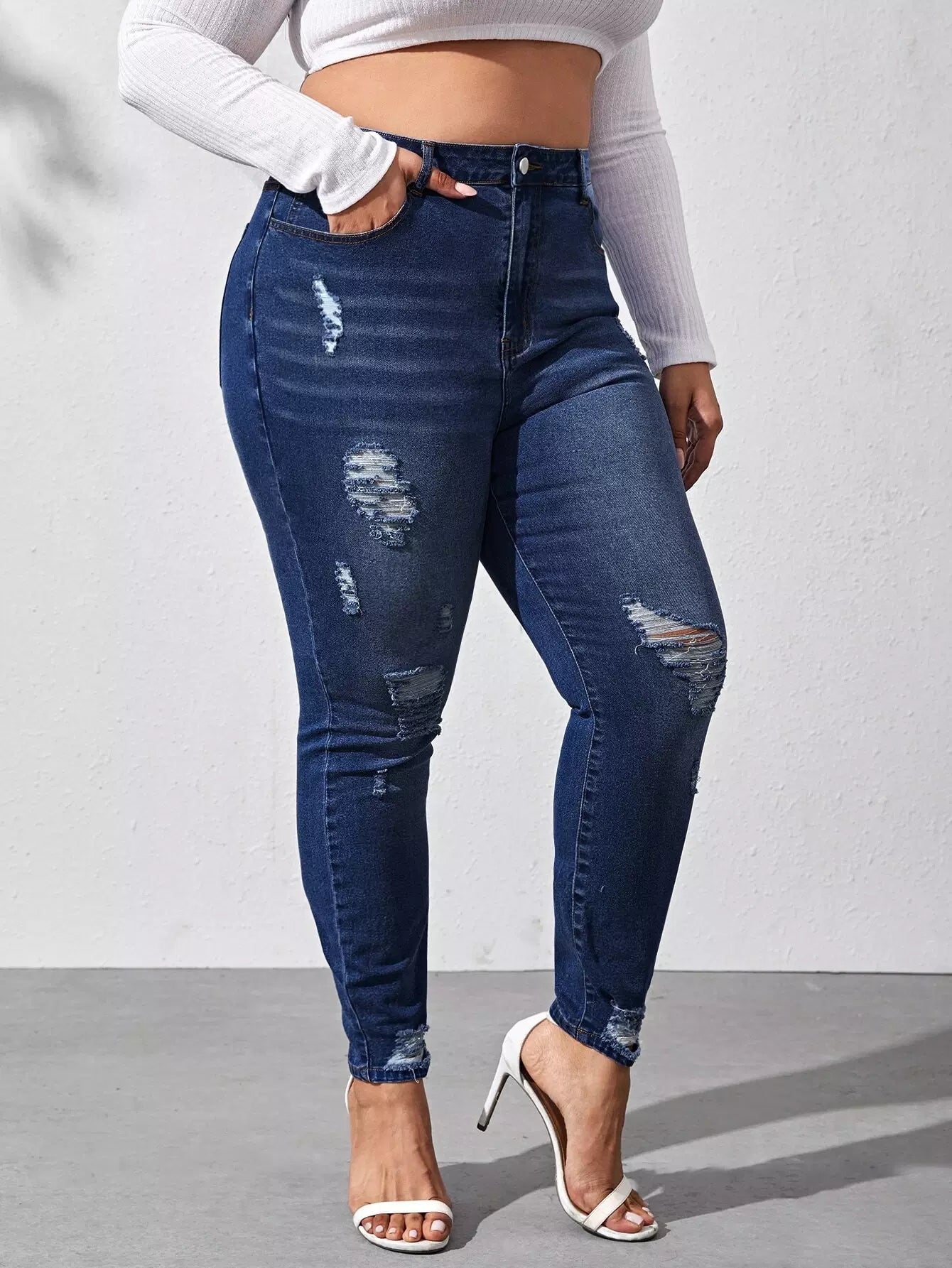 نحيف - مقاس كبير جينز سكيني ممزق بجيب مائل وخصر مرتفع
