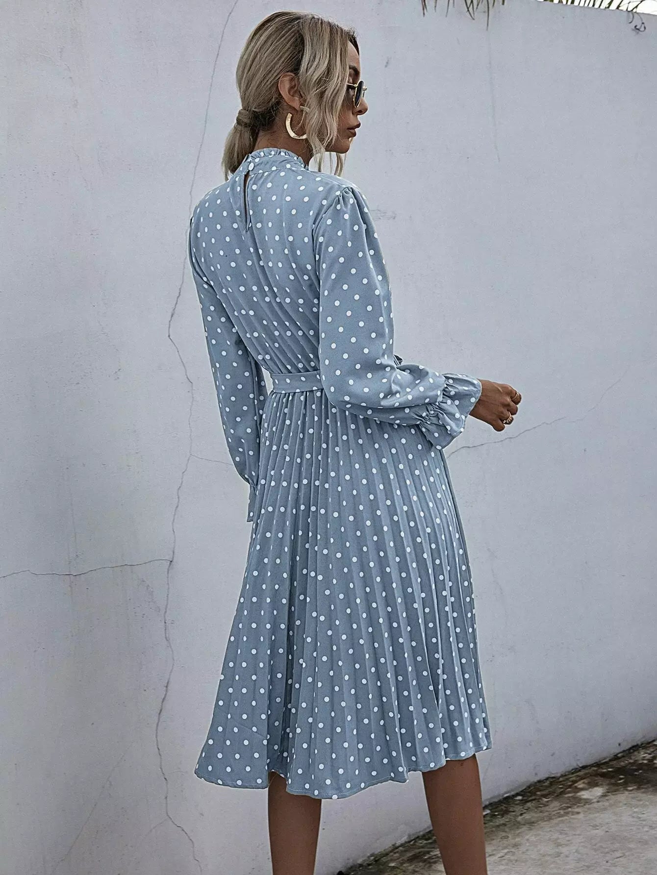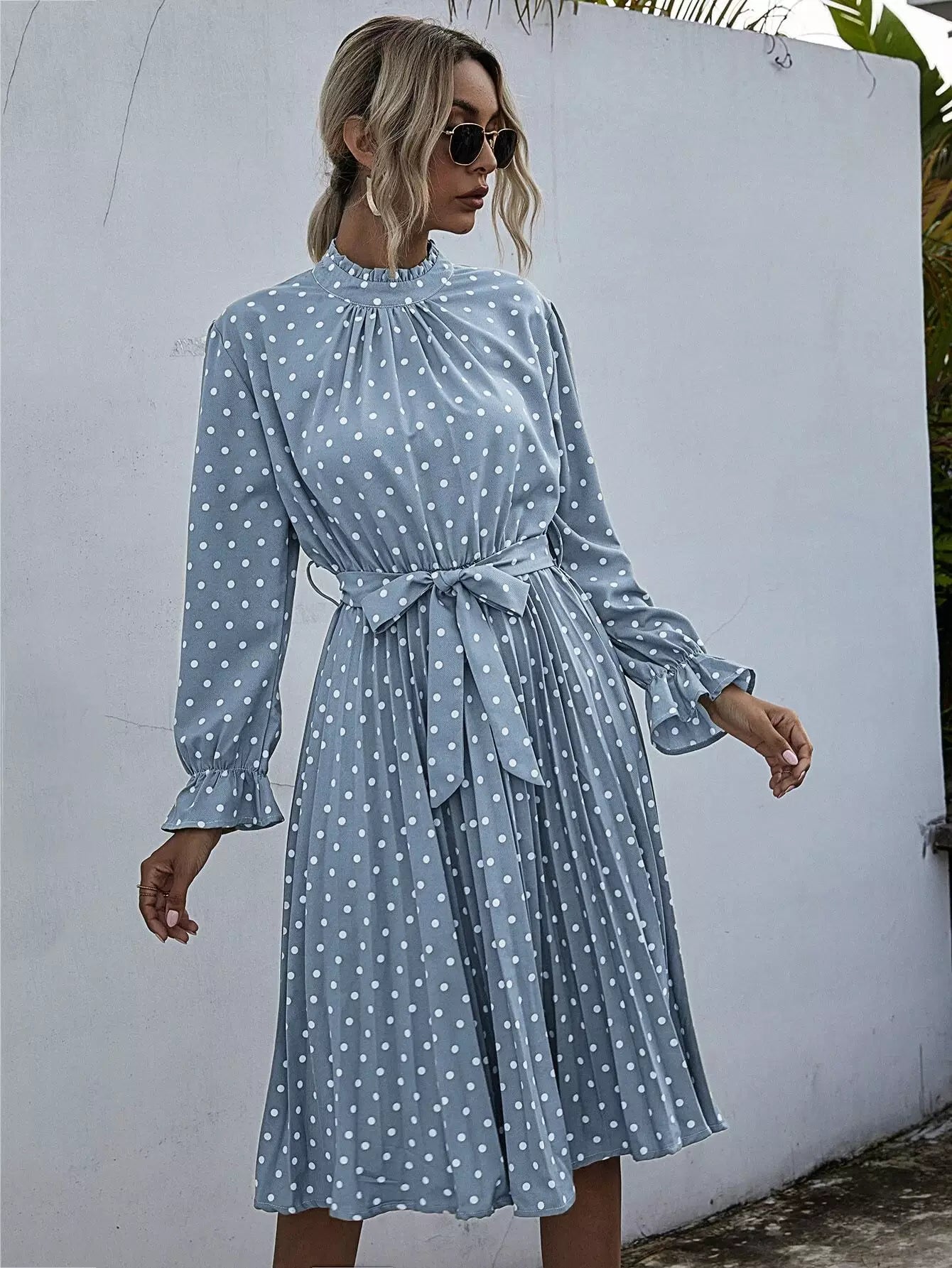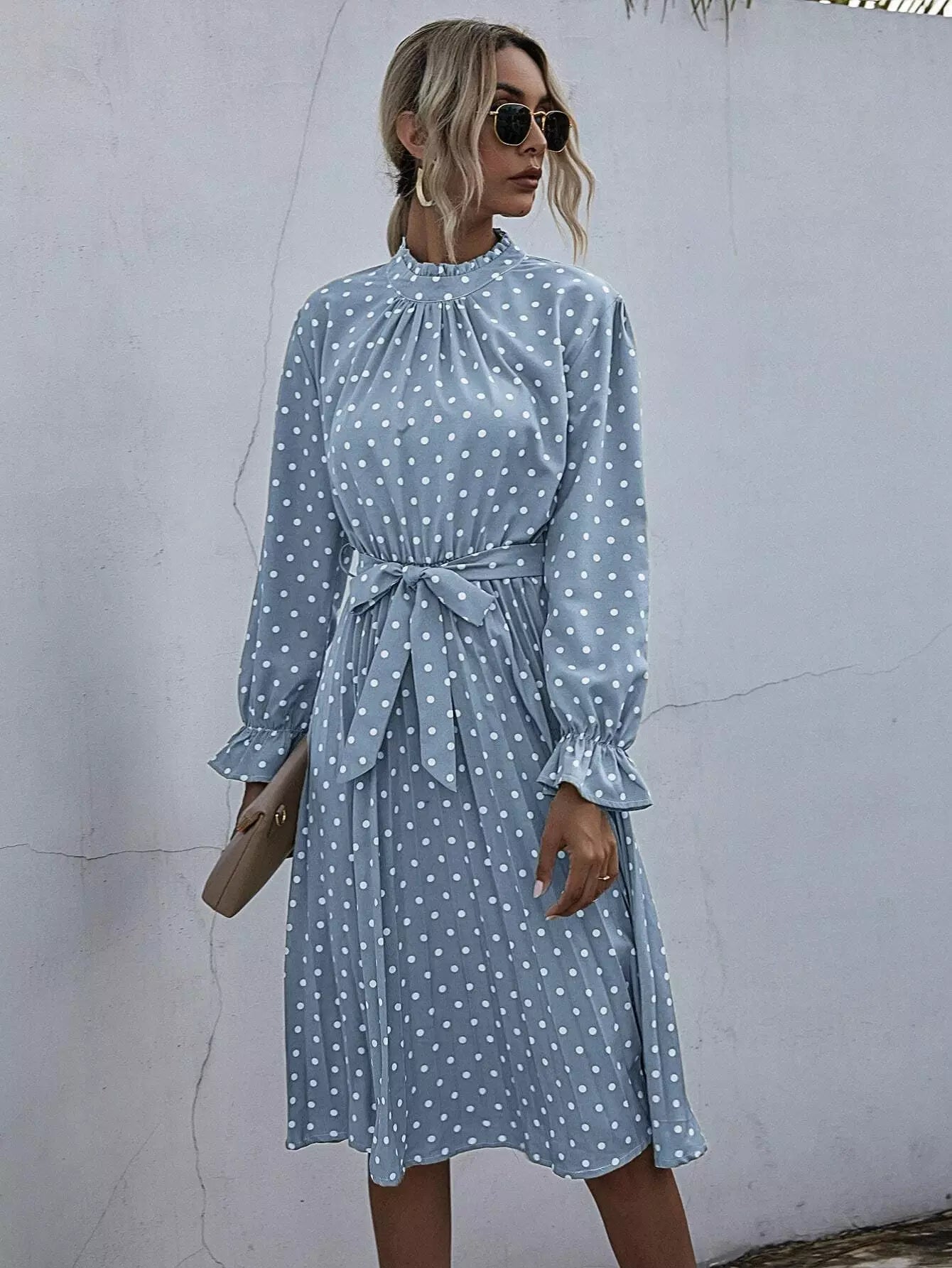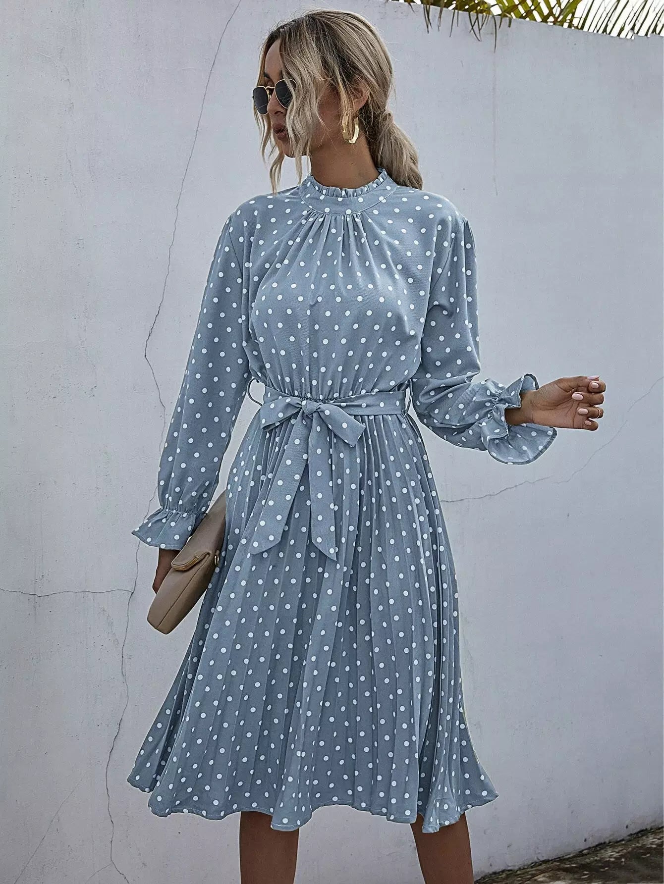 فستان بولكا دوت بكشكشة ورقبة مكشكشة بدون حزام
