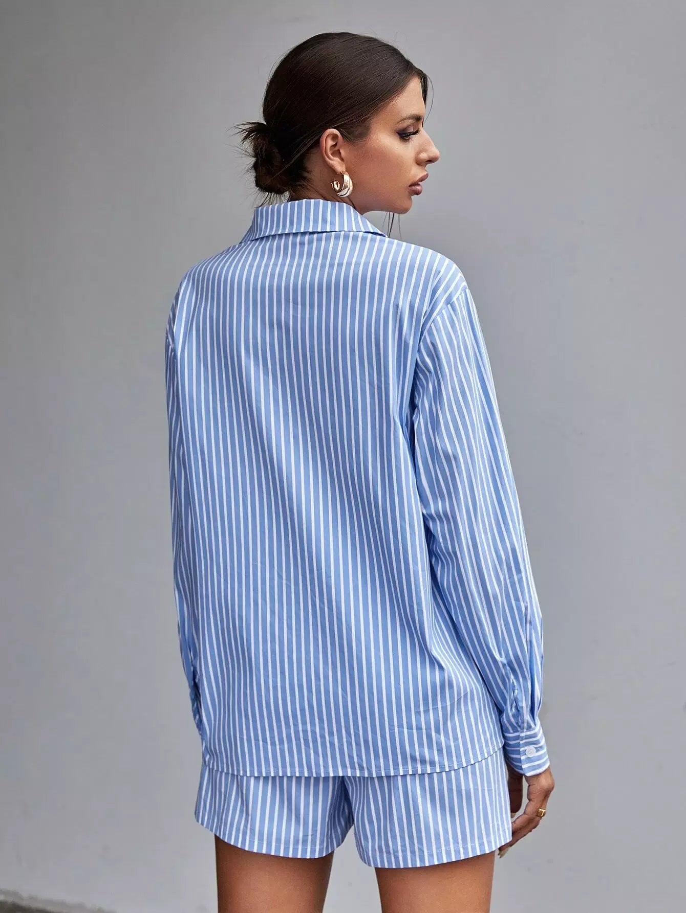 بلوزة مخططة منسدلة الأكتاف وشورت قصير